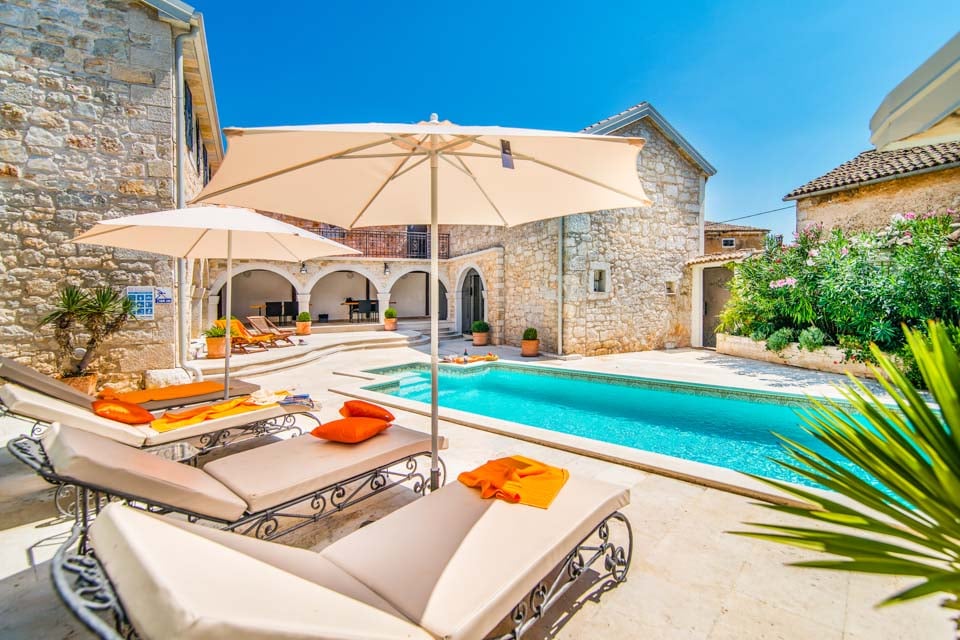 Du kommer att ha svårt att slita dig loss från den överdådiga, solkyssta terrassen, som är privat och avskild tack vare de vitkalkade tegelväggarna. Mosaikpoolen är stjärnattraktionen och inbjuder till ett uppfriskande dopp och den underbara kroatiska solen. Den är fodrad med mjuka solstolar, så hoppa ut och torka dig i värmen medan du solar dig igenom de disiga eftermiddagarna. Med ett matbord utomhus och en vacker tegelgrill serveras middagen bäst utomhus i den varma, friska luften.
