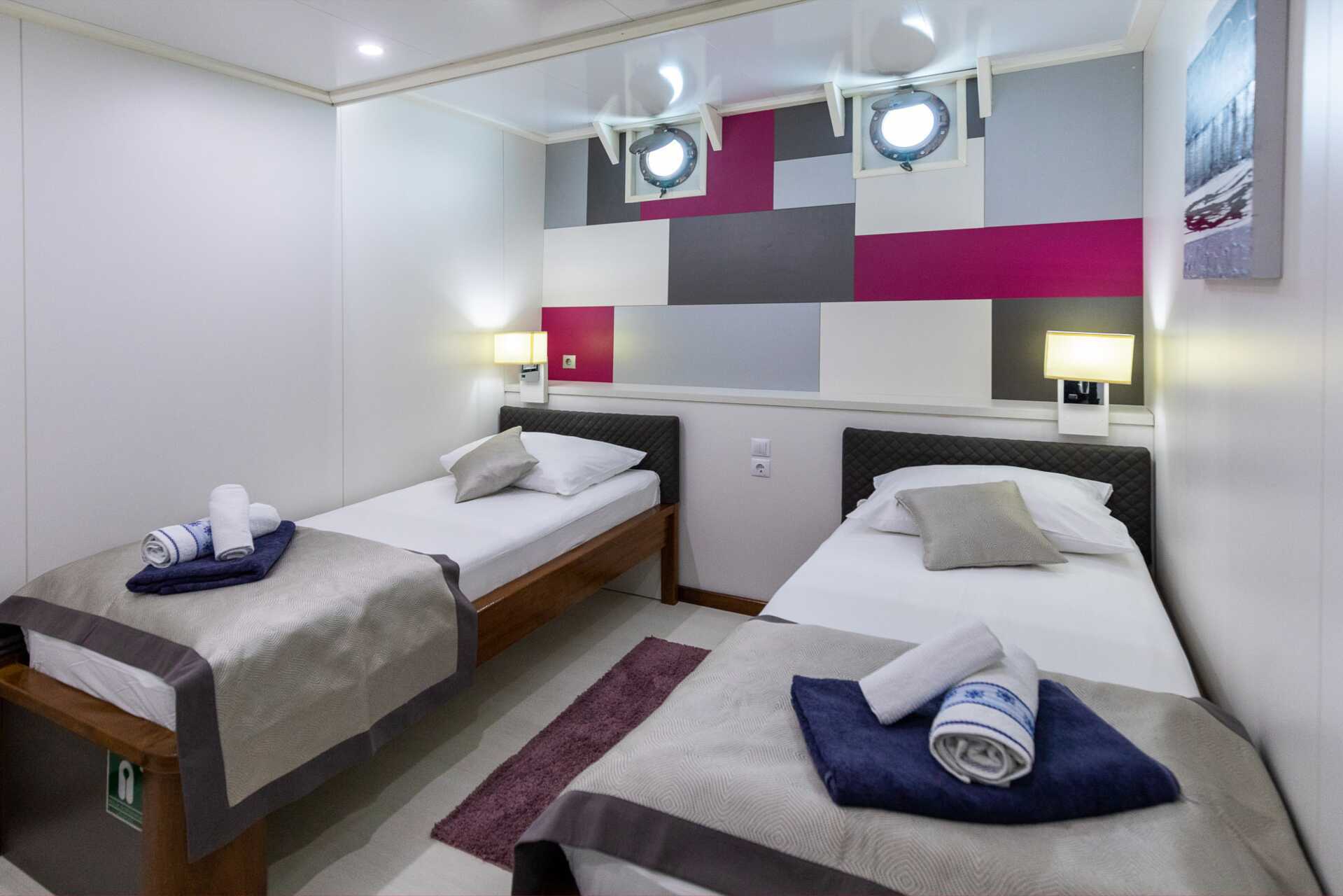 Det finns 18–21 hytter ombord, alla med antingen en dubbelsäng eller två enkelsängar. Tv med internationella kanaler. 220 Volt. Luftkonditionering och liten deponeringsbox ingår. Hårtork. Moderna badrum med dusch och toalett. Garderob och bagageutrymme under sängen. Hytterna varierar i inredning och storlek, men de är ca 10–15 kvadratmeter i storlek. På däck 2–3 är fönstret lite större än ett ventilfönster. Handdukar och sängkläder byts en gång i mitten av veckan.