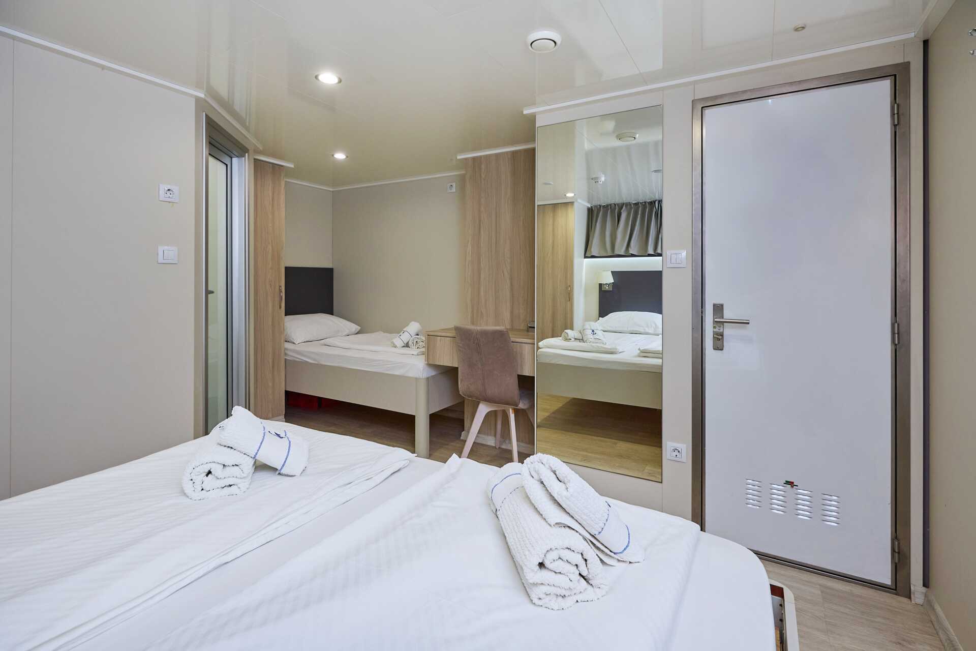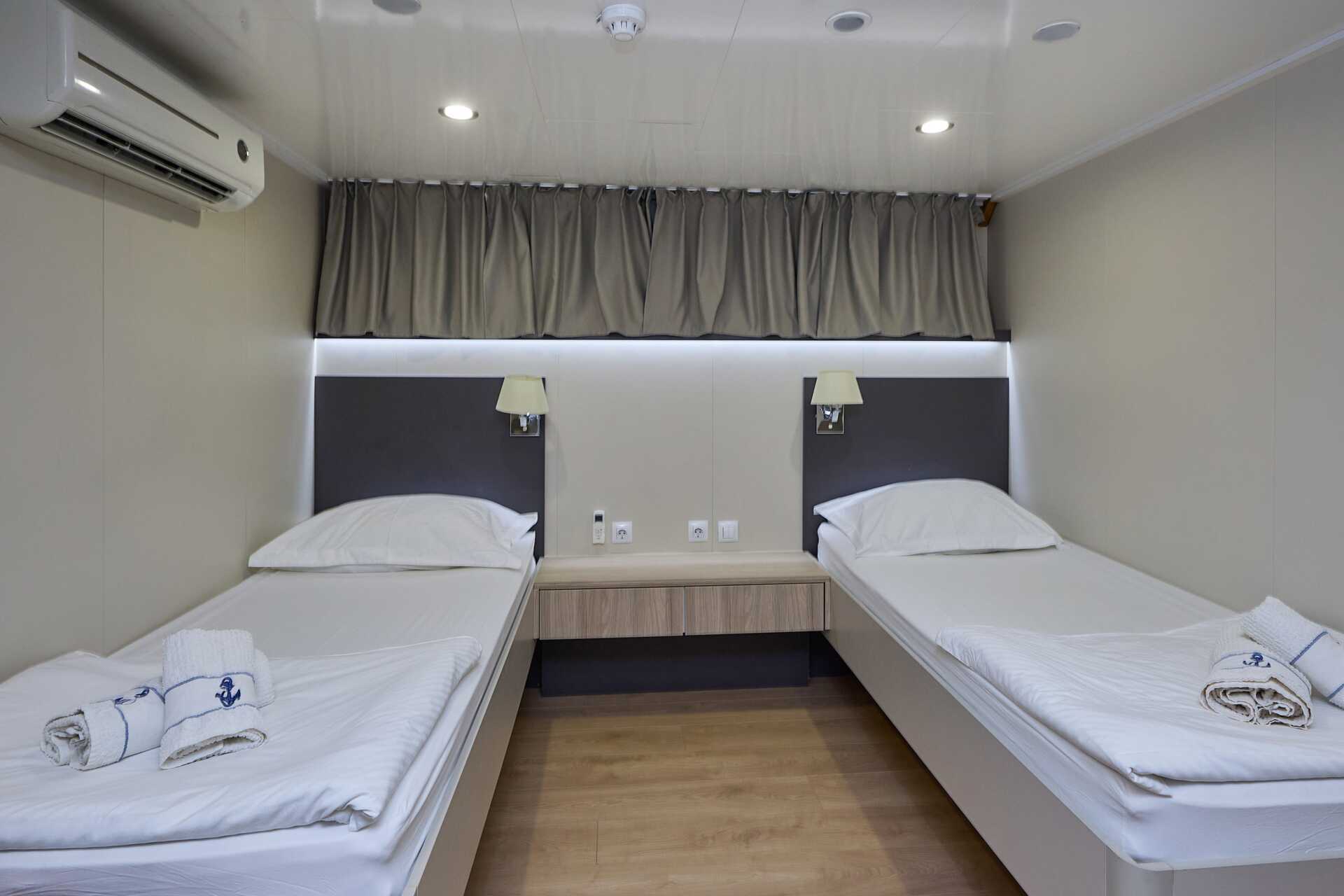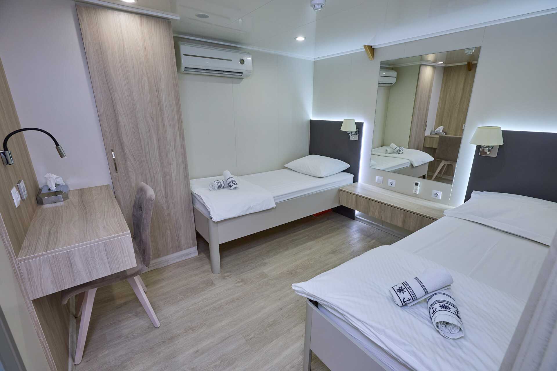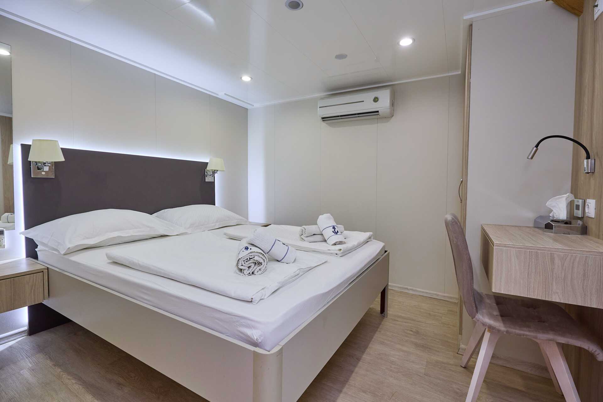 Standardhytt, däck 2. Hytterna varierar i inredning och storlek. En dubbelsäng eller två enkelsängar. Wifi och luftkonditionering ingår. Deponering mot avgift. Dusch och wc. Städning 7 ggr/vecka.