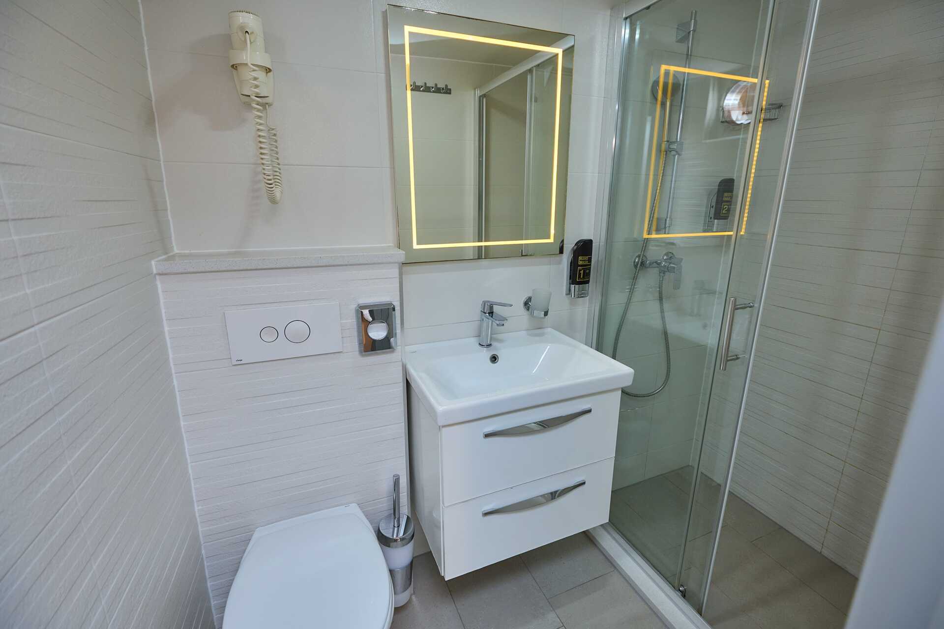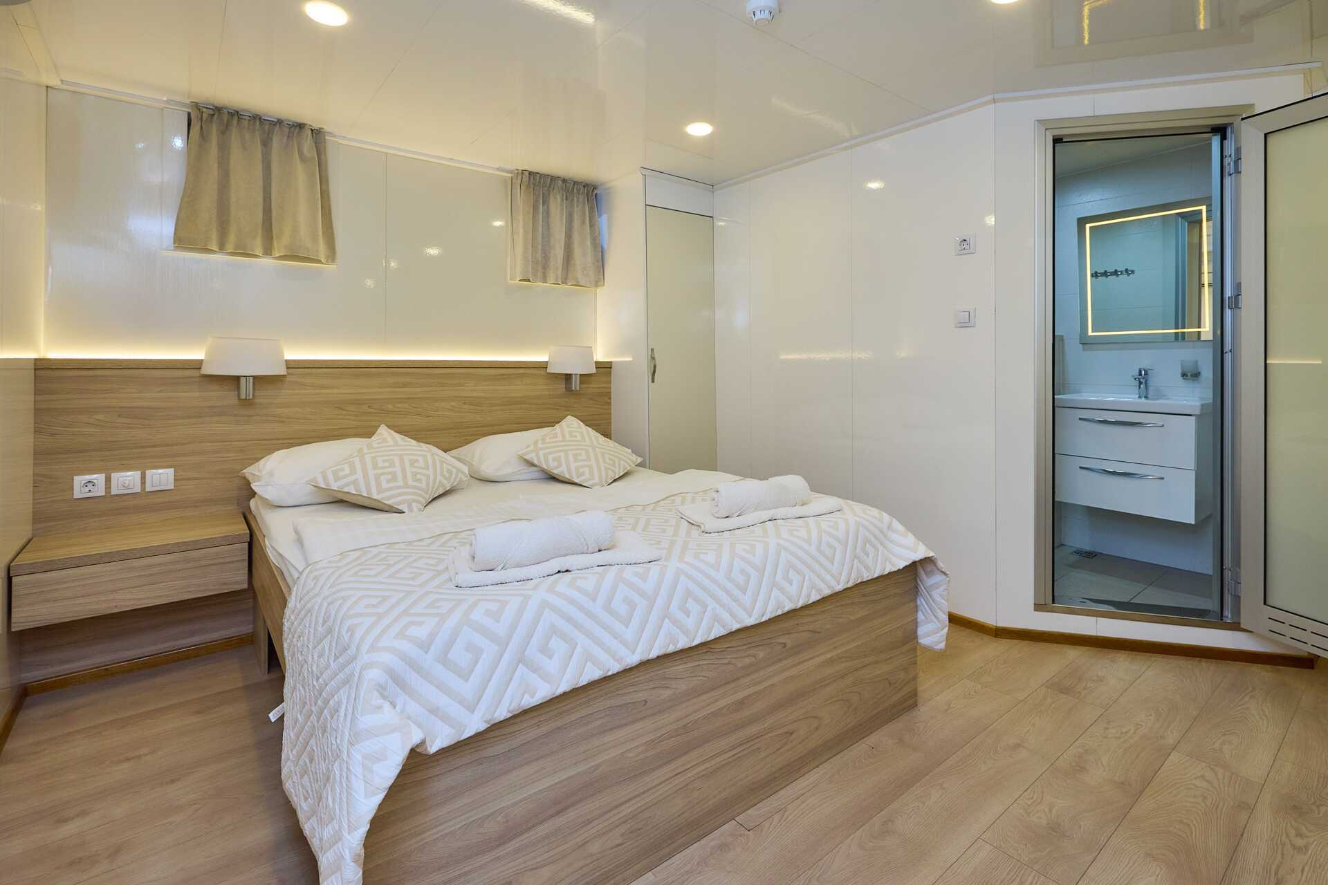 Standardhytt däck 1. Hytterna varierar i inredning och storlek. En dubbelsäng eller två enkelsängar. Möjlighet till extrabädd i enkelsäng. Wifi och luftkonditionering ingår. Deponering mot avgift. Dusch och wc. Städning 7 ggr/vecka.
