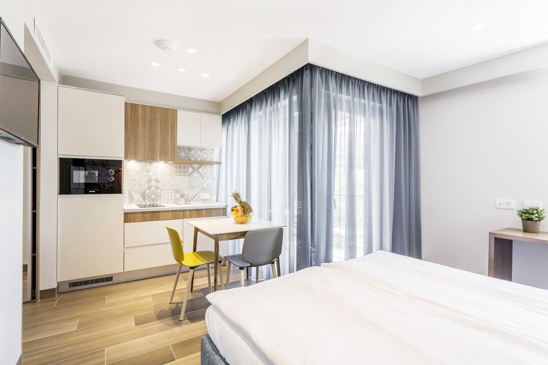 Mindre, tvårumslägenheter med balkong eller markterrass. Ett sovrum och ett kombinerat vardagsrum/minikök. En dubbelsäng. Möjlighet till extrabädd i bäddfåtölj. Wifi, luftkonditionering och deponering ingår. Minikök med kokplattor, kylskåp, vattenkokare och enkel köksutrustning. Tv med interntionella kanaler. Hårtork. Badrum med dusch och wc. Städning 6 ggr/vecka.