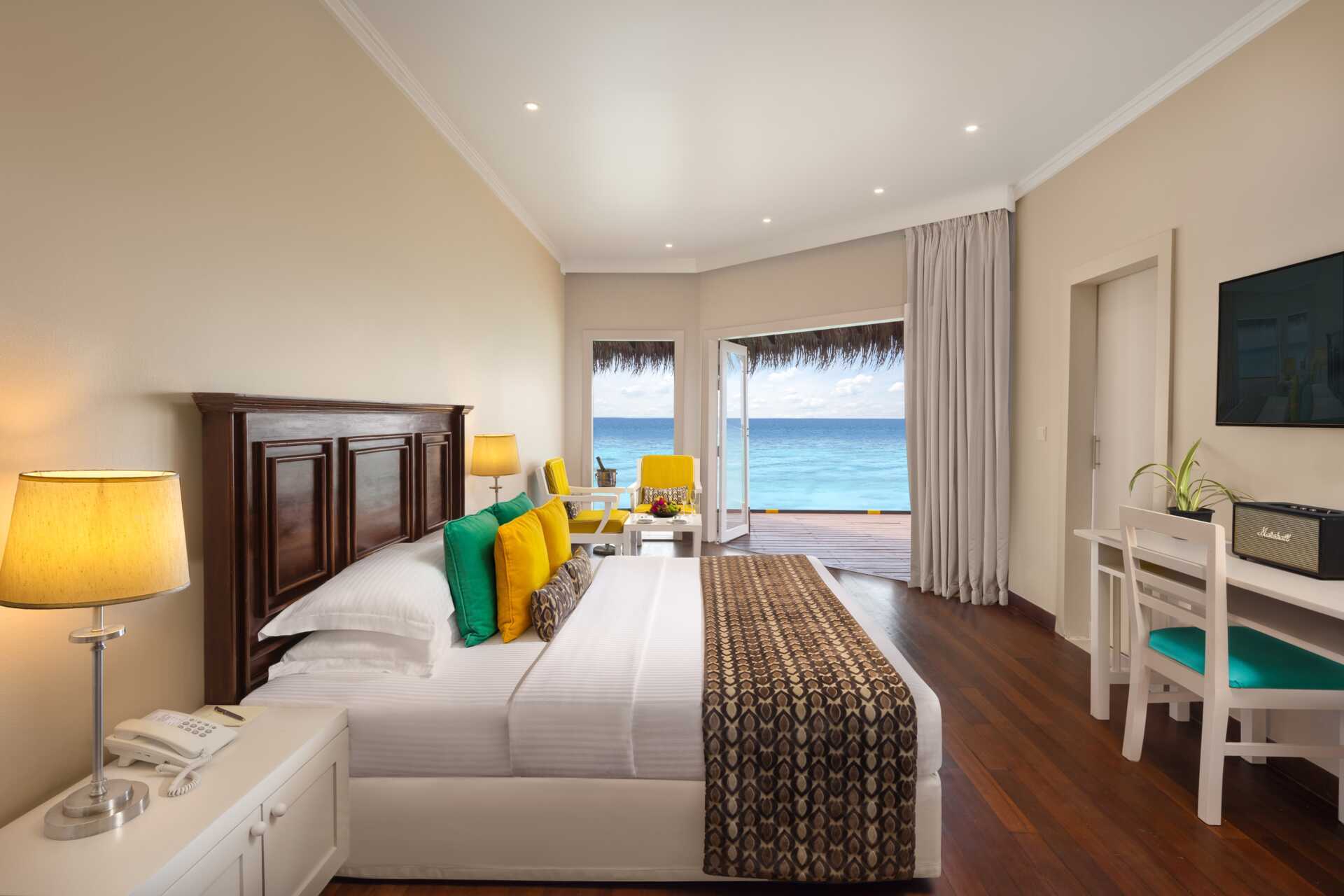 Water villa med soldäck, solstolar och stege direkt ner i Indiska oceanen. En dubbelsäng. Möjlighet till extrabädd för en person. Wifi, luftkonditionering och deponering ingår. Kylskåp. Vattenkokare samt kaffe och te. Tv med internationella kanaler. Hårtork. Badrum med dusch och wc. Städning 7 ggr/vecka.