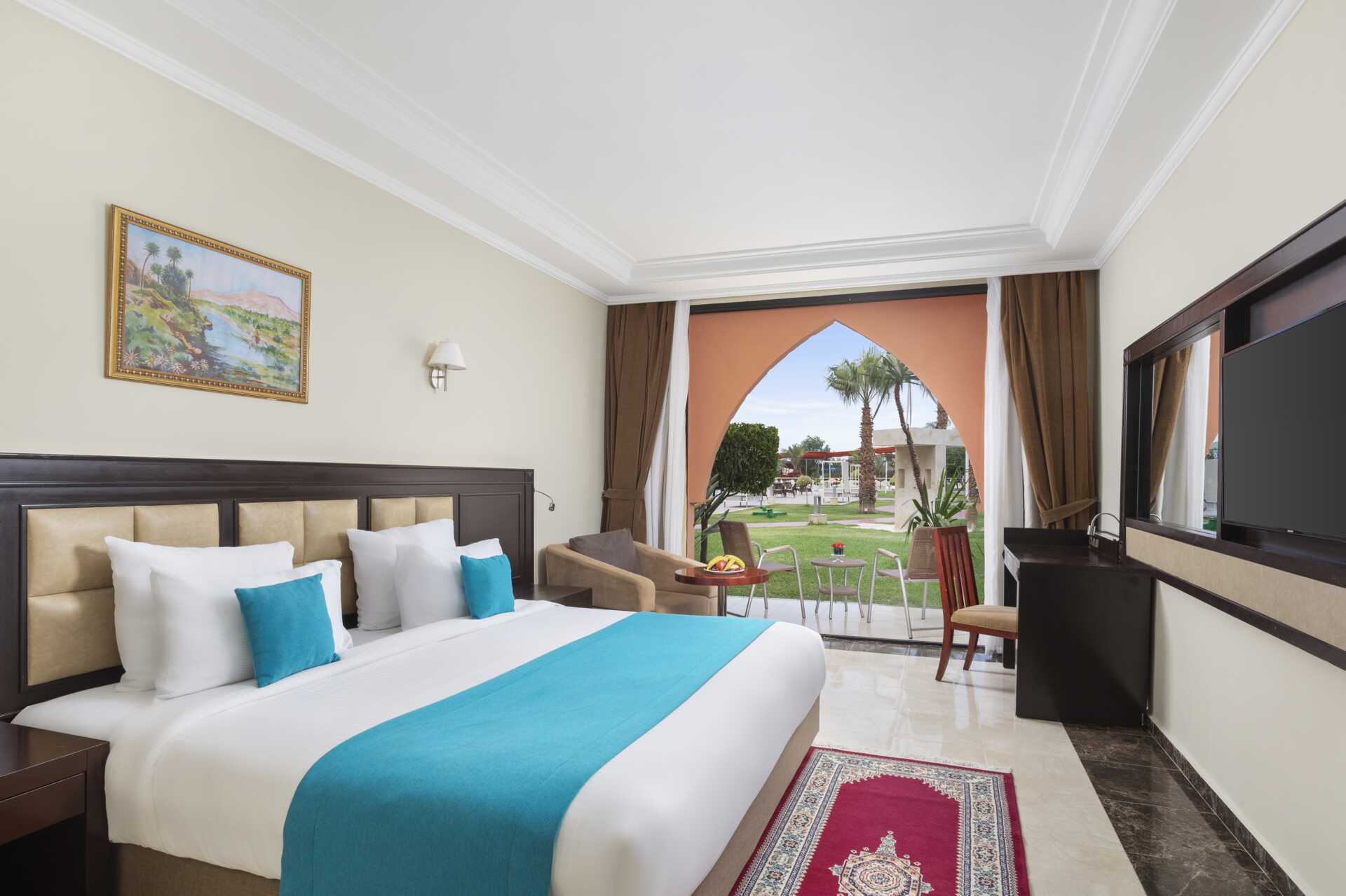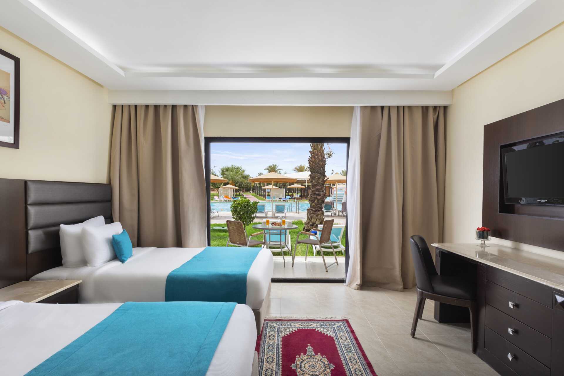 Familjerum med balkong, vissa med poolutsikt. Wifi, luftkonditionering och deponering ingår. Minibar - en flaska vatten ingår och fylls på varje dag. Tv med internationella kanaler. Hårtork. Badrum med dusch och wc. Barn under två år räknas in i maxantalet personer i rummet. Städning 7 ggr/vecka.