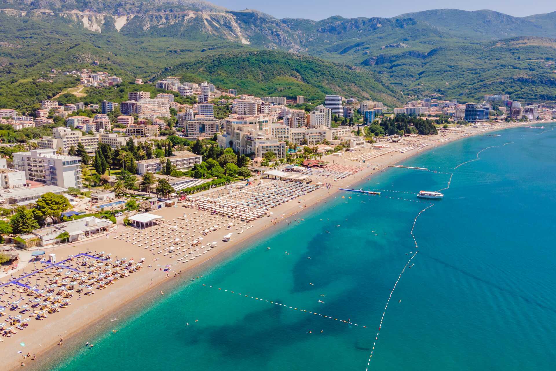 Becici har en lång grovkornig sandstrand, där vissa delar tillhör hotellen. Solstolar och parasoller mot avgift.