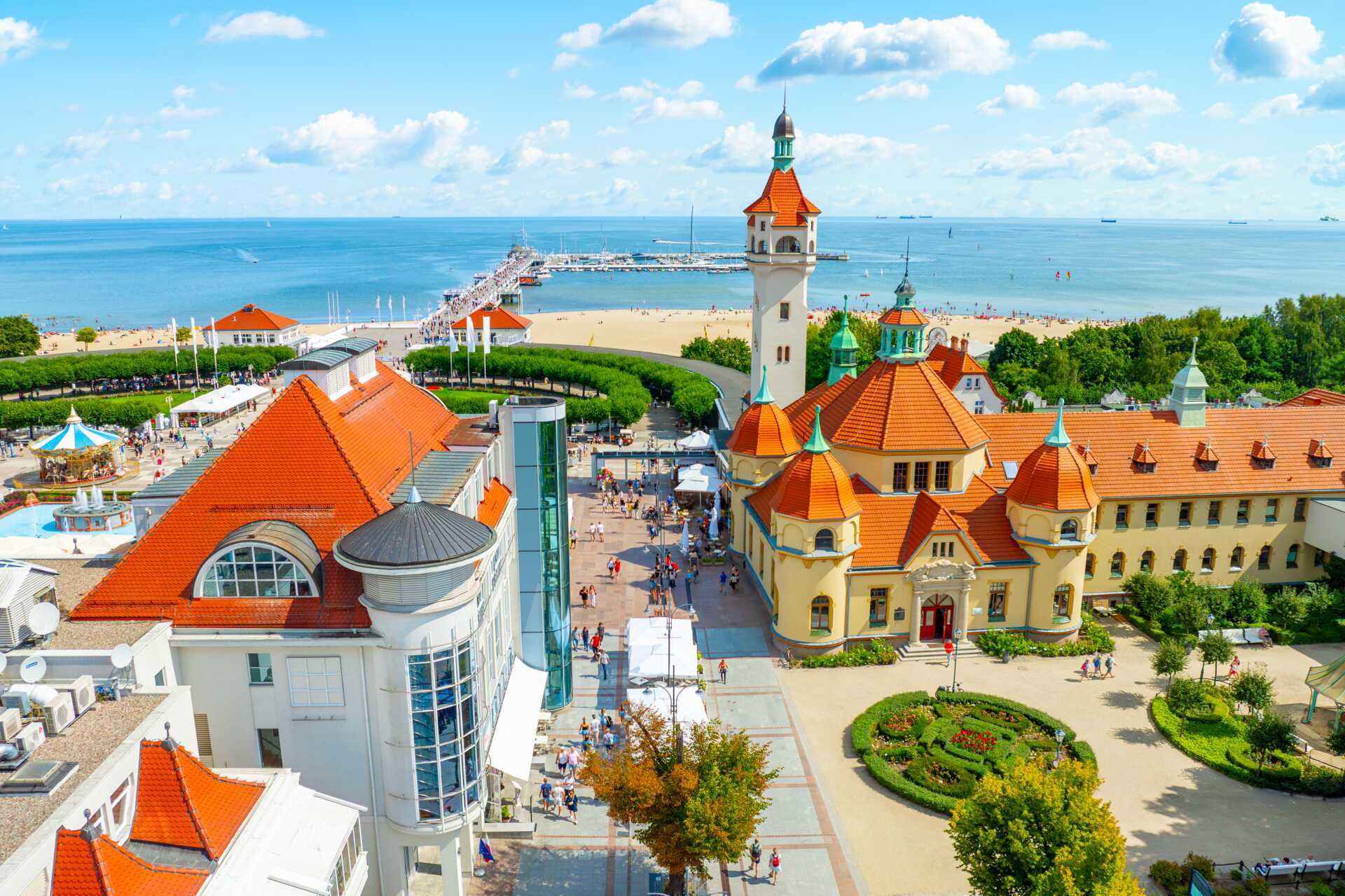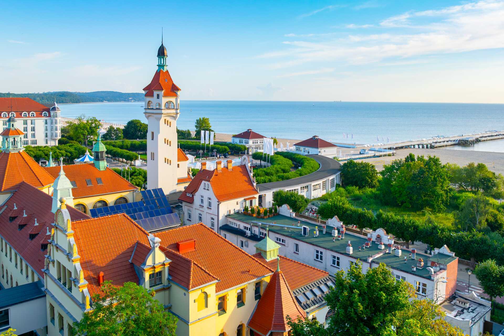 Stranden i Sopot är lång, bred och barnvänlig, med mjuk sand som passar lika bra för häng i solstolen som för sandslott och barfotapromenader längs vattnet. Ta en promenad ut på den klassiska träpiren som sträcker sig rakt ut i havet, unna dig en glass eller stanna till och njut av utsikten. Från stranden är det bara ett stenkast till Sopot centrum, där semesterlivet gärna rullar på från morgon till sen kväll. Längs Monte Cassino samsas caféer, restauranger, barer och små butiker, och tempot är sådär lagom avslappnat. Här är det lika lätt att slå sig ner för en lång lunch som att ta en sen kvällspromenad tillbaka mot havet.