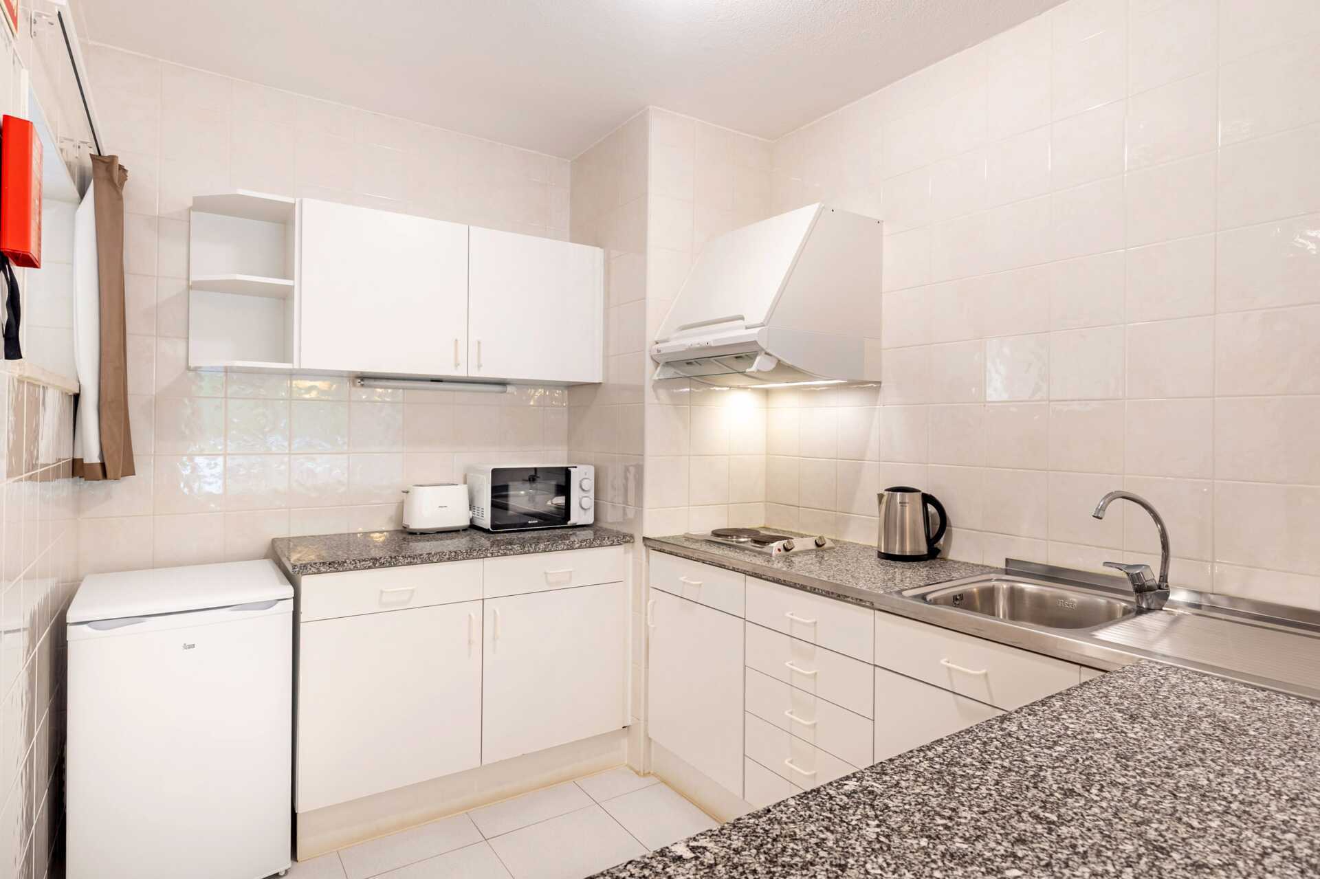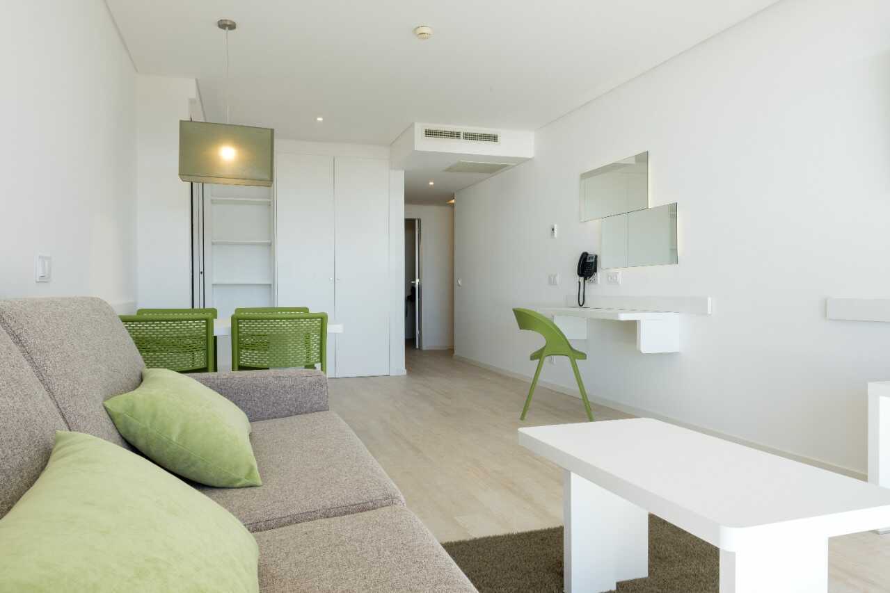 Tvårumslägenhet med balkong. Sovrum och kombinerat vardagsrum med minikök. Två enkelsängar. Möjlighet till extrabäddar i två bäddsoffor. Minikök med kokplattor, kylskåp, vattenkokare, brödrost, mikrovågsugn och enkel köksutrustning. Wifi, luftkonditionering och deponering ingår. Tv med internationella kanaler. Hårtork. Badrum med badkar och wc. Städning 7 ggr/vecka.