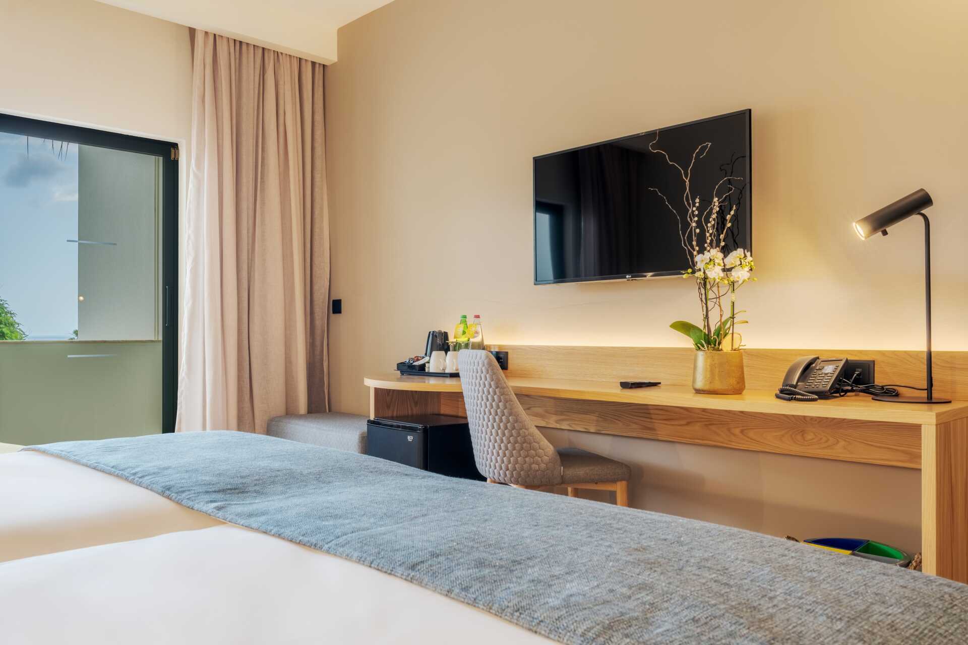 Dubbelrum med balkong eller terrass med begränsad havsutsikt. En dubbelsäng eller två enkelsängar. Möjlighet till extrabädd i enkelsäng. Kuddmeny. Wifi, luftkonditionering och deponering ingår. Kylskåp. Vattenkokare samt kaffe och te. Tv med internationella kanaler. Hårtork. Badrum med dusch och wc. Städning 7 ggr/vecka.
