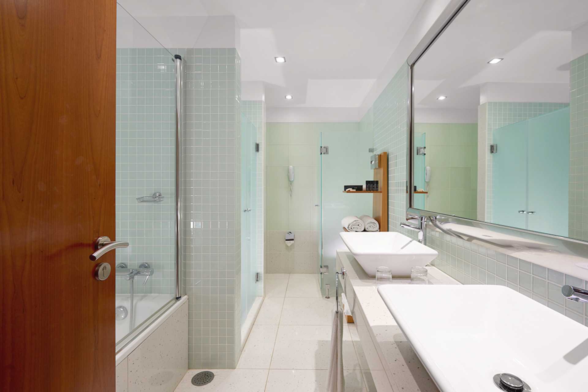 Dubbelrum för 1-2 personer (ca 34 kvadratmeter) med balkong eller terrass, vissa med begränsad havsutsikt. Dubbelrum för 1-3 personer (ca 44 kvadratmeter) med balkong eller terrass och havsutsikt. En dubbelsäng eller två enkelsängar. I de större rummen finns möjlighet till extrabädd för en person. Wifi, luftkonditionering och deponering ingår. Minibar. Vattenkokare samt kaffe och te. Tv med internationella kanaler. Hårtork. Alla badrum har wc och dusch, de större rummen har också badkar. Städning 7 ggr/vecka. Barn under två år räknas in i maxantalet personer i rummet.