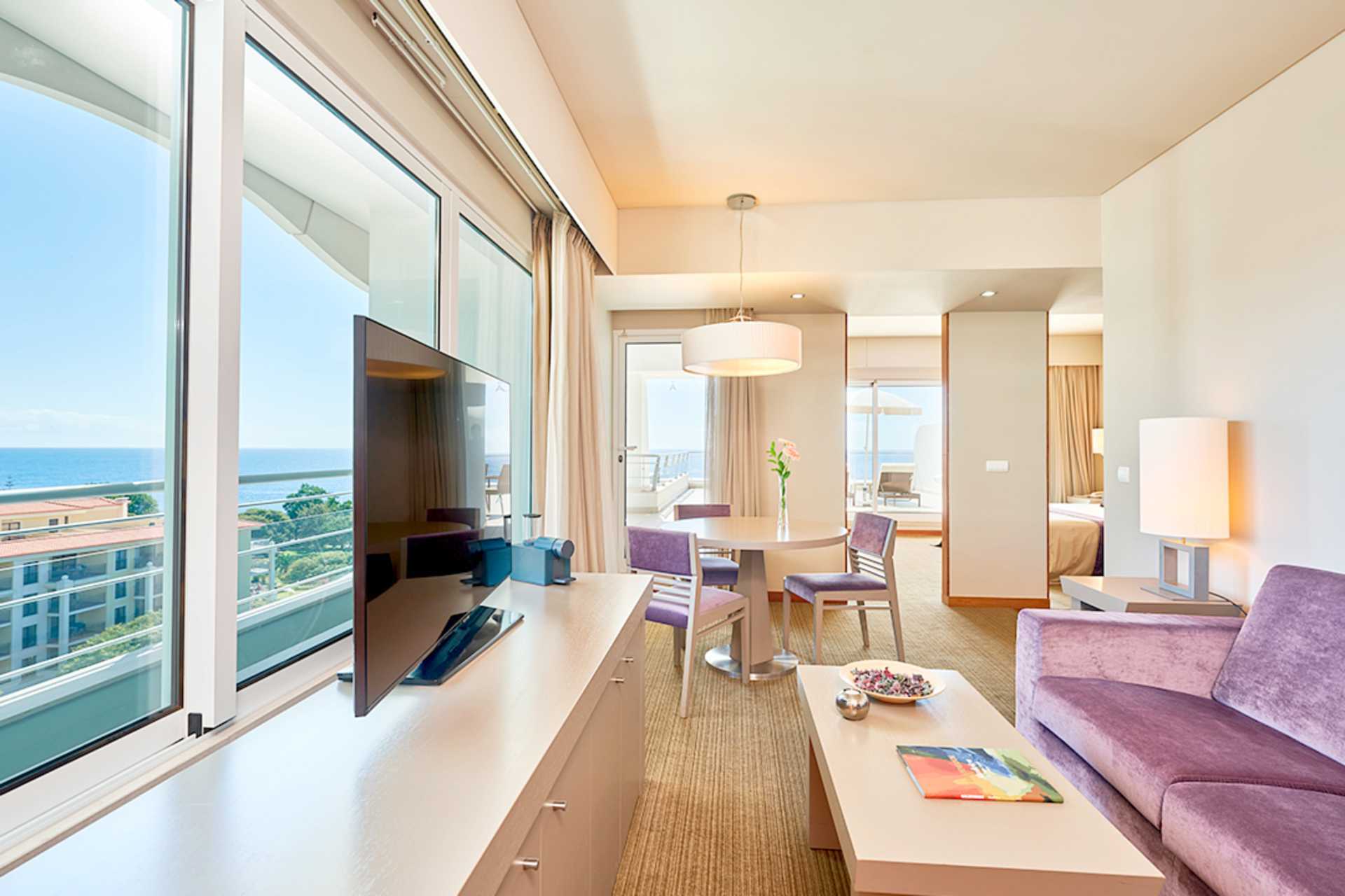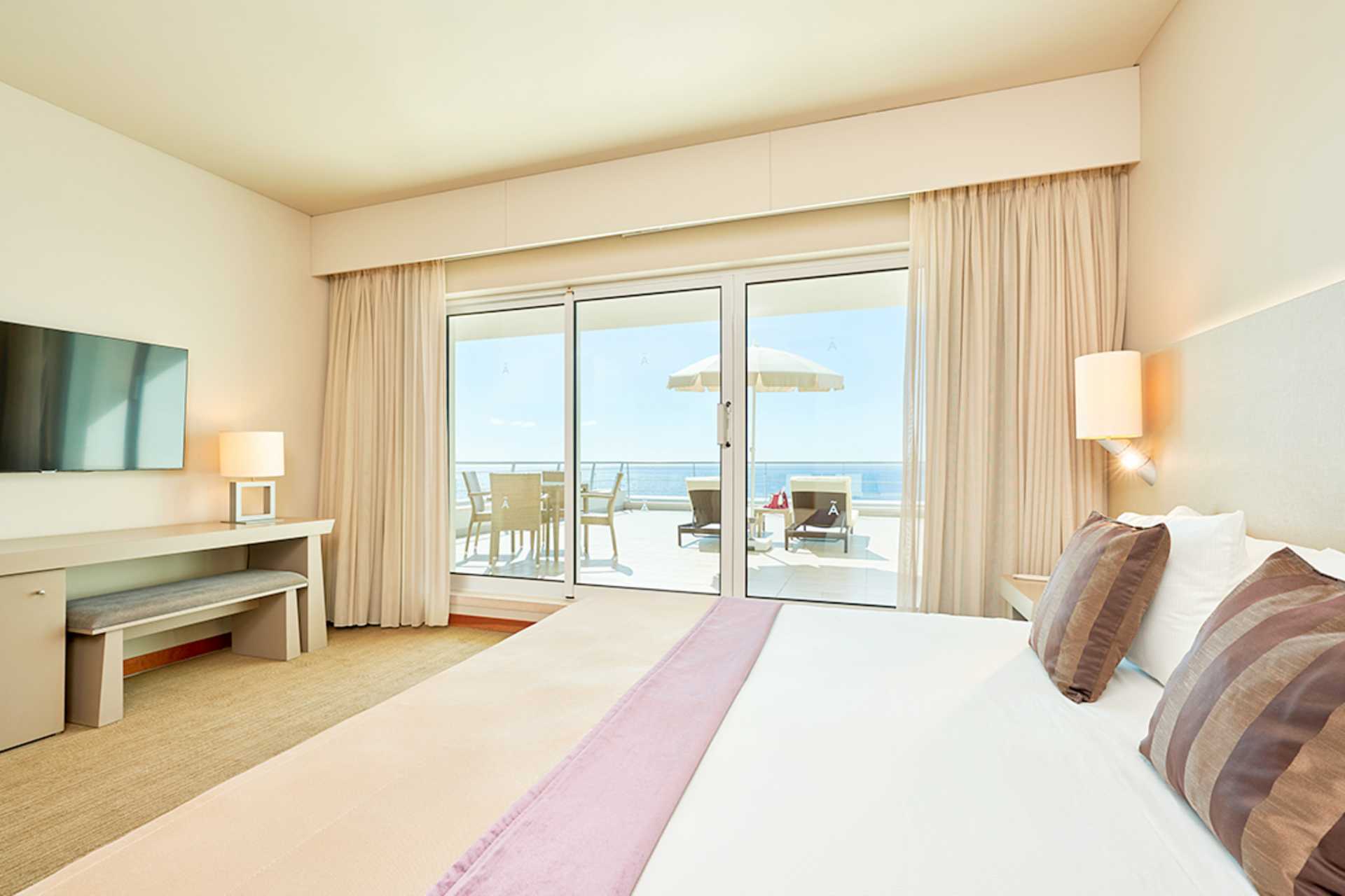Svit med balkong eller terrass och havsutsikt. Sviten består av ett sovrum, ett vardagsrum med minikök samt en stor terrass (32 kvadratmeter) med solstolar, stolar och bord. En dubbelsäng eller två enkelsängar. Möjlighet till extrabädd i bäddsoffa. Heltäckningsmatta. Minikök med mikrovågsugn, spis, kylskåp, kaffemaskin, vattenkokare med kaffe och te samt enkel köksutrustning. Wifi, luftkonditionering och deponering ingår. Tv med internationella kanaler. Hårtork. Badrum med badkar, separat dusch och wc. Städning 7 ggr/vecka. Barn under två år räknas in i maxantalet personer i rummet.