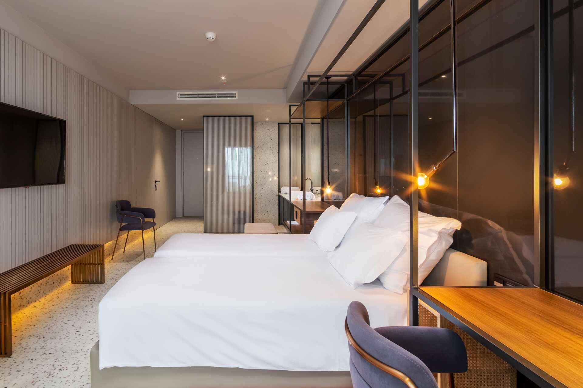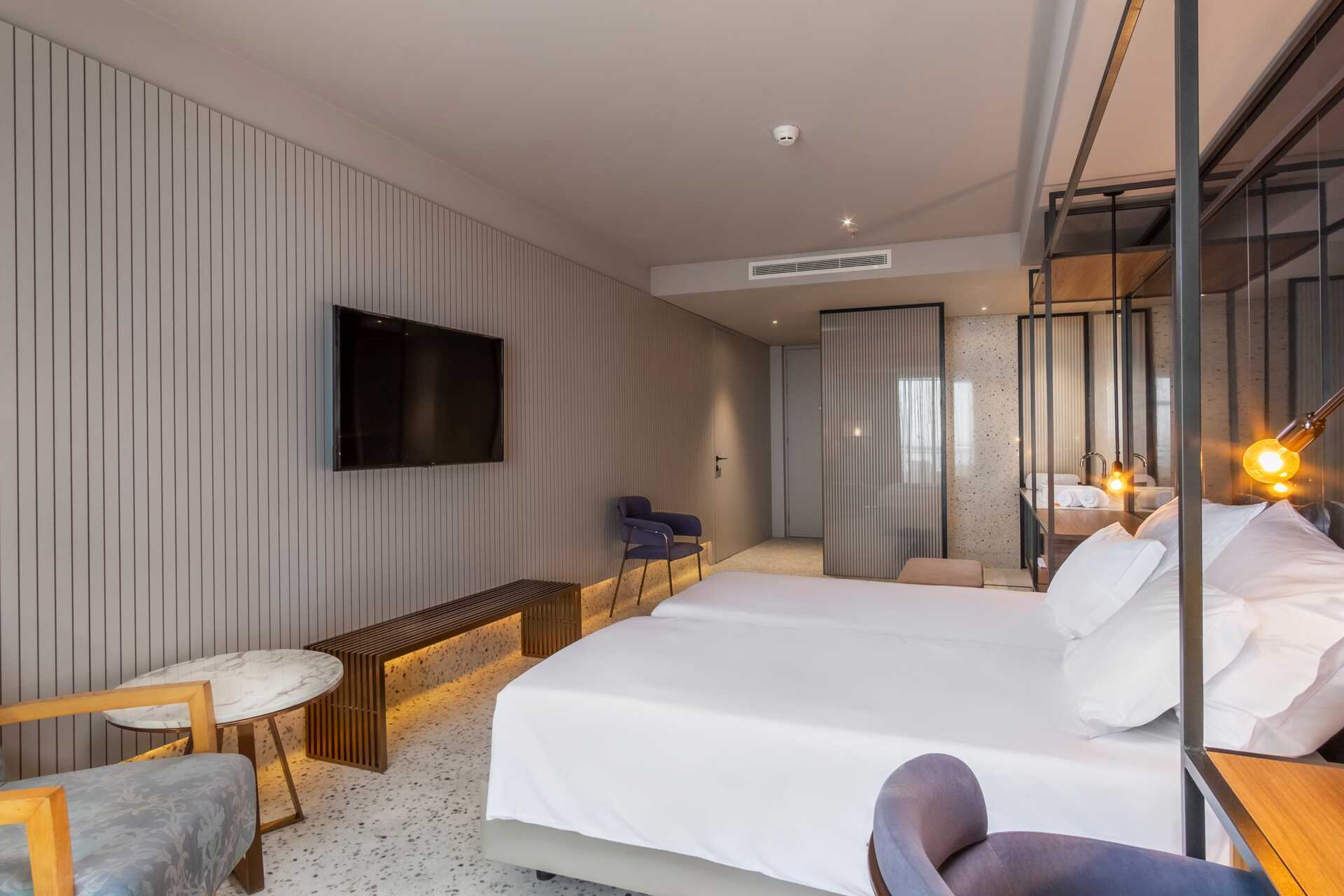 Dubbelrum med balkong. En dubbelsäng eller enkelsängar. Wifi och luftkonditionering ingår. Deponering mot avgift. Minibar. Vattenkokare samt kaffe och te. Tv med internationella kanaler. Hårtork. Badrum med dusch och wc. Städning 7 ggr/vecka. Barn under två år räknas in i max antal personer i rummet.