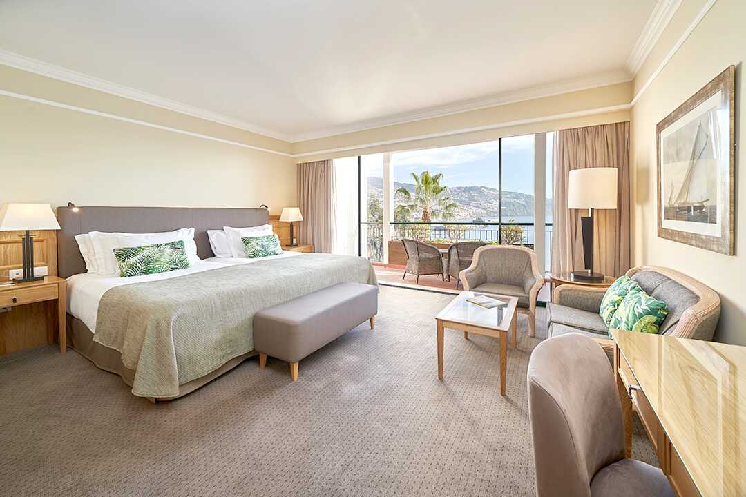 Deluxerum med balkong och havsutsikt. Deluxerummen ligger på våning 1 till 5 med utsikt mot Funchal stad, hamnen och havet. Två breda enkelsängar eller en dubbelsäng. Möjlighet till extrabädd i befintliga sängar eller i enkelsäng. Wifi, luftkonditionering, deponering ingår. Heltäckningsmatta. Minibar. Vattenkokare samt kaffe och te. Nespressomaskin. Tv med internationella kanaler. Badrockar och tofflor. Hårtork. Badrum med badkar, separat dusch samt wc. Städning 7 ggr/vecka. Barn under två år räknas in i max antal personer i rummet.