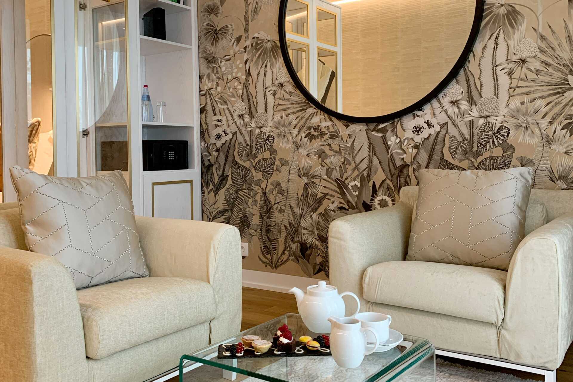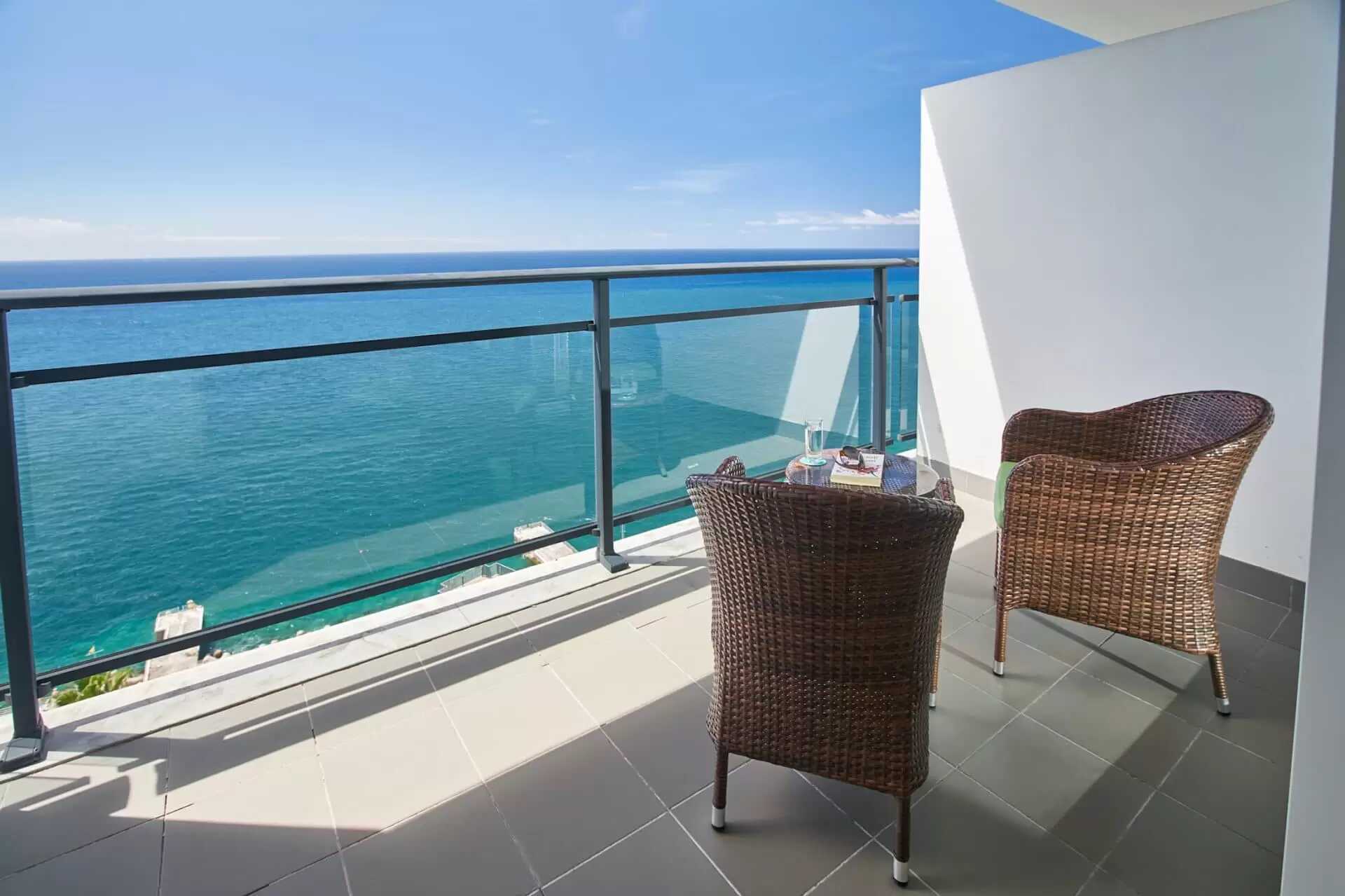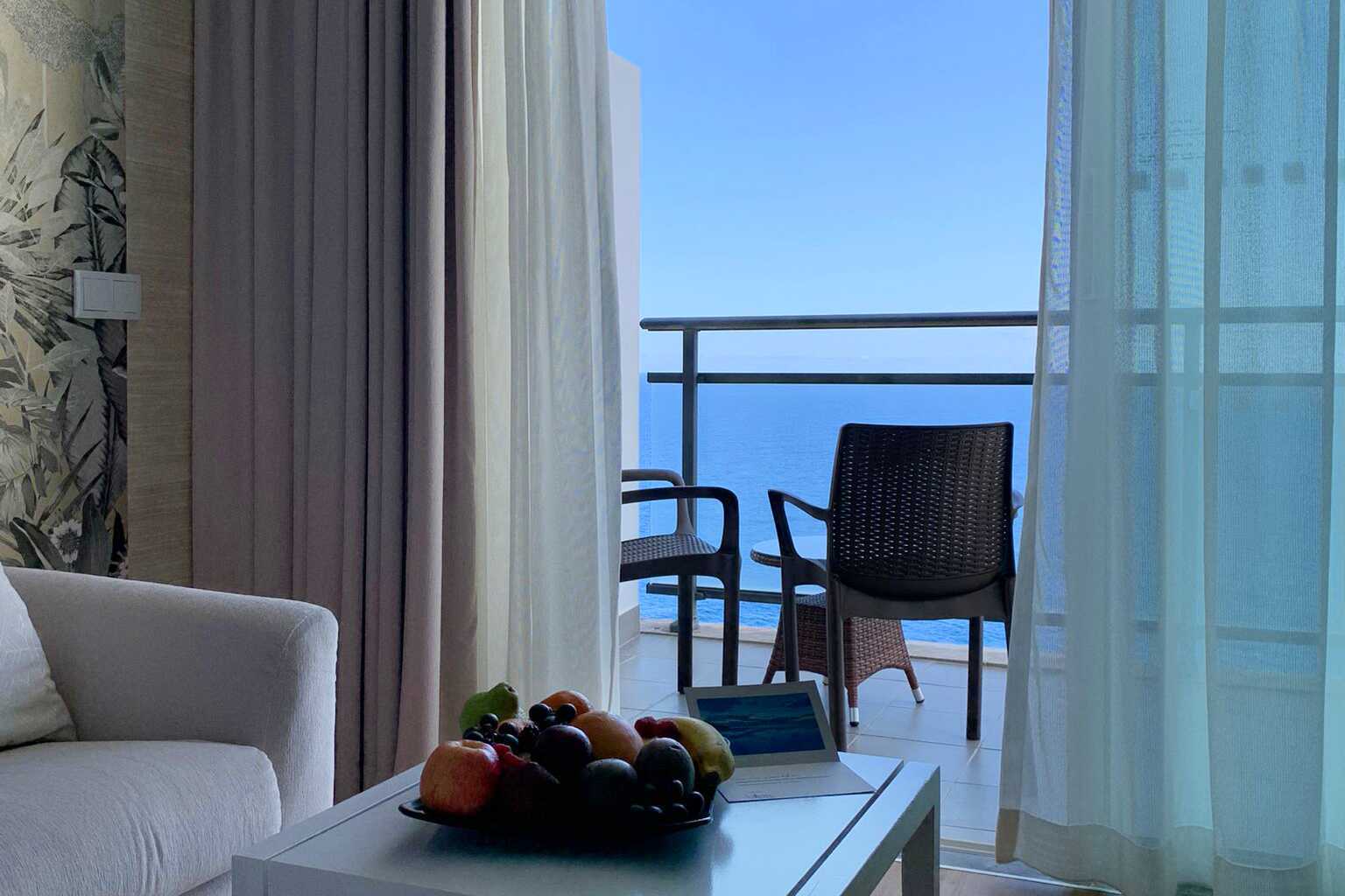 Svit med balkong och havsutsikt. Sviten består av ett sovrum med en dubbelsäng och ett vardagsrum med sittgrupp. Sviterna är belägna på våning 9-10. Wifi, luftkonditionering och deponering ingår. Kylskåp. Vattenkokare samt kaffe och te. Tv med internationella kanaler. Badrockar och tofflor. Hårtork. Badrum med badkar och wc. Städning 7 ggr/vecka. Barn under två år räknas in i max antal personer i sviten. Rökning är ej tillåtet på balkongen.