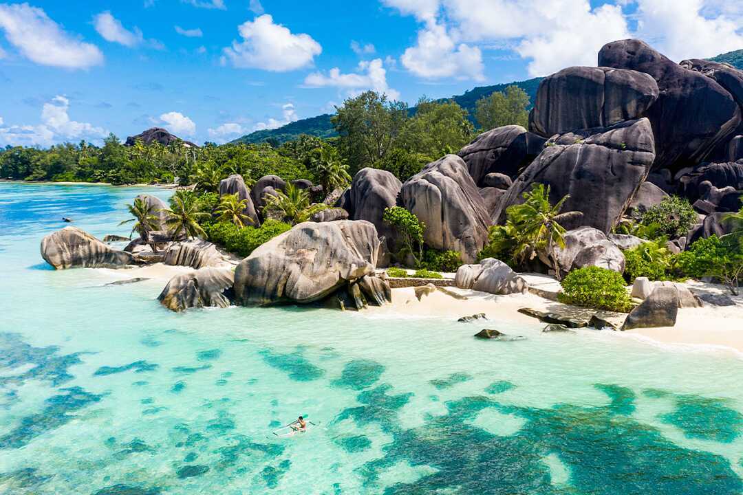 På ön Praslin ligger stranden Anse Lazio, prisad som en av världens vackraste stränder. Här ska du passa på att snorkla då stranden skyddas av ett korallrev. Nationalparken på ön, Vallée de Mai, finns med på Unescos världsarvslista för sin bevarade natur. Här hittar du även de fridlysta dubbelnötpalmerna Coco-de-mer, som blivit Seychellernas symbol. Från Praslin kan du åka färja över till de andra öarna och på La Digue väntar lugnet, med mindre antal besökare och bebyggelse. På La Digue cyklar man helst runt och tar dagen som den kommer. Curieuse Island ligger strax utanför Praslin och är hem för 500 jättesköldpaddor.
