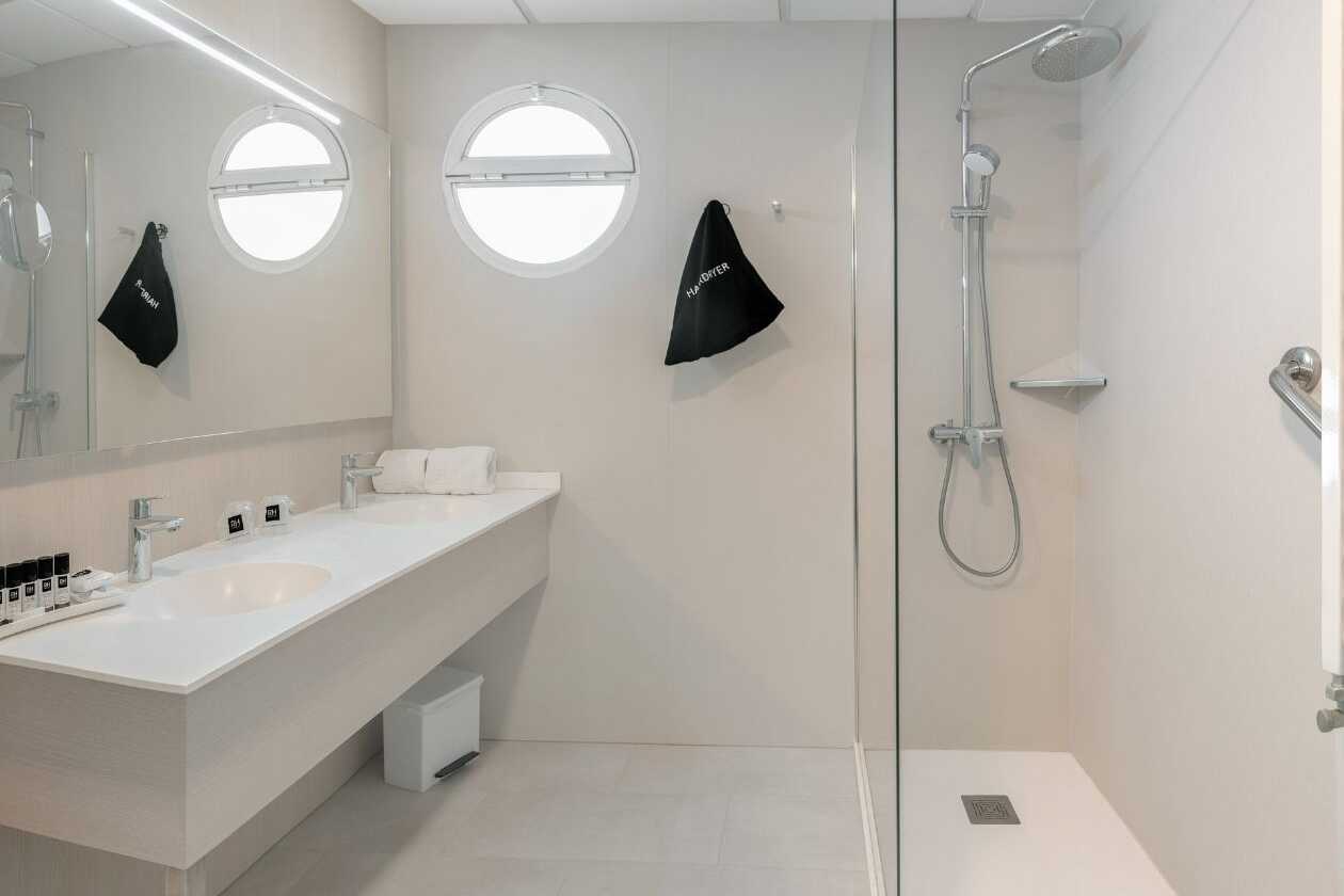 Dubbelrum med balkong, vissa med havsutsikt. Två enkelsängar. Möjlighet till extrabädd i bäddsoffa. Wifi, luftkonditionering och deponering ingår. Kylskåp. Vattenkokare samt kaffe och te. Tv med internationella kanaler. Hårtork. Badrum med badkar eller dusch sam wc. Städning 5 ggr.