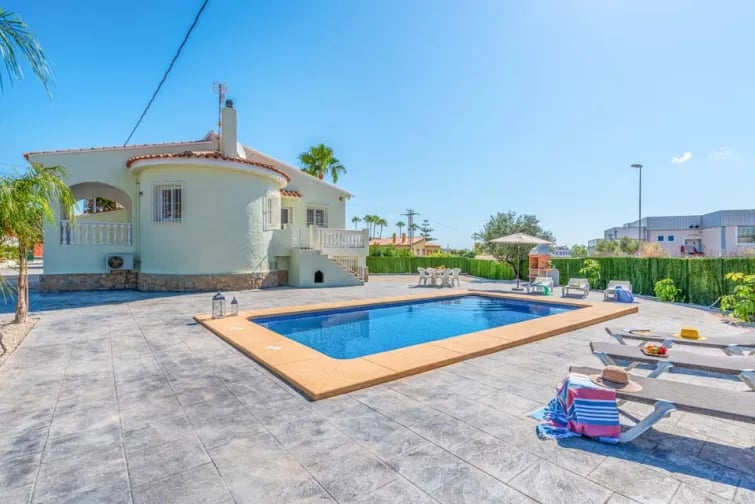 Villan är luftkonditionerad i hela huset. På bottenvåningen finns ett vardagsrum med matplats inomhus, vilket leder vidare till ett fullt utrustat kök med diskmaskin. Därifrån har du två sovrum, ett dubbelrum med eget badrum och ett med två enkelsängar. Ett separat badrum finns också på denna våning.