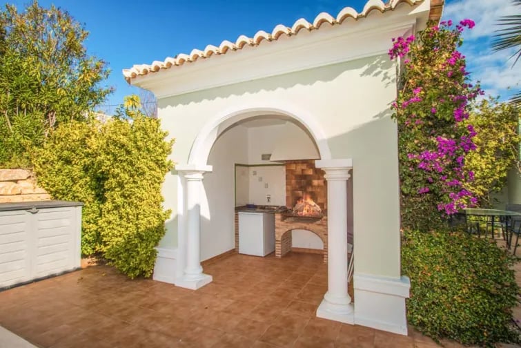 Utanför är den turkosa poolen omgiven av tropisk grönska och natursten. Under den täckta terrassen hittar du några bekväma sittplatser där du kan sitta med ett nybryggt morgonkaffe och vänta på det strålande spanska solskenet som fyller himlen. Njut av solen vid poolen och en kall dryck från utomhuskylskåpet. Vid sidan av terrassen finns en tegelgrill där du kan laga mat med lokala råvaror efter en solig dag.