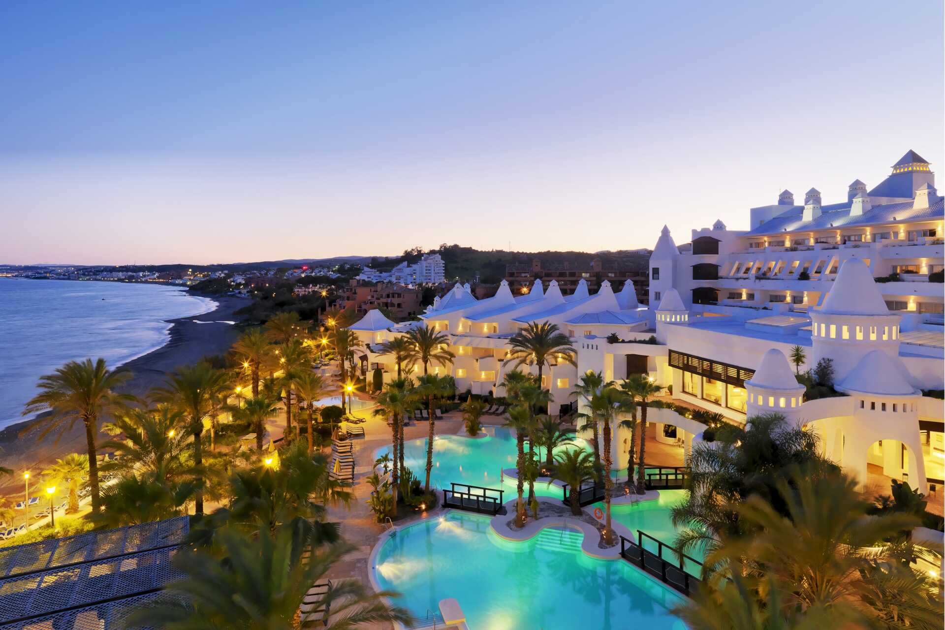 H10 Estepona Palace påminner om ett vitt sandslott. Det är stort, snyggt, har tinnar och torn och ligger precis vid stranden. Hotellet har ett vackert poolområde där stolta palmer ger lite skugga till de lagunformade poolerna. En av poolerna är uppvärmd vintertid till minst 22 grader. Pooltemperaturen kan dock sjunka några grader på morgnar, kvällar och vid dåligt väder. Det finns även en separat barnpool. Solstolar och parasoller finns att låna vid poolerna. Poolhanddukar ingår. Nedanför hotellet finns sandstranden Guadalobón med solstolar och parasoller för hotellets gäster.