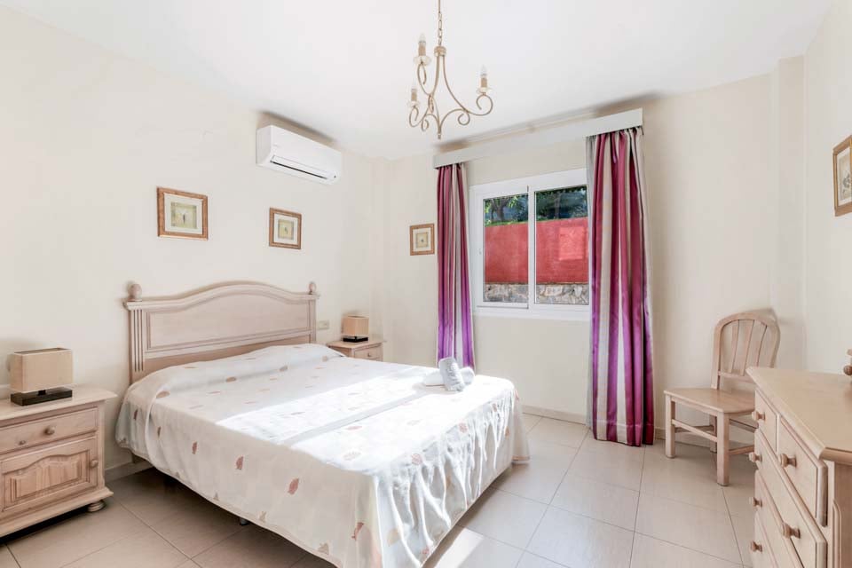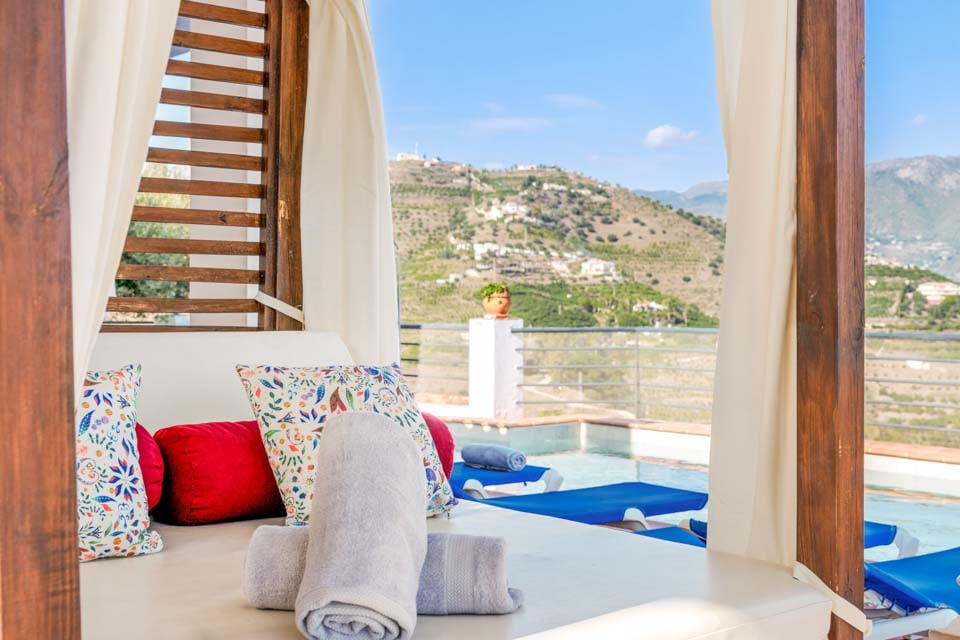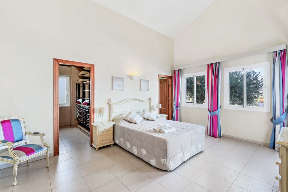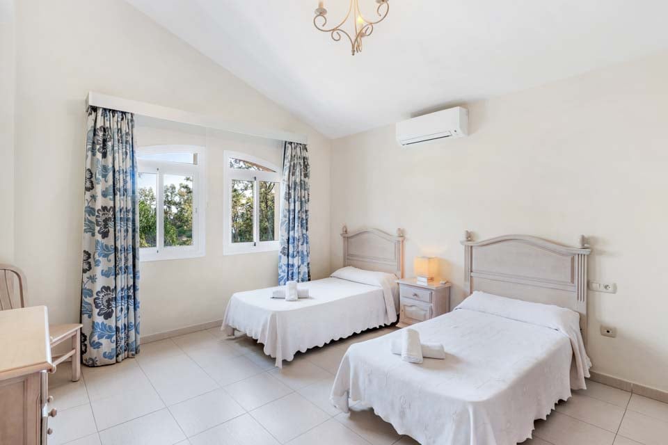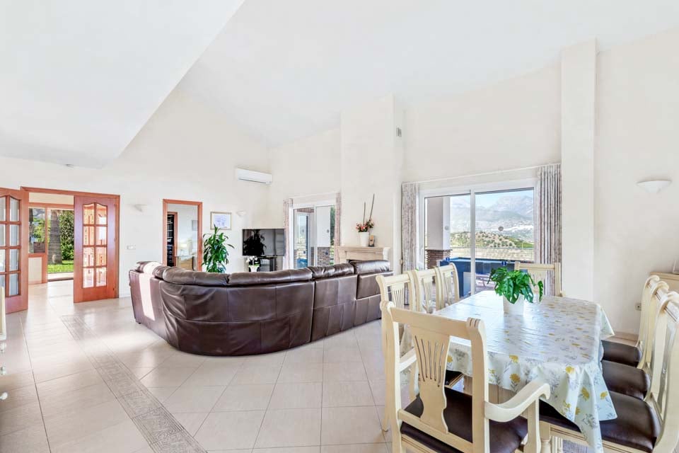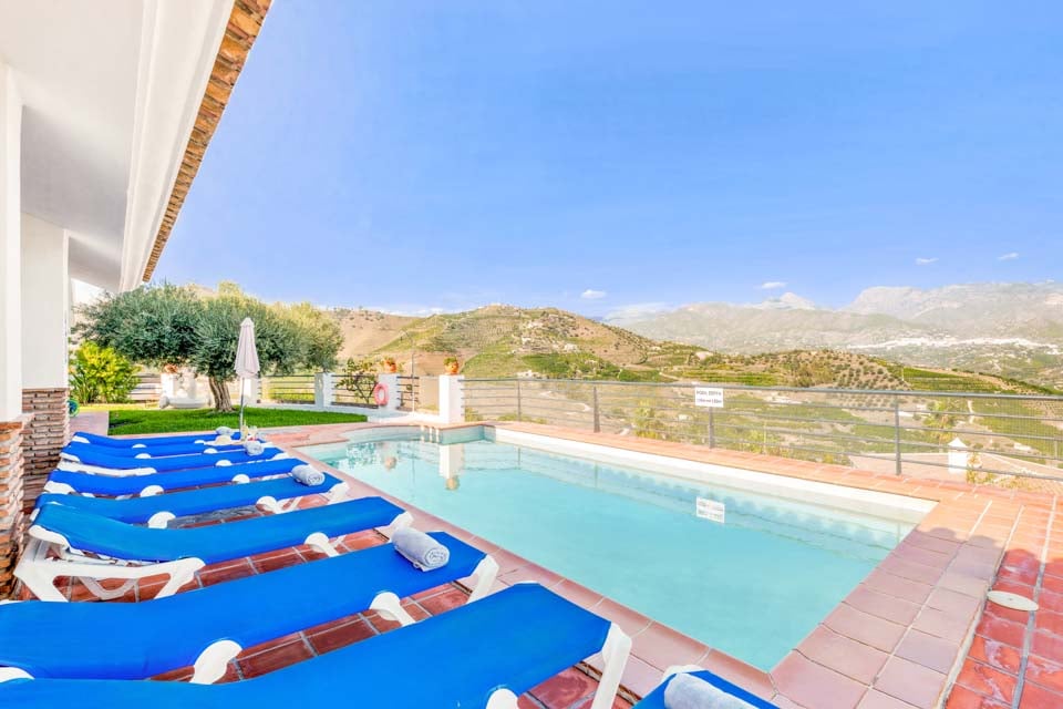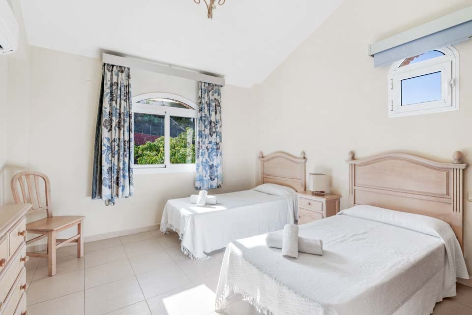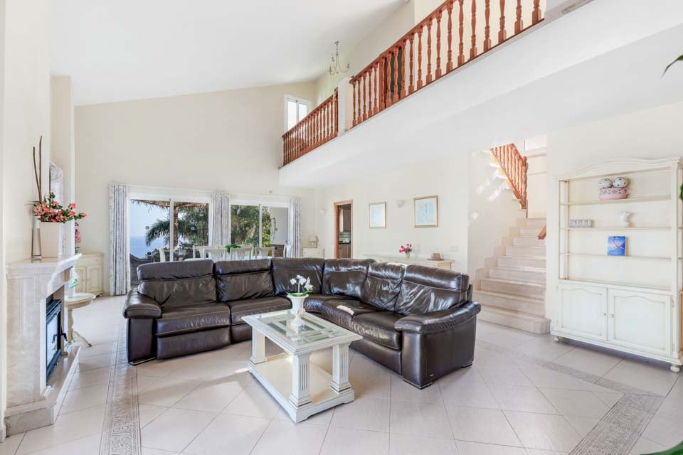 Inuti finns ett stort vardagsrum och matsal som är smakfullt möblerad tillsammans med ett separat, stort och fullt utrustat kök. På övervåningen finns en mezzaninvåning med utsikt över vardagsrummet där två sovrum med två enkelsängar och ett badrum finns. På bottenvåningen finns ytterligare två sovrum, båda med dubbelsäng, ett med eget badrum plus ytterligare ett duschrum. Terrassdörrar leder ut till den inbjudande poolen och grillplatsen, perfekt för att njuta av både solen och den fantastiska utsikten.