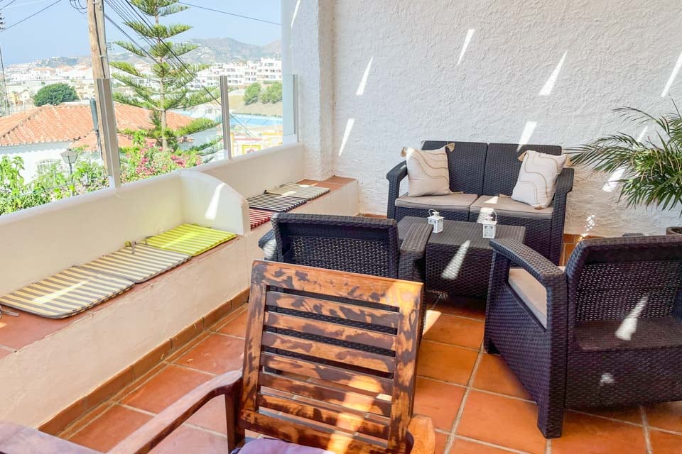 Belägen nordost om centrala Nerja i det trendiga området El Capistrano ligger denna vackra andalusiska villa. Gå uppför trapporna till byggnadens huvudentré där du möts av en härlig, rymlig terrass med inbjudande soffor, samt ett matbord och stolar – perfekt för långa sommardagar där du kan sitta och titta ut på den pittoreska havsutsikten som denna fantastiska lilla fastighet erbjuder.