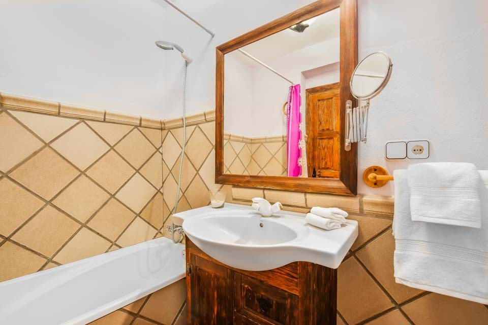 Stig in i huvudvillan så har du ett öppet vardagsrum/matsal/kök med alla moderna bekvämligheter för att garantera en bekväm vistelse. Längre ner i hallen hittar du ett modernt sovrum med två enkelsängar och inbyggda garderober. Ett separat badrum har ett badkar med dusch. Utanför huset kommer du till en separat ingång till dubbelrummet där du har den extra fördelen av ett eget badrum med utsikt över poolen samt den extra lyxen av ett extra omklädningsrum.