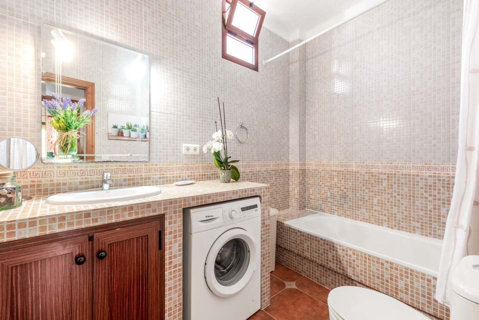 Badkar med dusch, toalett, handfat, tvättmaskin