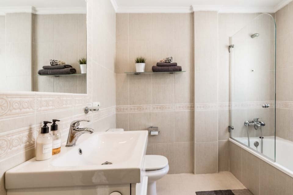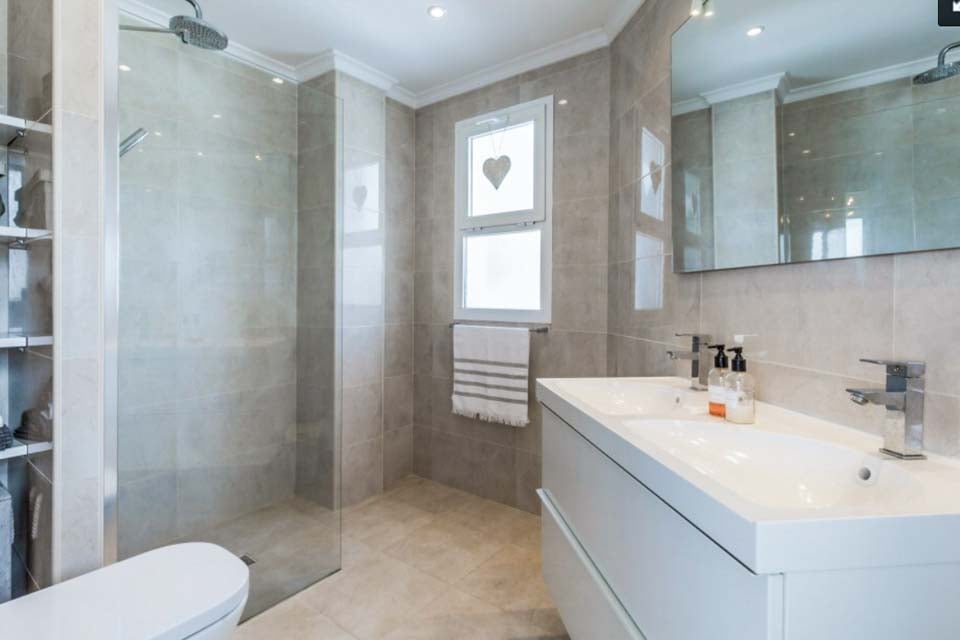 Duschrummet på nedervåningen har dörrar som ansluter till båda sovrummen.