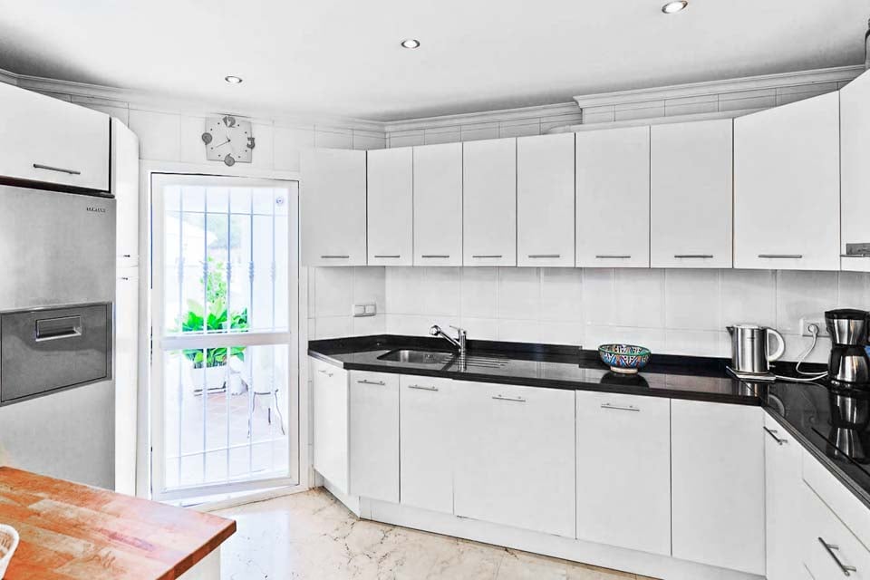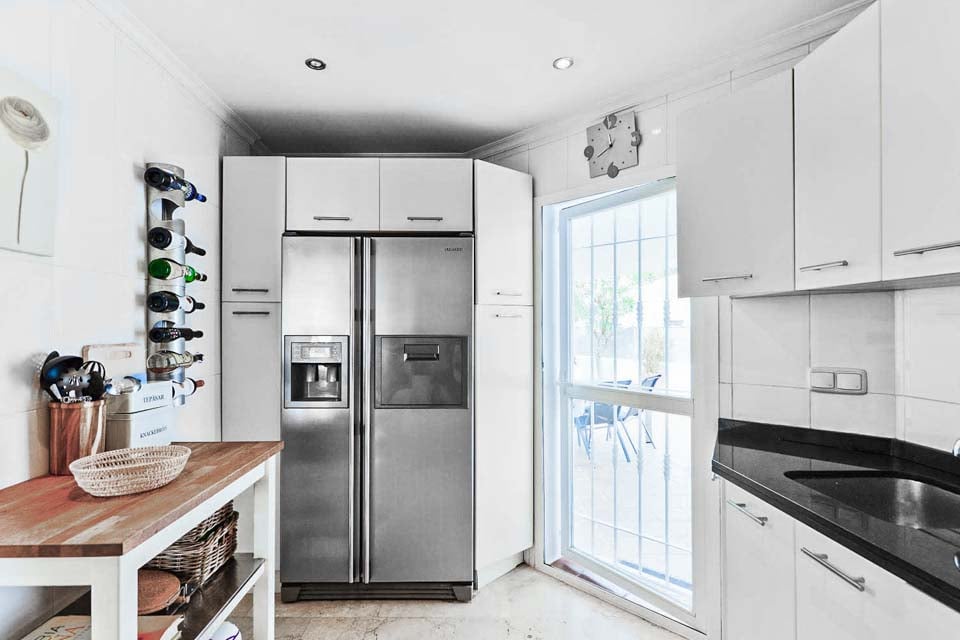 Frys, Kylskåp, Kyl- och frysskåp, Diskmaskin, Spishäll, Ugn, Mikrovågsugn, Dörrar till terrass, Tvättmaskin