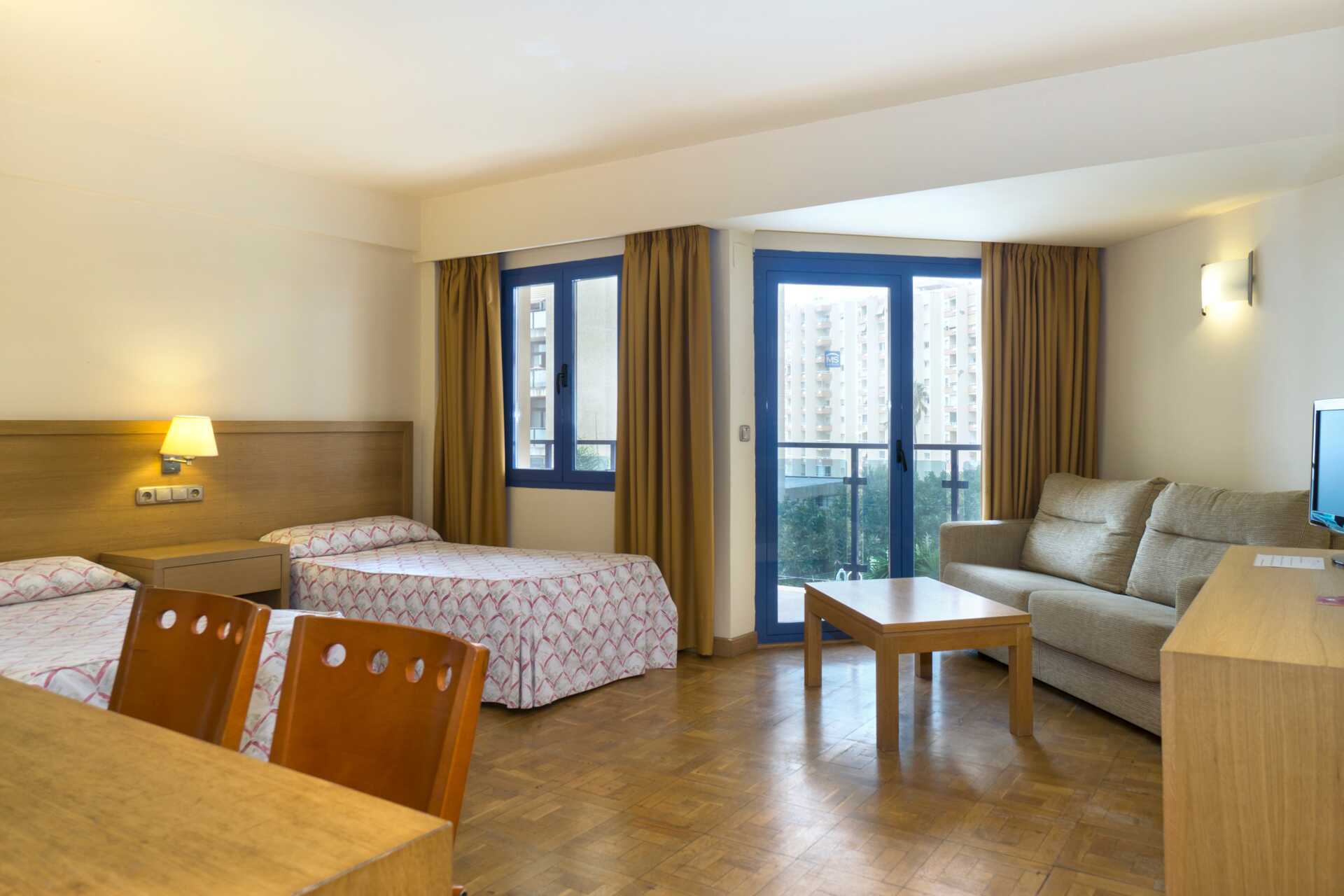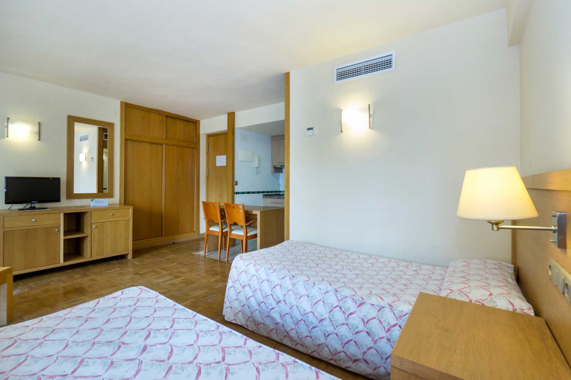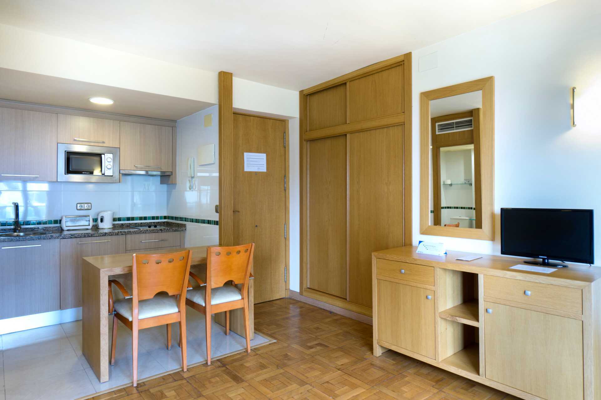 Tvårumslägenhet med balkong eller terrass. Sovrum och kombinerat vardagsrum/minikök. En dubbelsäng eller två enkelsängar. Möjlighet till extrabäddar i en bäddsoffa. Minikök med kokplattor, kylskåp, mikrovågsugn, kaffebryggare, vattenkokare, brödrost samt enkel köksutrustning. Luftkonditionering ingår. Deponering och wifi mot avgift. Tv med internationella kanaler. Hårtork. Badrum med badkar och wc. Städning 5 ggr/vecka.