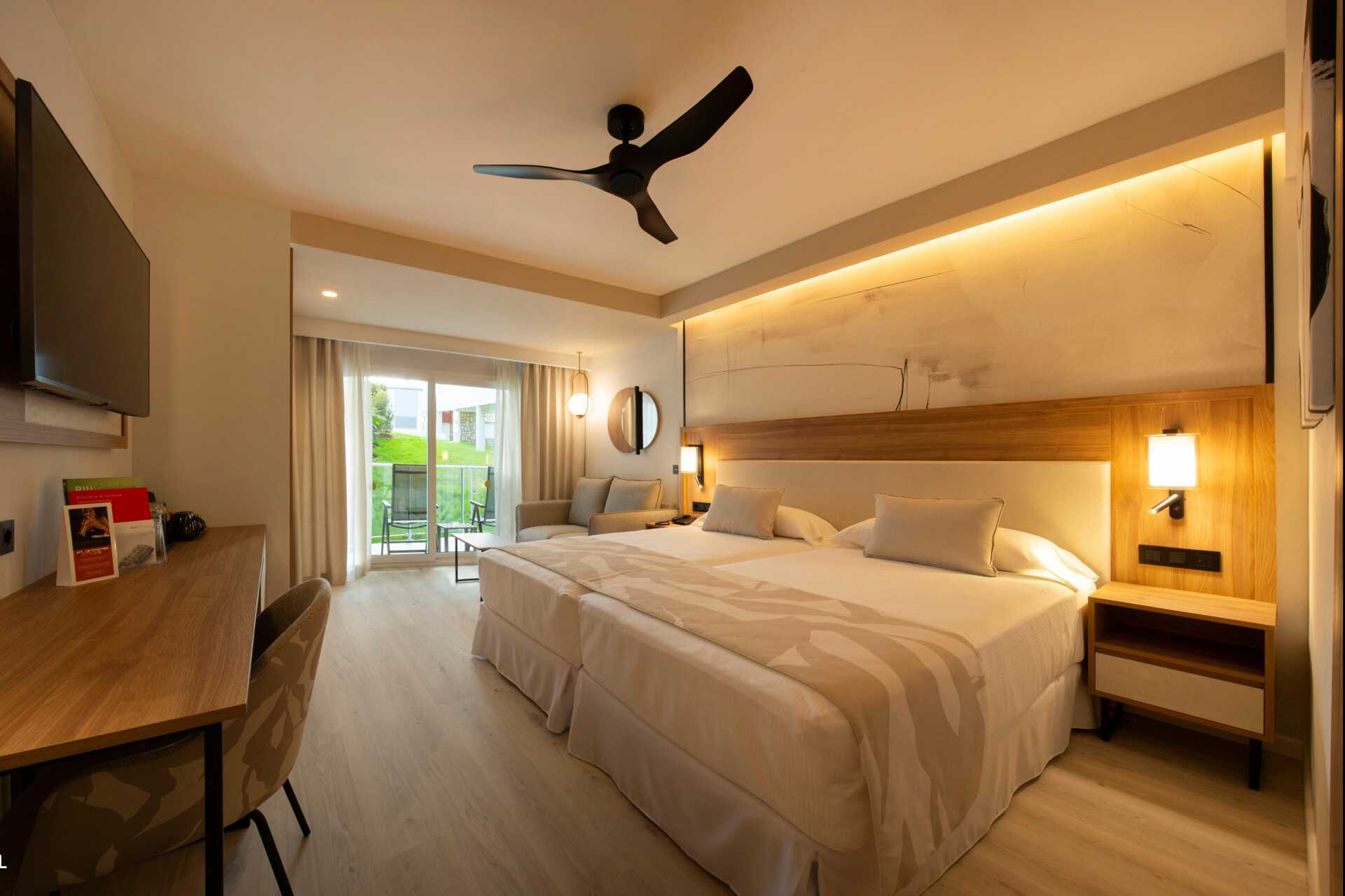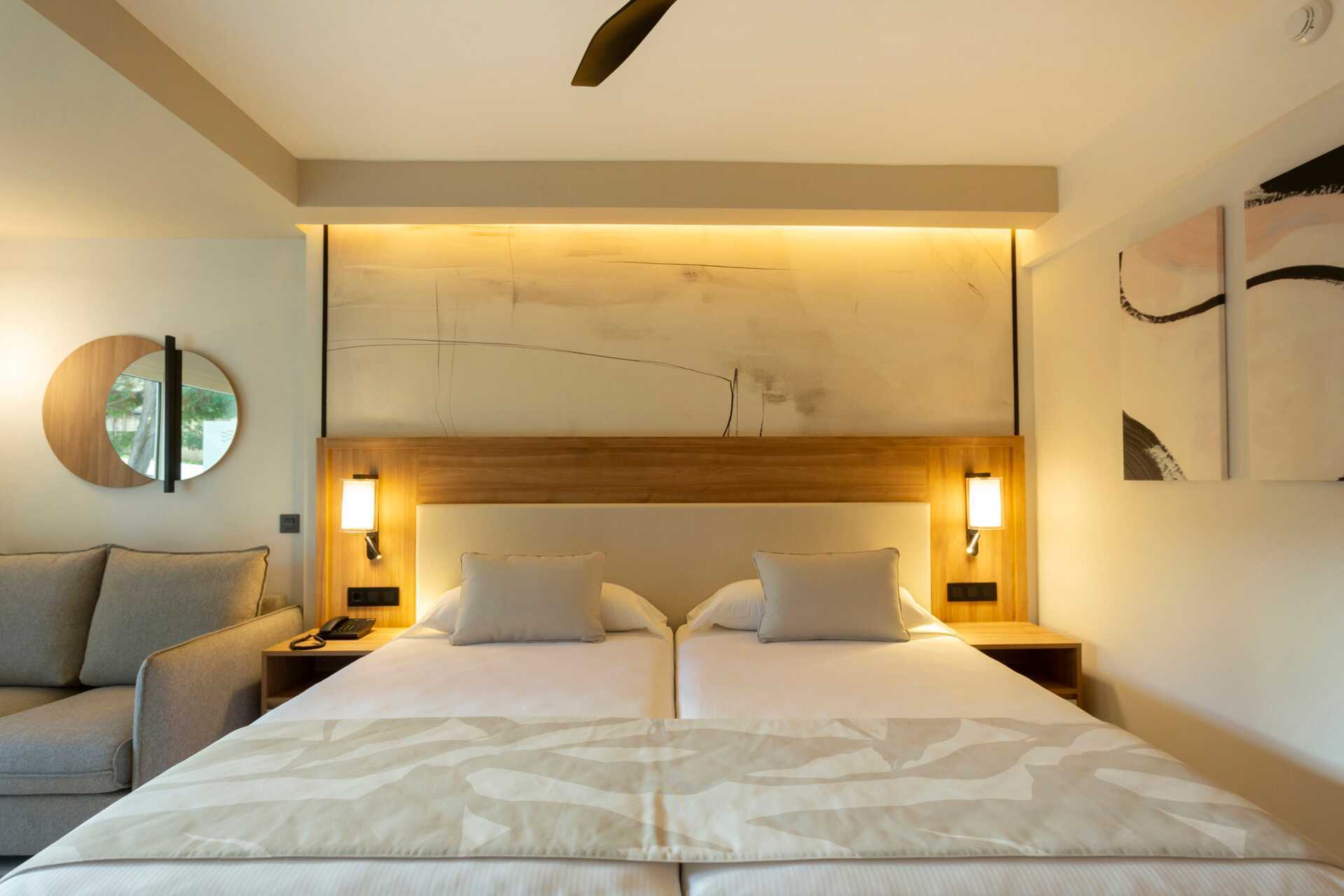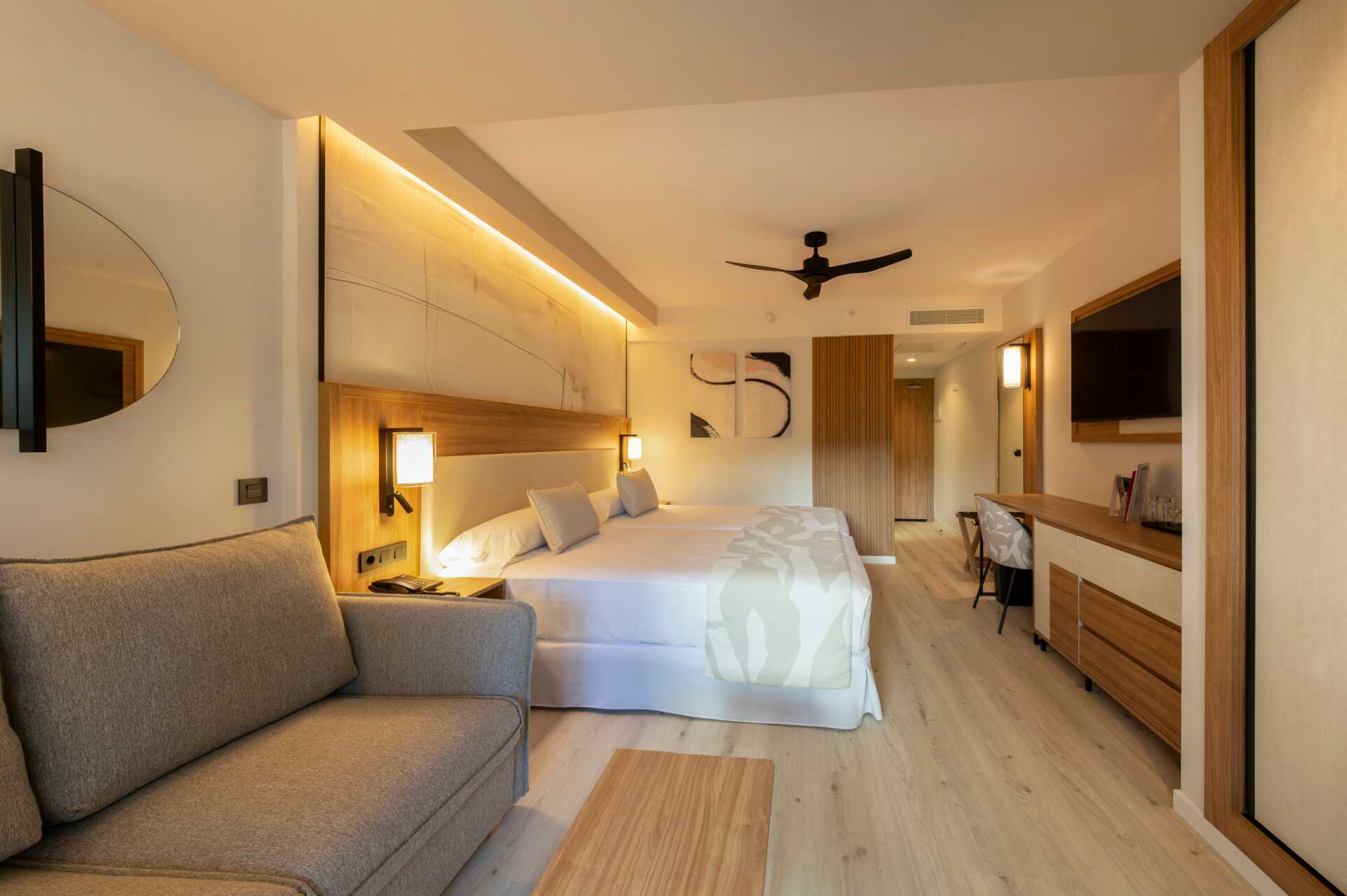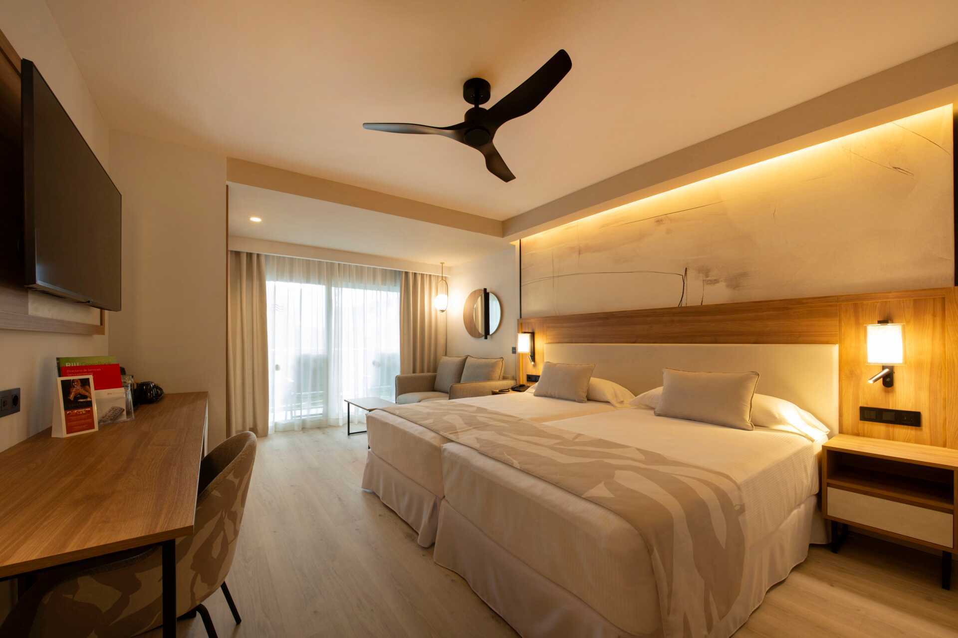 Dubbelrum med balkong eller terrass, vissa med begränsad havsutsikt. En dubbelsäng eller två enkelsängar. Wifi och luftkonditionering ingår. Deponering mot avgift. Takfläkt. Minibar. Vattenkokare. Tv med internationella kanaler. Hårtork. Badrum med dusch och wc. Städning 7 ggr/vecka.
