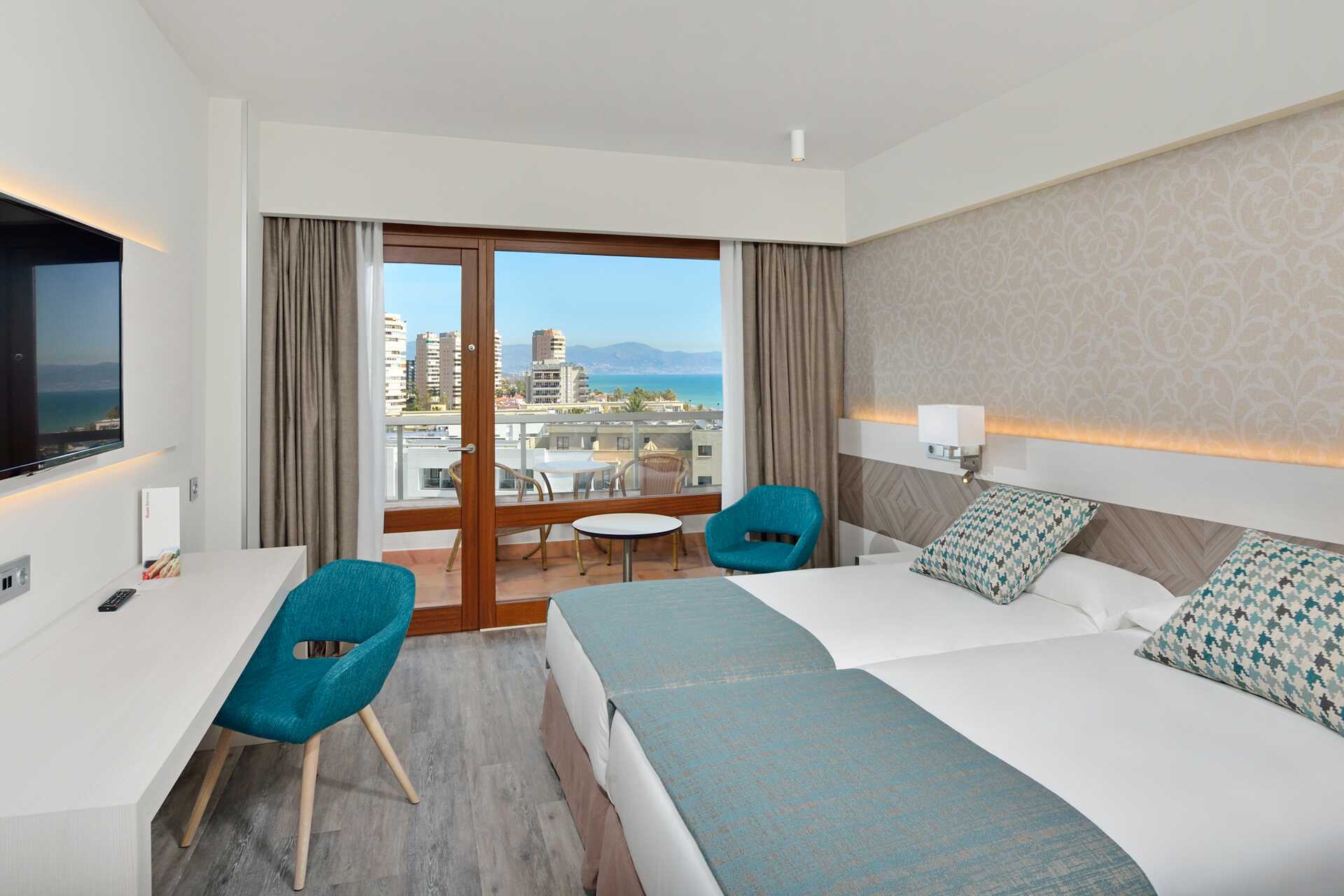Dubbelrum med balkong, vissa med begränsad havsutsikt. En dubbelsäng eller två enkelsängar. Möjlighet till extrabädd i bäddsoffa. Wifi, luftkonditionering och deponering ingår. Minibar mot avgift. Tv med internaionella kanaler. Hårtork. Badrum med dusch och wc. Städning 7 ggr/vecka. Barn under två år räknas in i max antal personer i rummet.