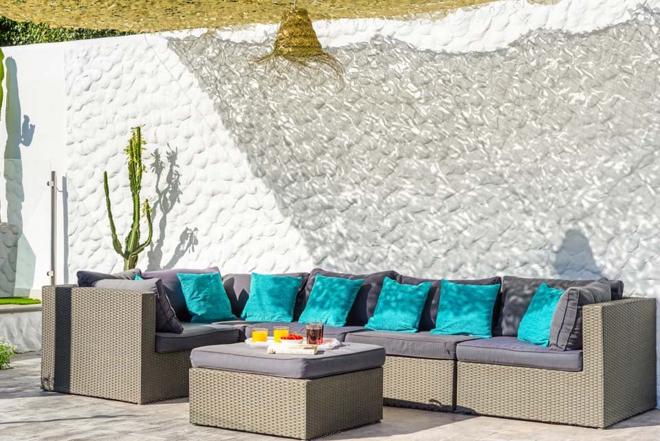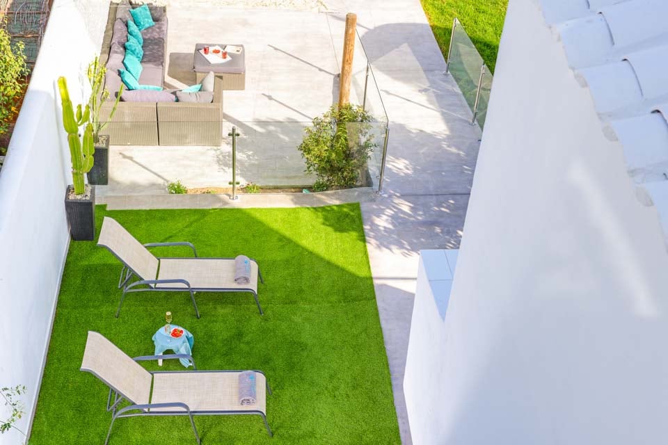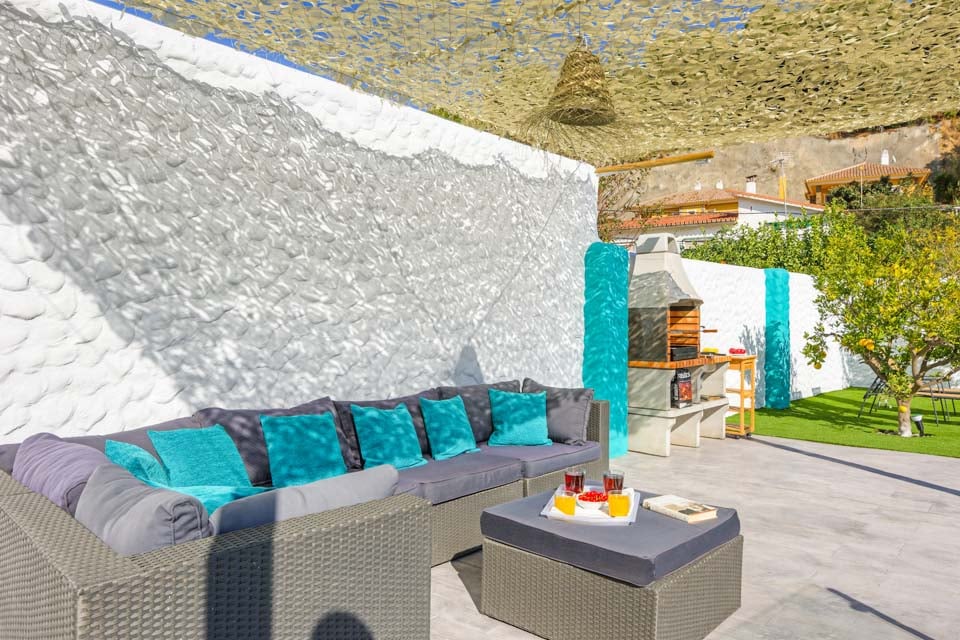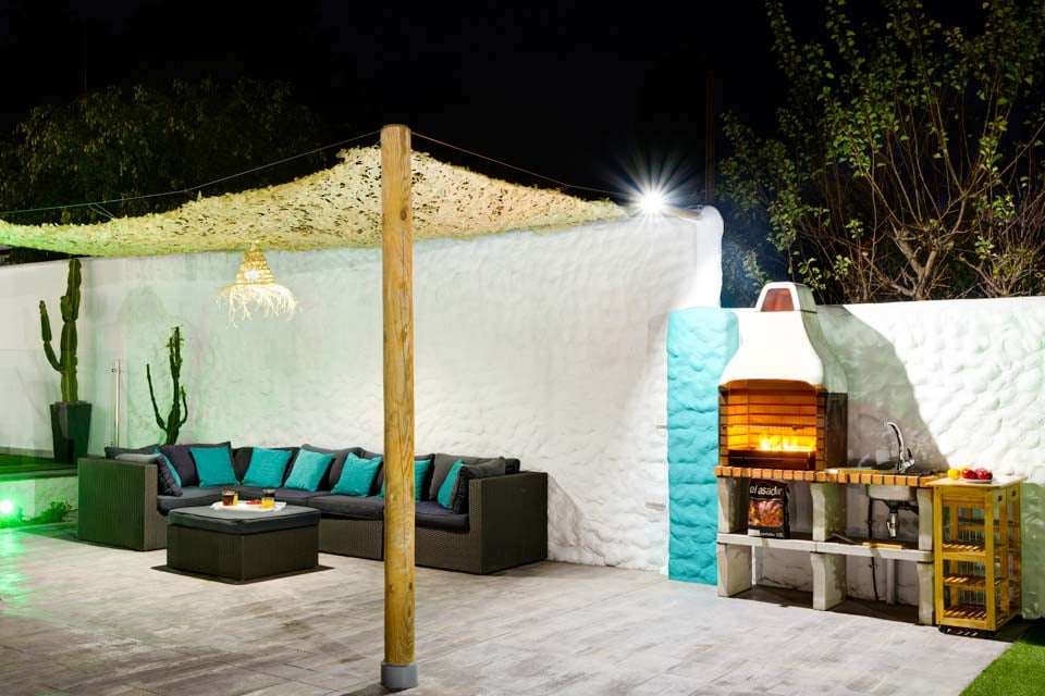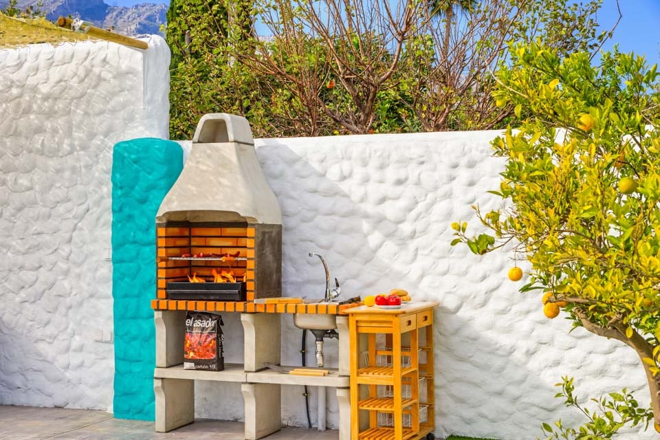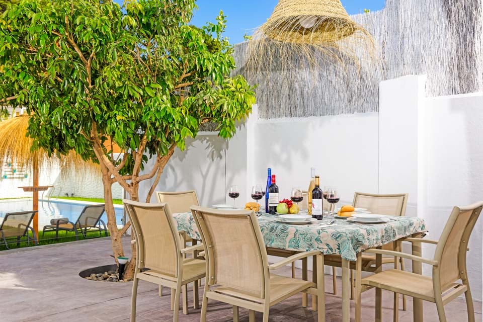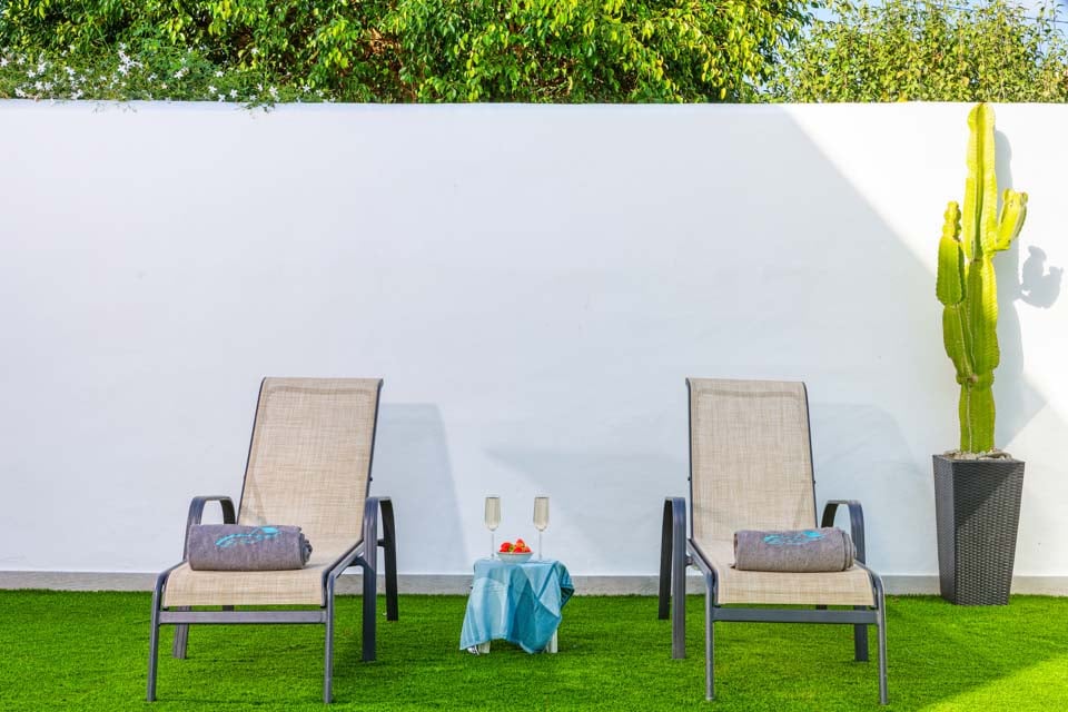 Villan är omgiven av en charmig trädgård med gräsmatta och fruktträd, där gästerna kan koppla av på den rymliga terrassen. Den privata poolen är omgiven av solstolar i kombination med eleganta parasoller, medan bekväma rotting-soffor, en vacker matplats och inbyggd grill finns till hands för att njuta av middag och vin utomhus.