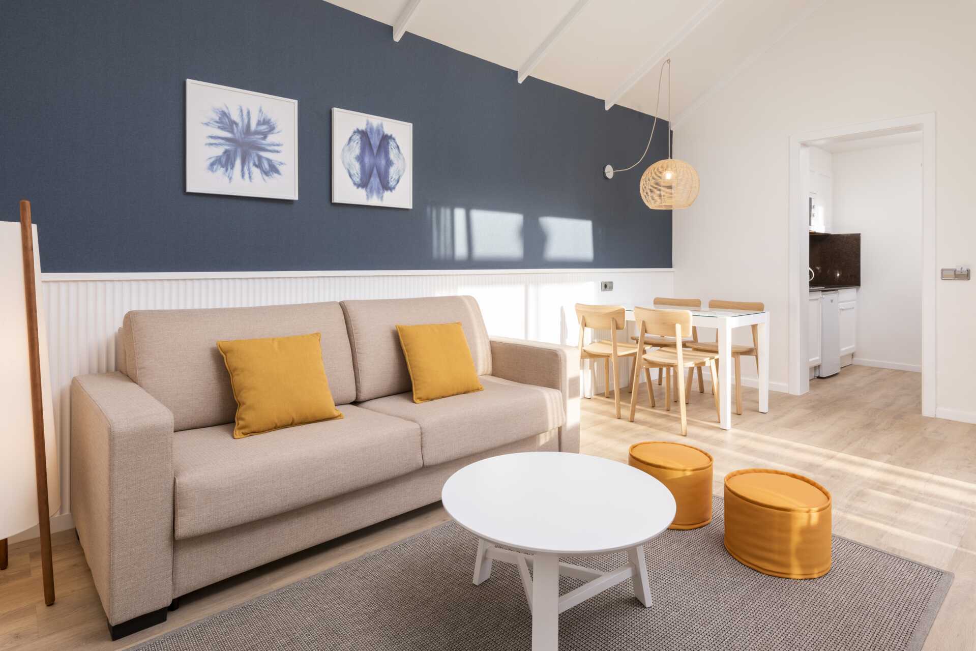 Tvårumslägenhet som är belägen i bungalowbyggnader utspridda över området. Balkong eller terrass, vissa lägenheter har två terrasser. Lägenheterna har olika inredning. Ett sovrum och ett kombinerat vardagsrum med minikök. En dubbelsäng eller två enkelsängar. Möjlighet till extrabäddar i bäddsoffa. Minikök med kylskåp, kokplattor, mikrovågsugn och vattenkokare samt enkel köksutrustning. Tv med internationella kanaler. Wifi och luftkonditionering ingår. Deponering mot avgift. Hårtork. Badrum med badkar eller dusch samt wc. Städning 7 ggr/vecka.