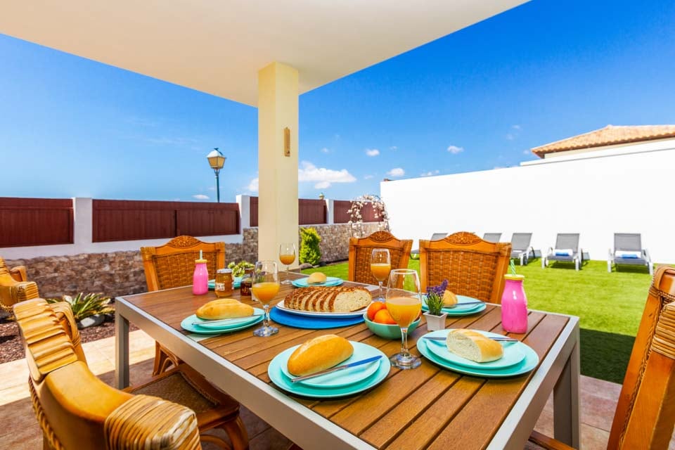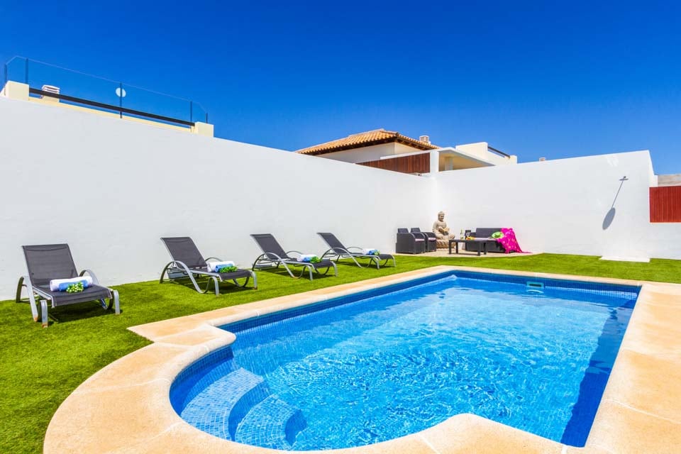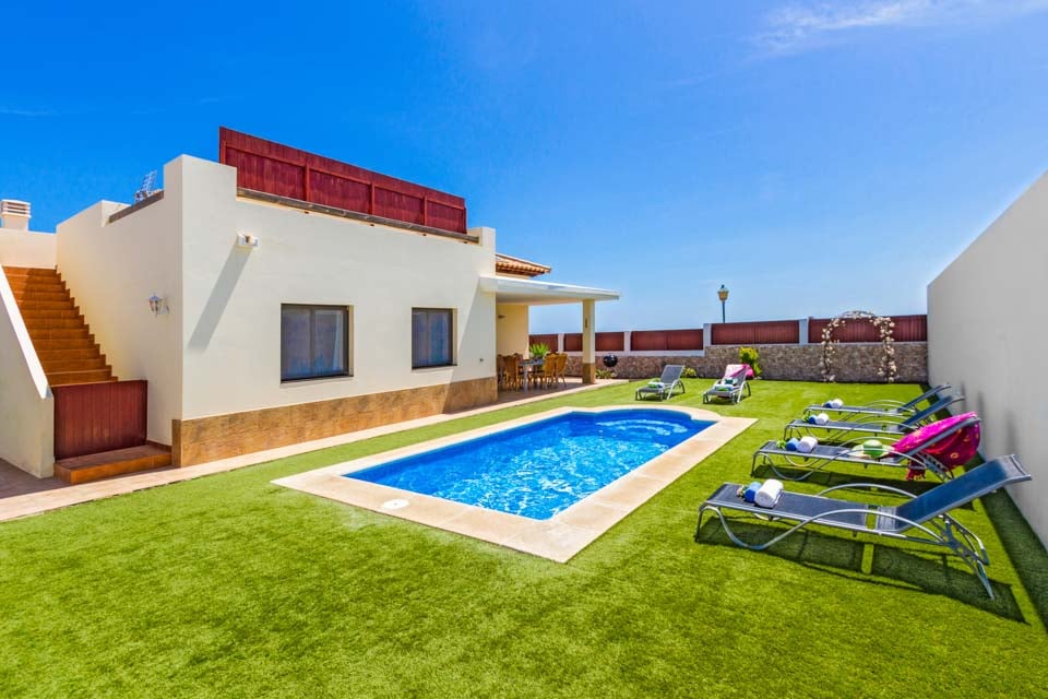 Villa Laurita ligger i ett utmärkt område i Caleta de Fuste, inom bekvämt räckhåll från dess blonda stränder, marinan och det prestigefyllda mästerskapsgolfanläggningen. Denna rymliga fastighet med tre sovrum är möblerad till en hög standard och är fullt utrustad med allt du kan behöva för en villasemester på Fuerteventura.