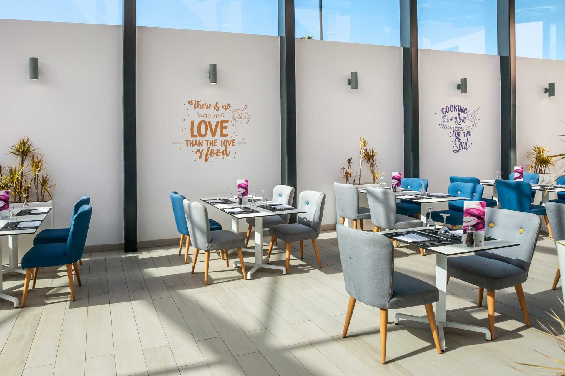 På hotellet finns bufférestaurangen Tramontana där det serveras frukost och middag. Det finns även en poolbar, Alisos, som erbjuder enklare rätter till lunch. Bar med underhållning några kvällar i veckan. Det finns även en gastrobar, Aponier, som serverar välkylda drycker - ingår ej i hotellets All Inclusive-program.