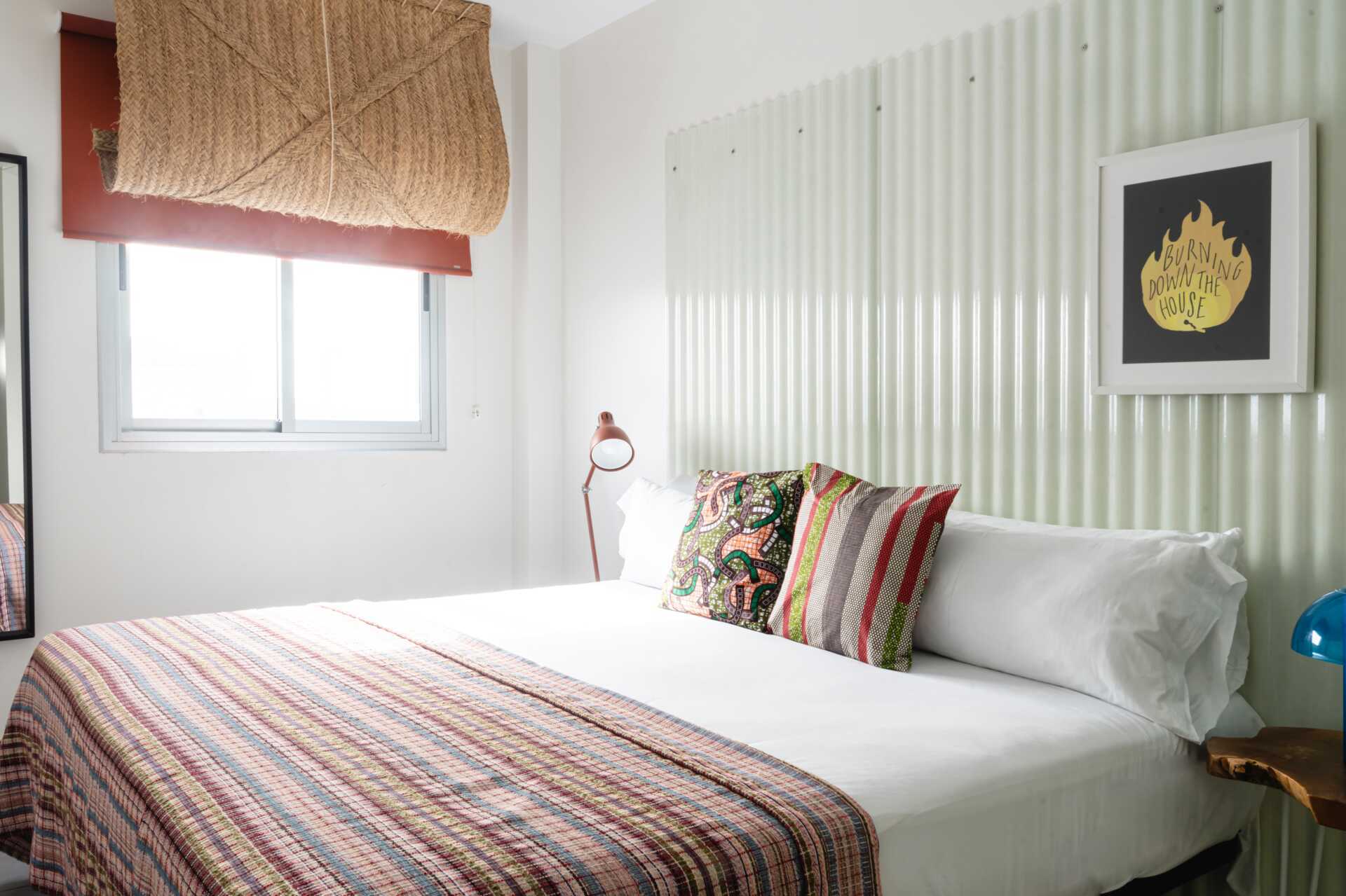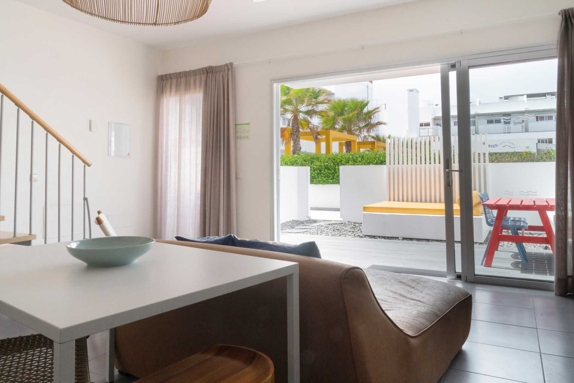 Lägenheten med markterrass är i två våningar. På entréplan finns ett kombinerat vardagsrum med minikök samt en markterrass med matbord och stolar och en dagbädd. En trappa upp finns två sovrum, ett med två enkelsängar och ett sovrum med en våningssäng samt ett badrum. Markterrassen är ut mot gatan.