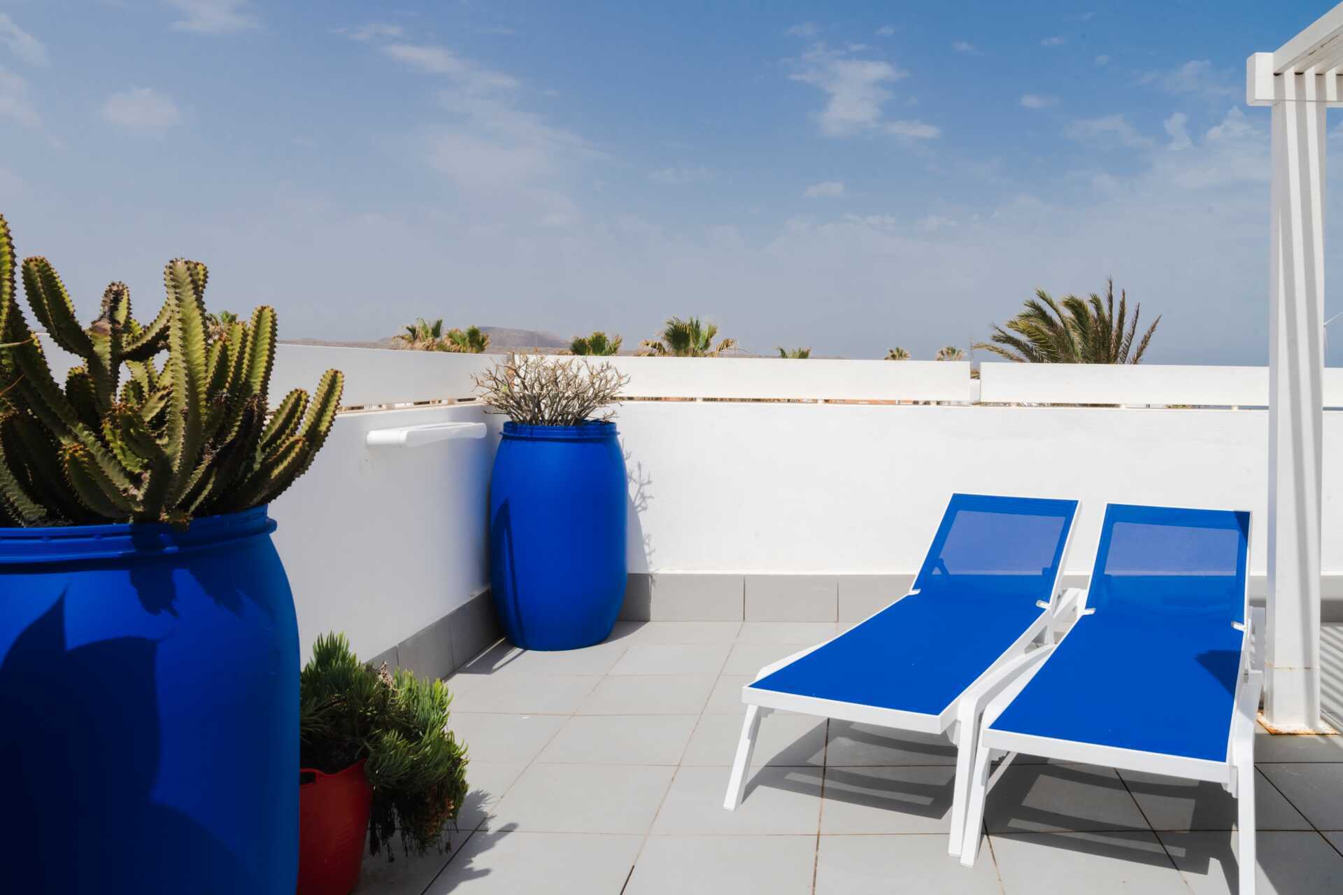Lägenheterna med takterrass har på entréplanet ett kombinerat vardagsrum med minikök, ett badrum, två sovrum med en dubbelsäng eller två enkelsängar samt en smal spiraltrappa upp till takterrassen där det finns en matplats och solstolar - delar av terrassen har soltak.