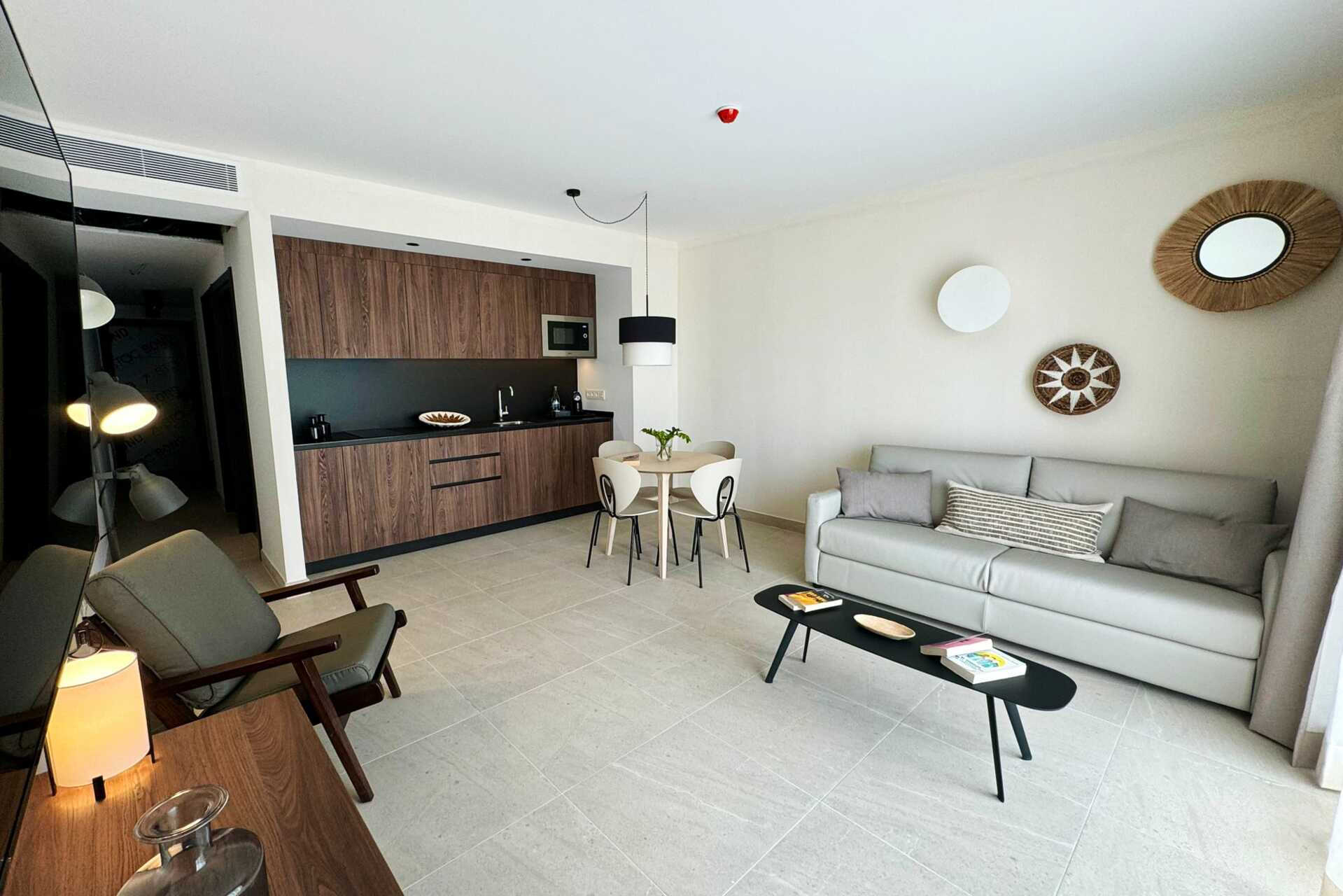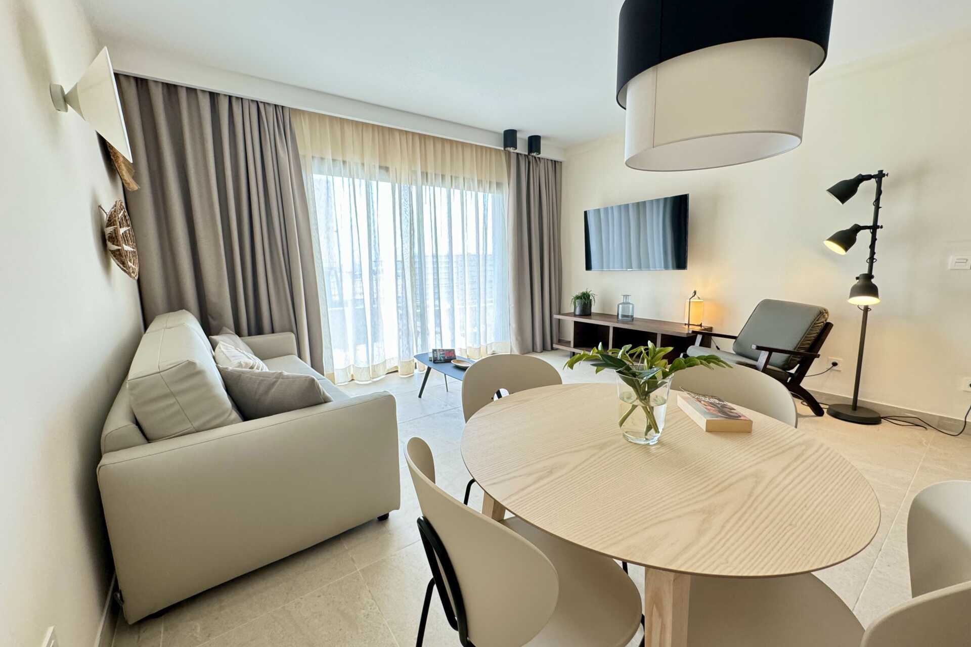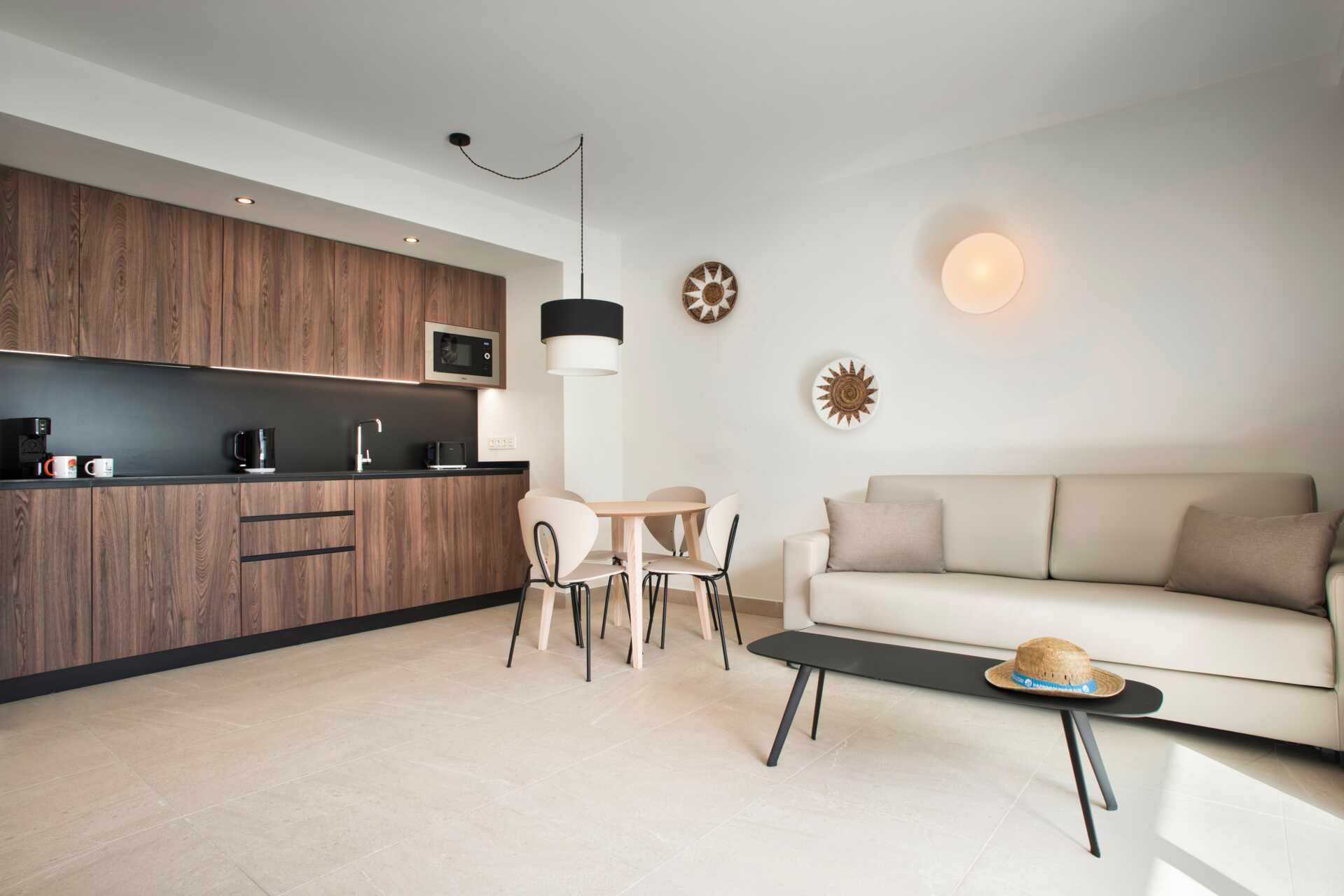 Trerumslägenhet med balkong och terass. Två sovrum och kombinerat vardagsrum/minikök. Minikök med kokplattor, kylskåp, kaffebryggare, vattenkokare samt enkel köksutrustning. Wifi, luftkonditionering och deponering ingår. Tv med internationella kanaler. Hårtork. Badrum med dusch och wc. Städning 7 ggr/vecka.