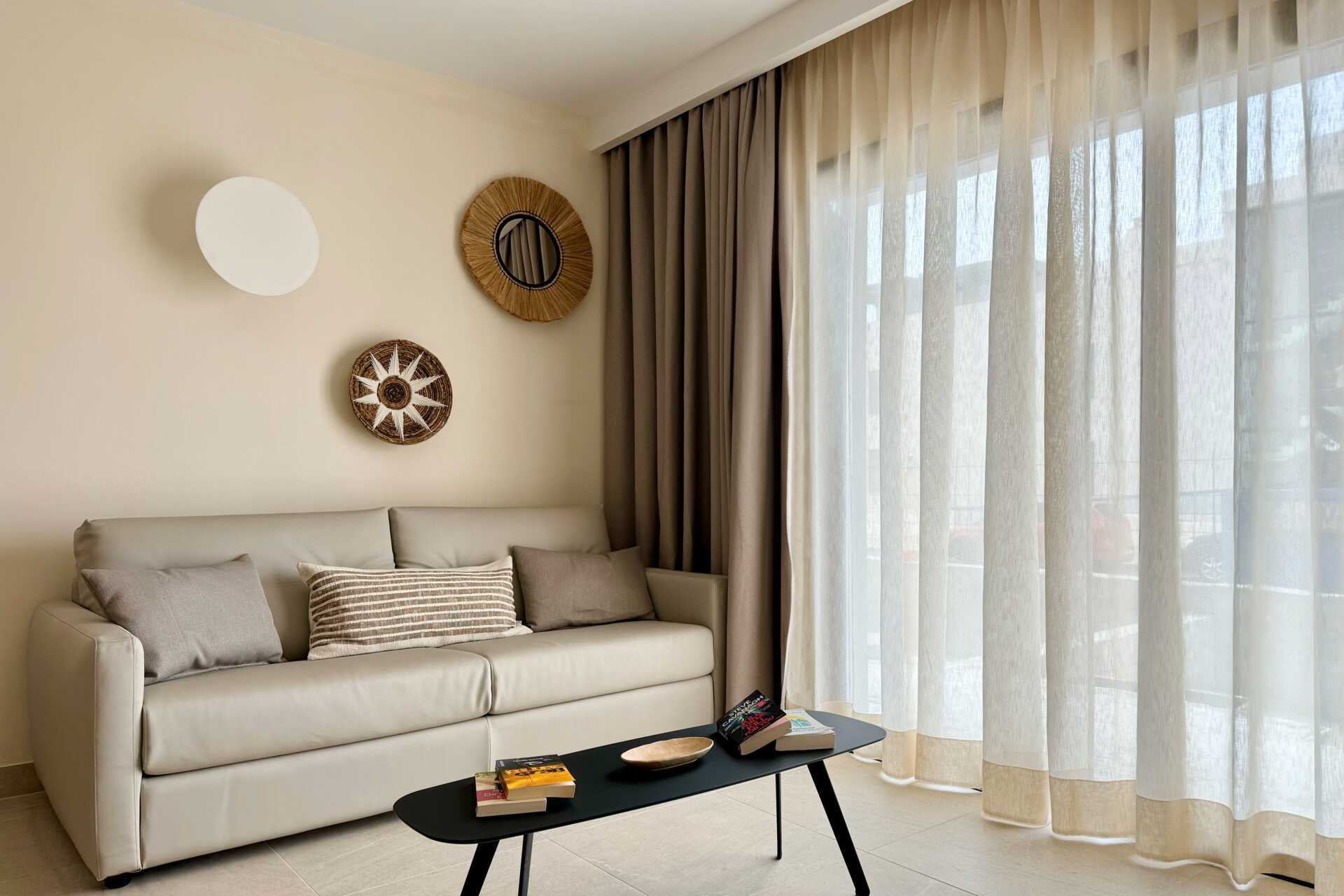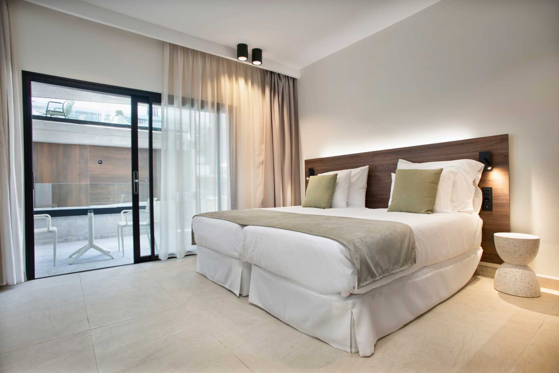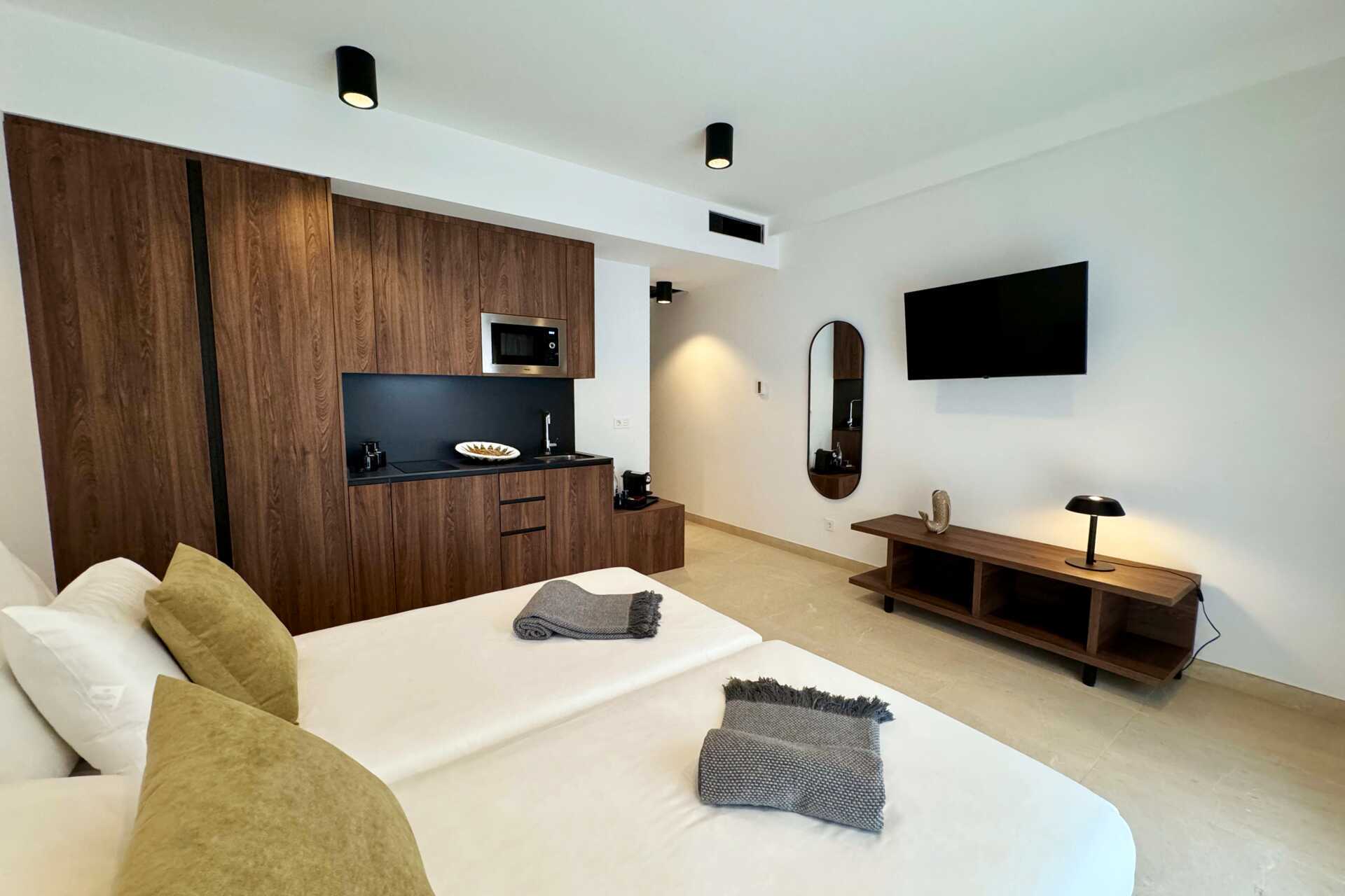 Tvårumslägenhet med balkong och takterass. Sovrum och kombinerat vardagsrum/minikök. Minikök med kokplattor, kylskåp, kaffebryggare, vattenkokare, samt enkel köksutrustning. Wifi, luftkonditionering och deponering ingår. Tv med internationella kanaler. Hårtork. Badrum med dusch och wc. Städning 7 ggr/vecka.