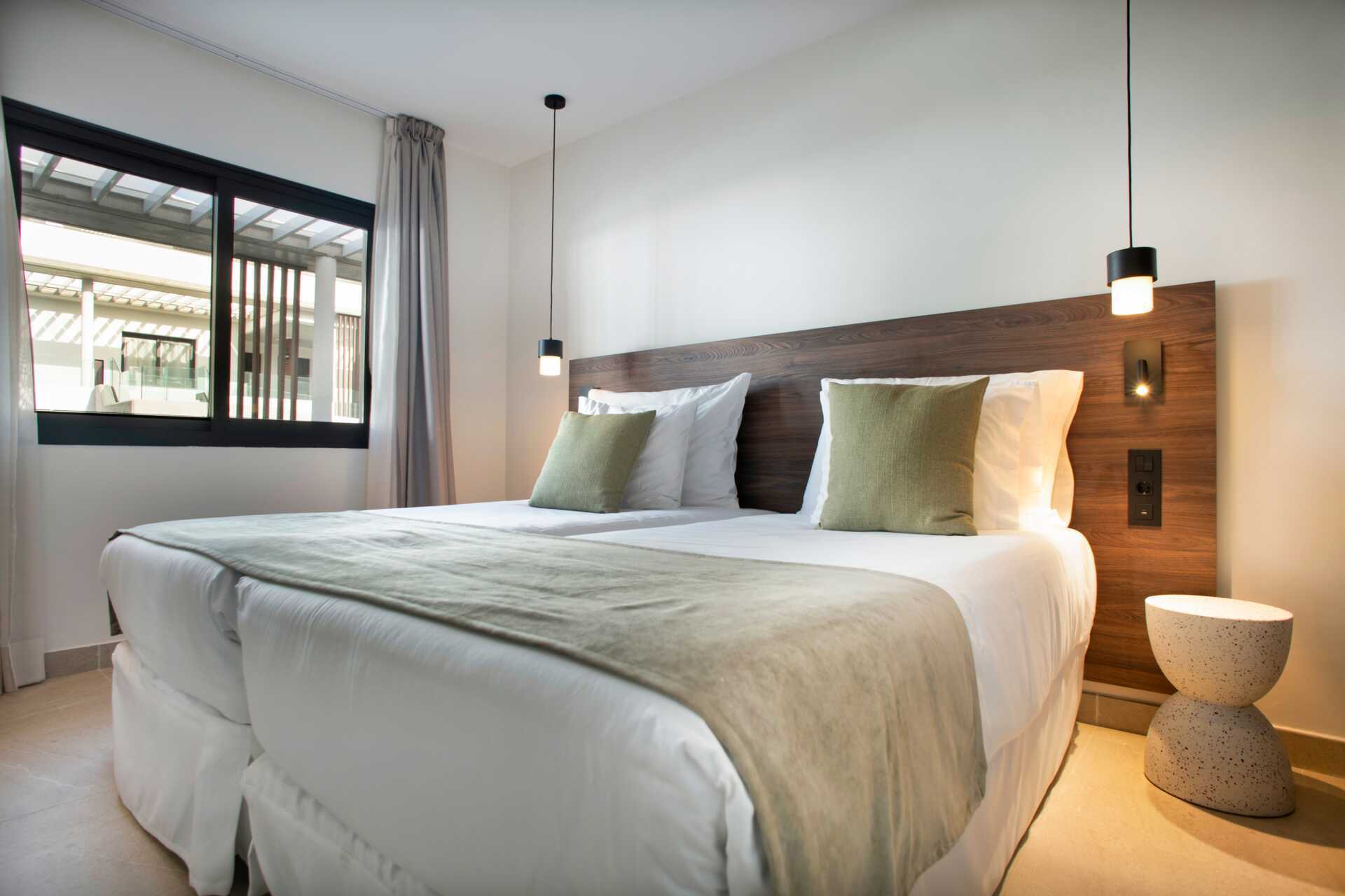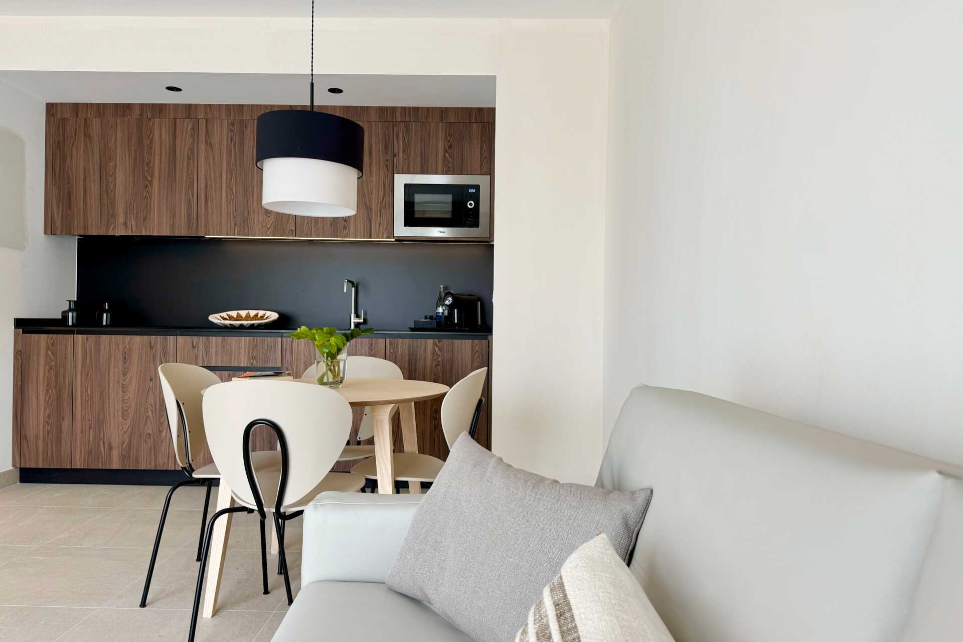 Trerumslägenhet med privat pool på uteplatsen. Två sovrum och kombinerat vardagsrum/minikök. Minikök med kokplattor, kylskåp, kaffebryggare, vattenkokare samt kaffe och te samt enkel köksutrustning. Wifi, luftkonditionering och deponering ingår. Tv med internationella kanaler. Hårtork. Badrum med dusch och wc. Städning 7 ggr/vecka.