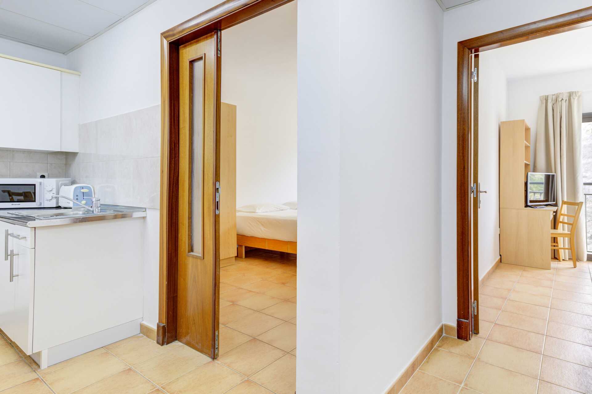 Trerumslägenheterna, vissa med markterrass, vissa utan uteplats. Två sovrum och ett minikök och matplats. Två enkelsängar i varje sovrum. Lägenheter för upp till 6 personer har två våningssängar i ett av sovrummen. Minikök med kokplattor, mikrovågsugn, kylskåp med liten frysdel, vattenkokare med kaffe och te samt köksutrustning. Wifi, luftkonditionering och deponering ingår. Badrum med dusch och wc. Två toaletter. Städning 5 ggr/vecka.