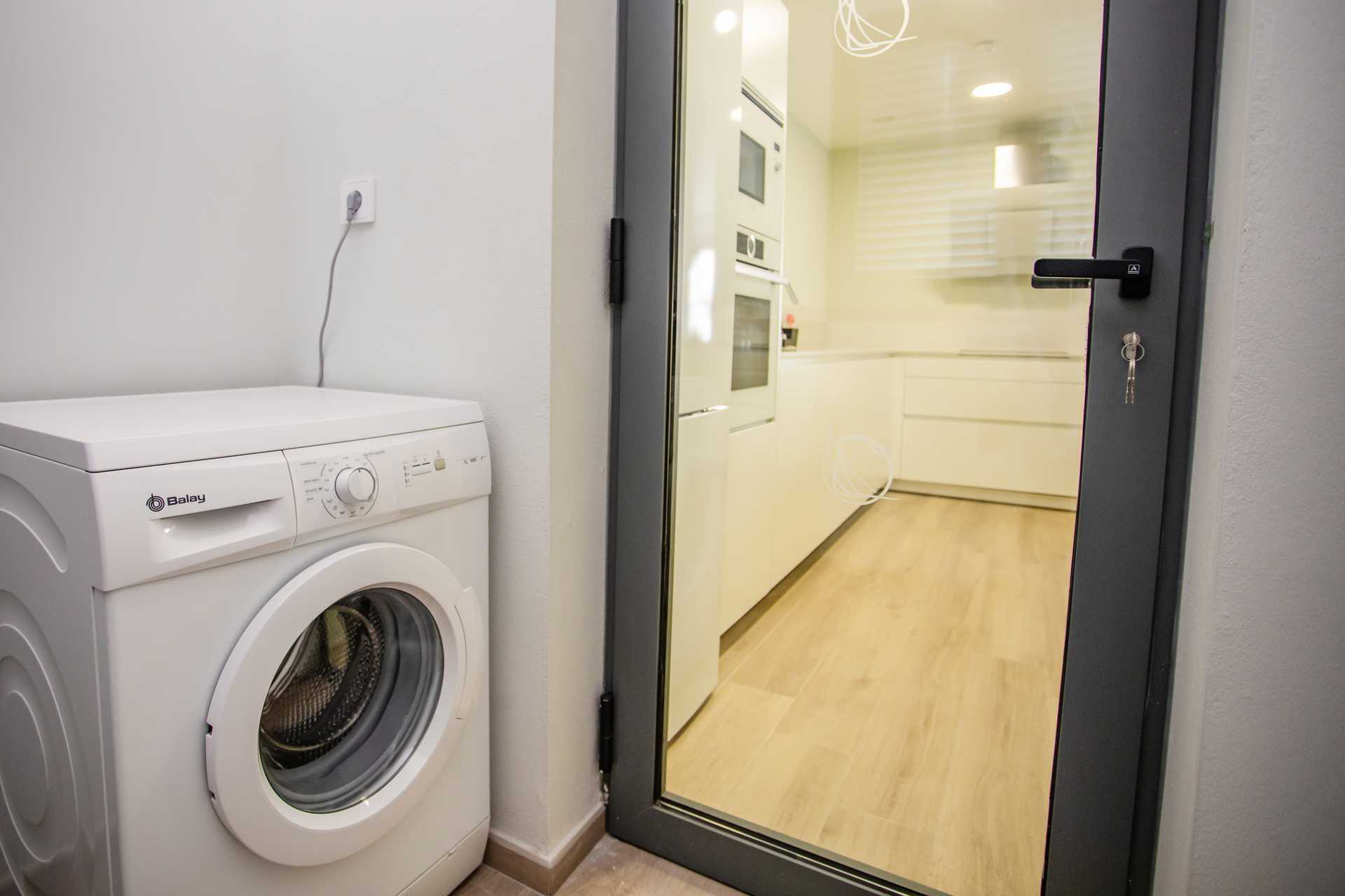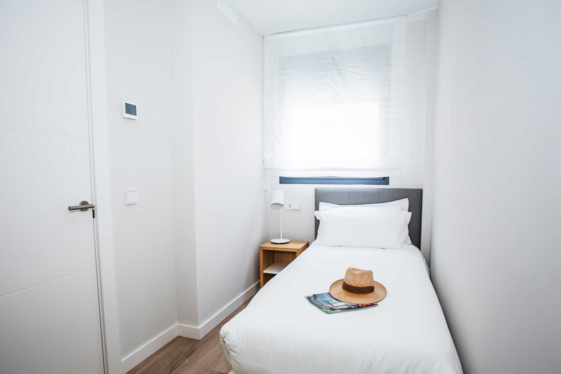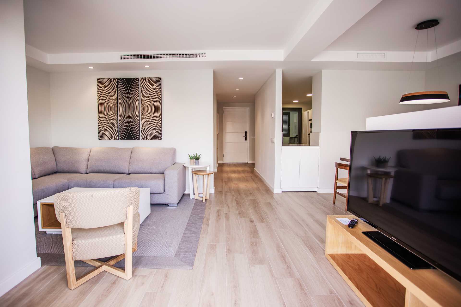 Fyrarumslägenhet med balkong. Tre sovrum och ett kombinerat vardagsrum&minikök. Två sovrum har två enkelsängar i varje rum och det tredje rummet har en bäddsoffa. Minikök med kylskåp och frys, diskmaskin, kaffebryggare, vattenkokare, brödrost, ugn och bra köksutrustning. Wifi, deponering och luftkonditionering ingår. Tv med internationella kanaler. Strykjärn. Tvättmaskin. Hårtork. Tre badrum med dusch och wc. Städning 5 ggr/vecka.