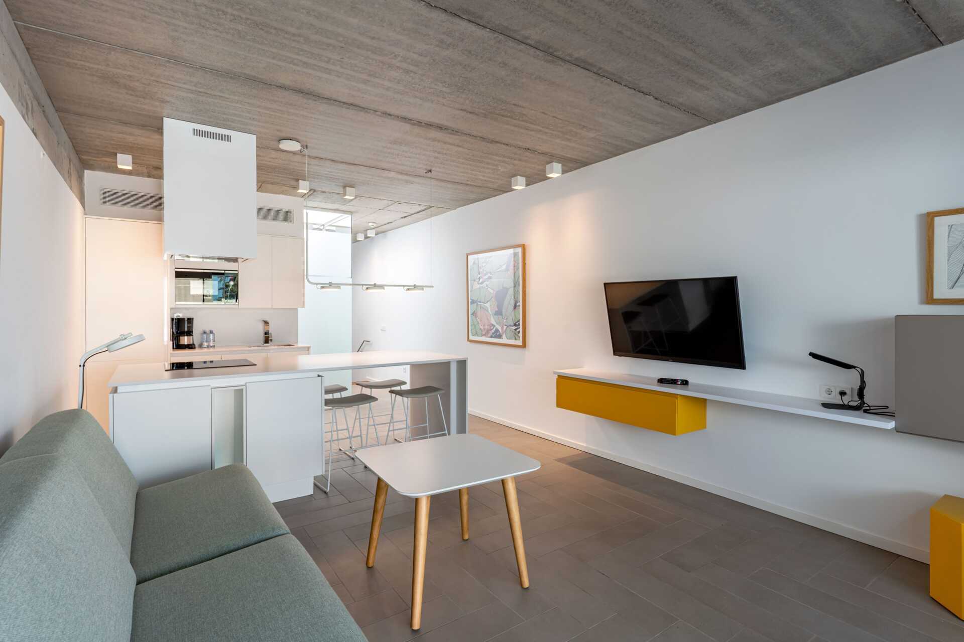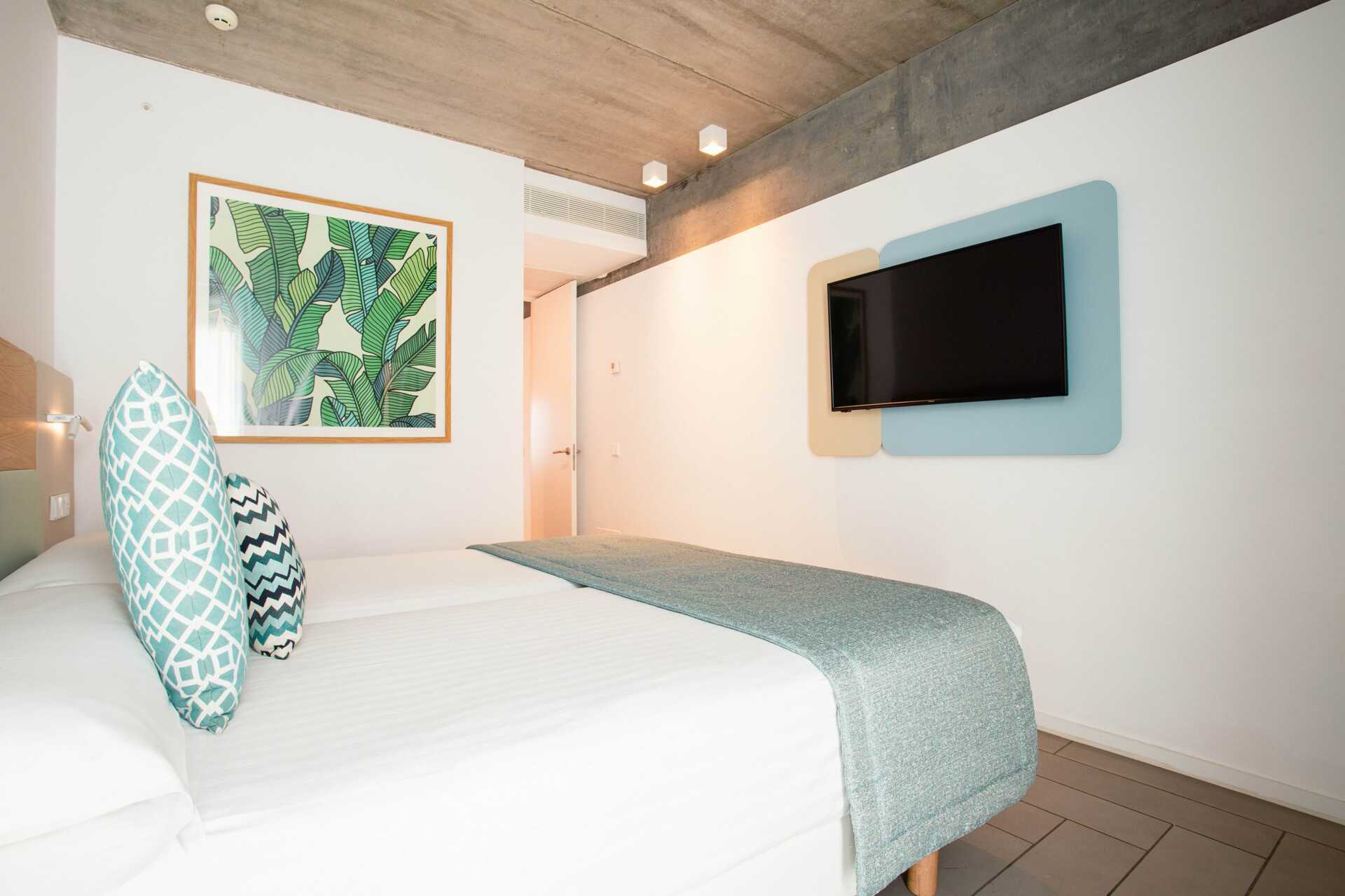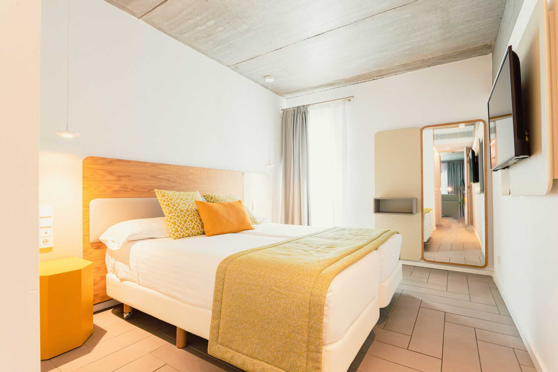 Trerumslägenhet i etage med markterrass. Några lägenheter har en markterrass med bord, stolar samt solstolar och några lägenheter har en markterrass med bord och stolar och en takterrass med solstolar. Lägenheterna kan ligga i huvudbyggnaden eller i en fristående byggnad. Två sovrum och ett kombinerat vardagsrum med minikök. På entréplan finns ett sovrum med två enkelsängar. Möjlighet till extrabäddar i bäddsoffor samt ett minikök med kylskåp, frys, mikrovågsugn, keramisk kokplatta, diskmaskin, brödrost, kaffebryggare, vattenkokare, juicepress, äggkokare samt enkel köksutrustning. Tvättmaskin och torktumlare samt ett badrum med hårtork, dusch och wc. En trappa upp eller en trappa ner – beroende på vart på hotellet lägenheterna ligger, finns ett sovrum med två enkelsängar samt ett badrum med hårtork, dusch och wc. Wifi, luftkonditionering och deponering ingår. Badrockar och poolhanddukar. Städning 7 ggr/vecka.