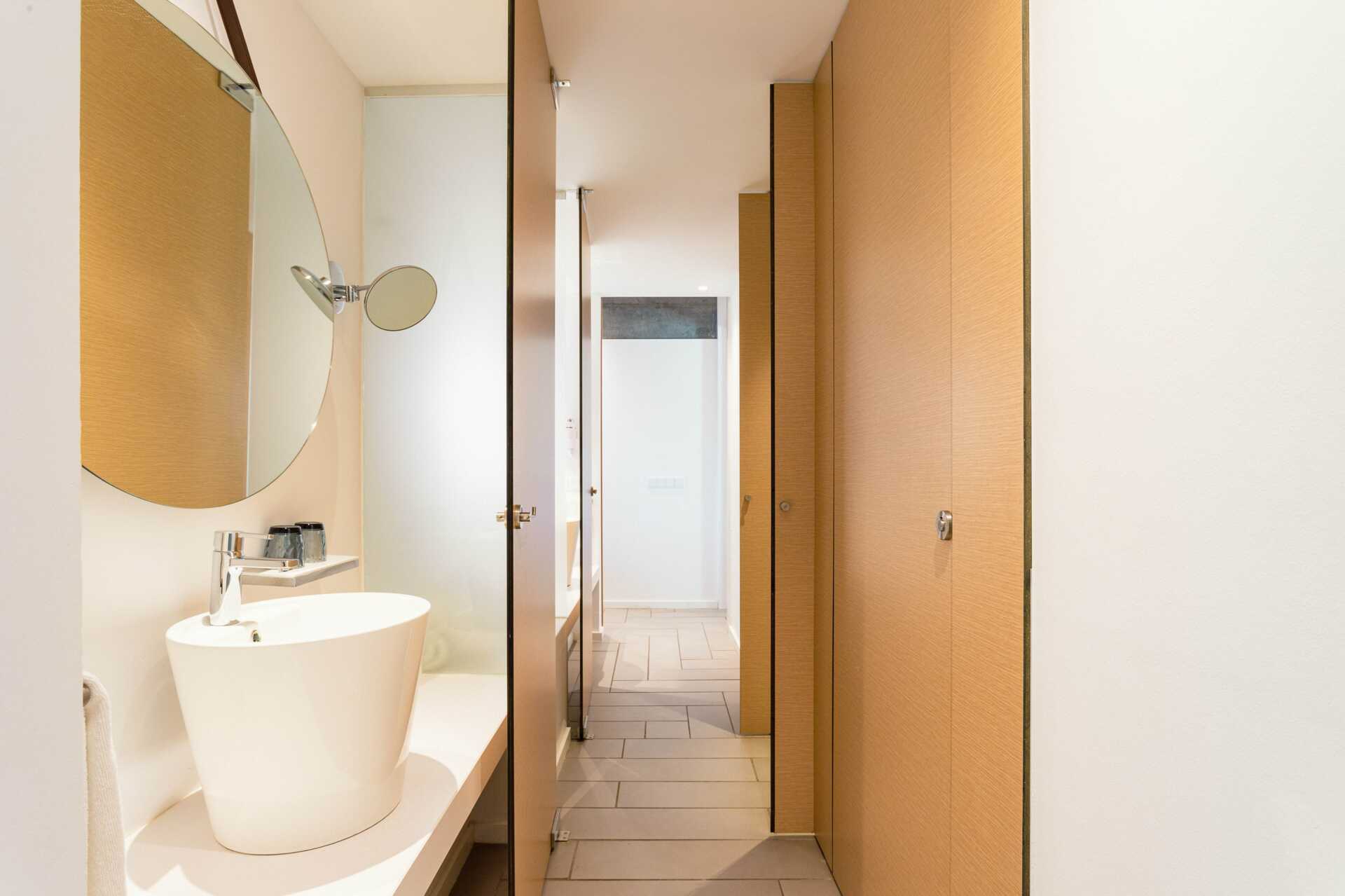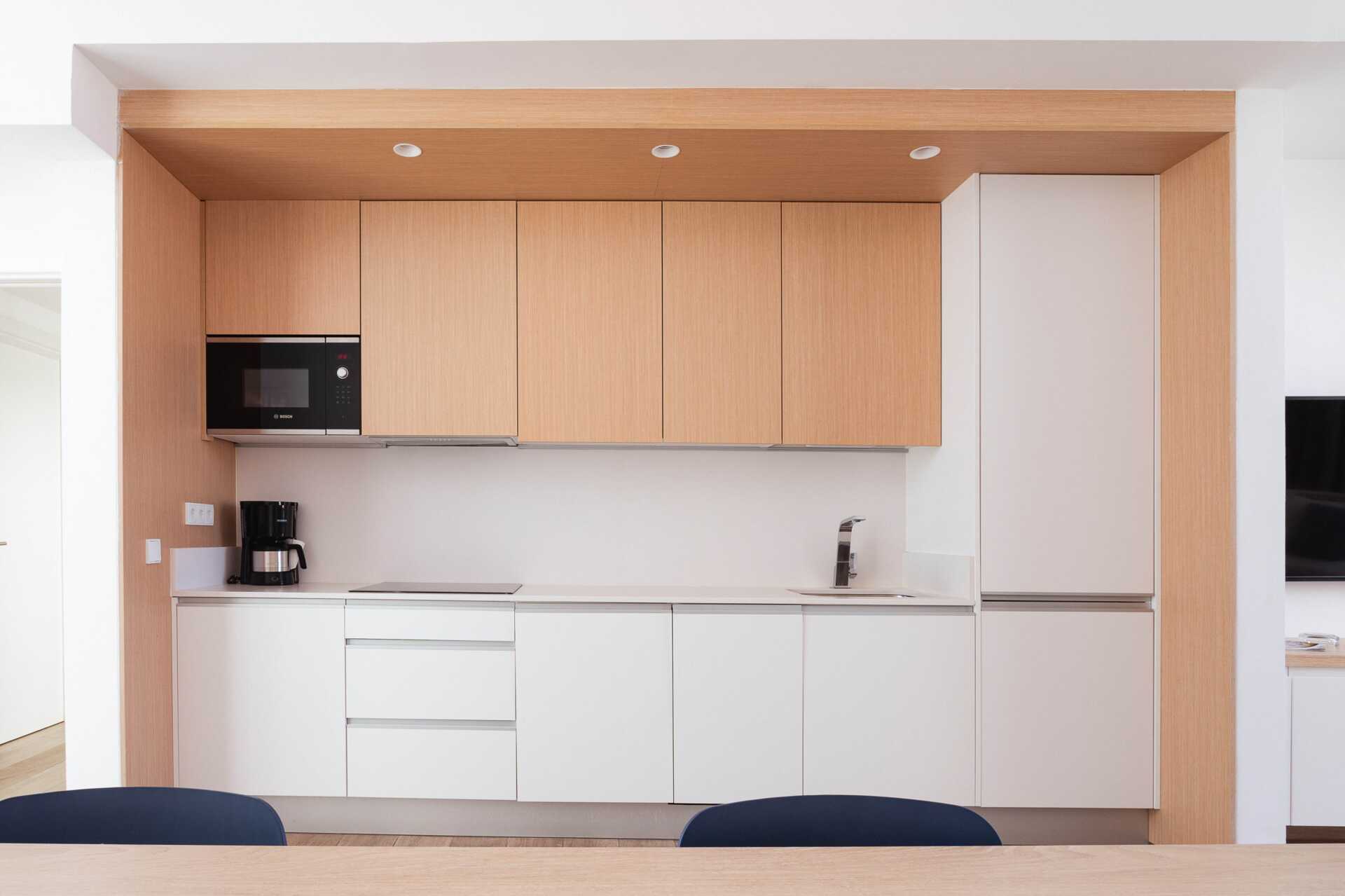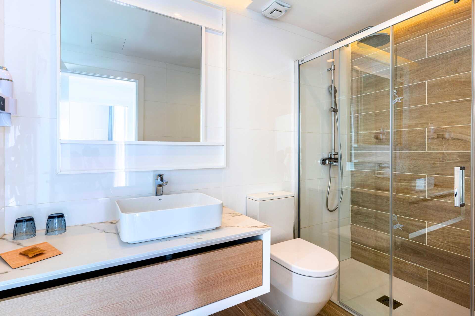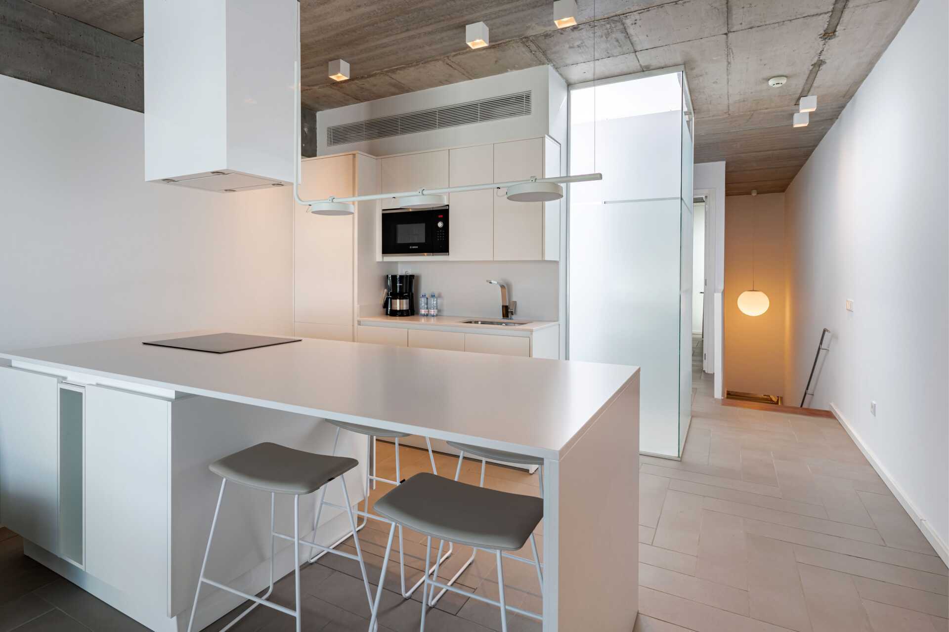 Trerumslägenhet i etage med markterrass. Några lägenheter har en markterrass med bord, stolar samt solstolar och några lägenheter har en markterrass med bord och stolar och en takterrass med solstolar. Lägenheterna kan ligga i huvudbyggnaden eller i en fristående byggnad. Två sovrum och ett kombinerat vardagsrum med minikök. På entréplan finns ett sovrum med två enkelsängar. Möjlighet till extrabäddar i bäddsoffor samt ett minikök med kylskåp, frys, mikrovågsugn, keramisk kokplatta, diskmaskin, brödrost, kaffebryggare, vattenkokare, juicepress, äggkokare samt enkel köksutrustning. Tvättmaskin och torktumlare samt ett badrum med hårtork, dusch och wc. En trappa upp eller en trappa ner – beroende på vart på hotellet lägenheterna ligger, finns ett sovrum med två enkelsängar samt ett badrum med hårtork, dusch och wc. Wifi, luftkonditionering och deponering ingår. Badrockar och poolhanddukar. Städning 7 ggr/vecka.