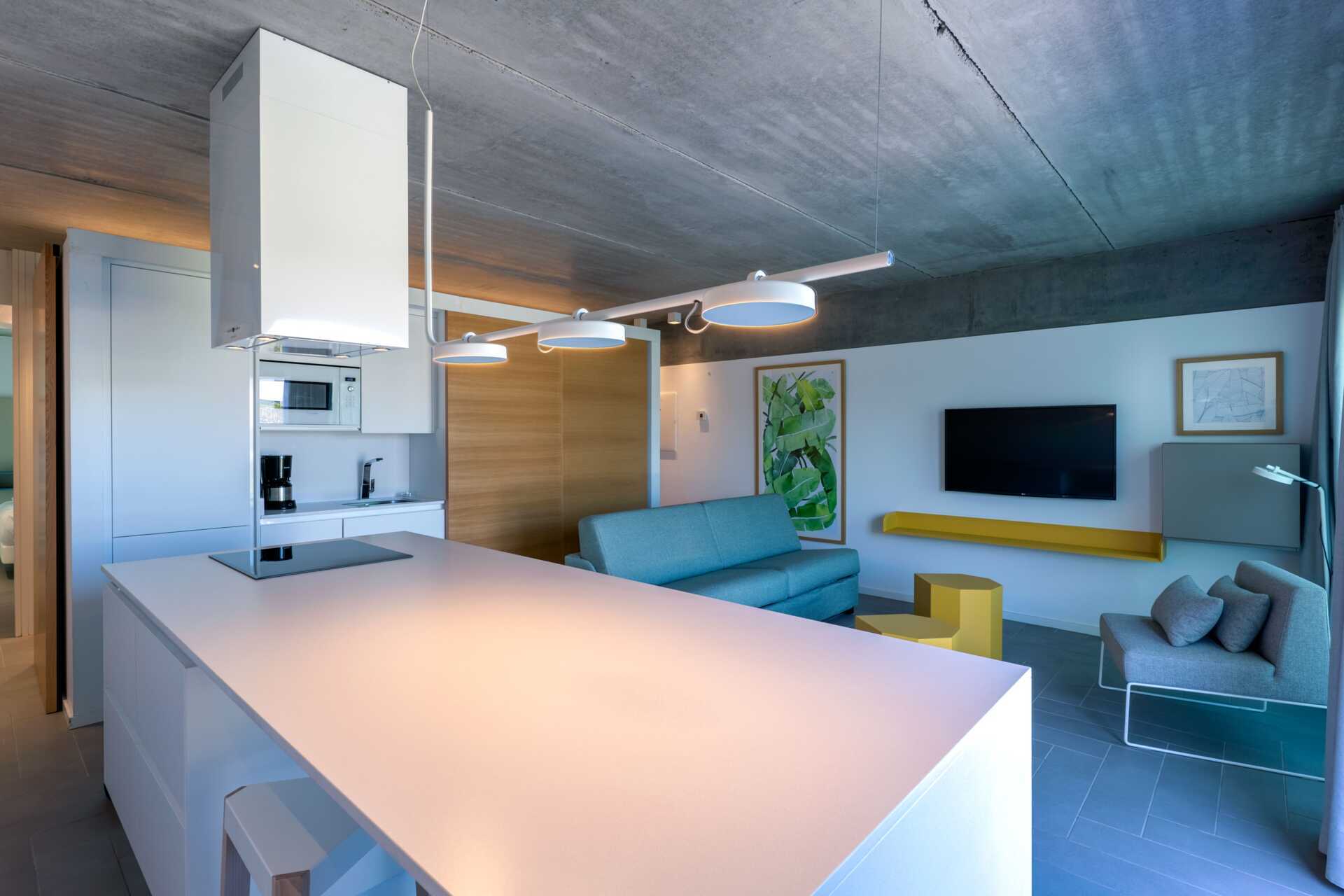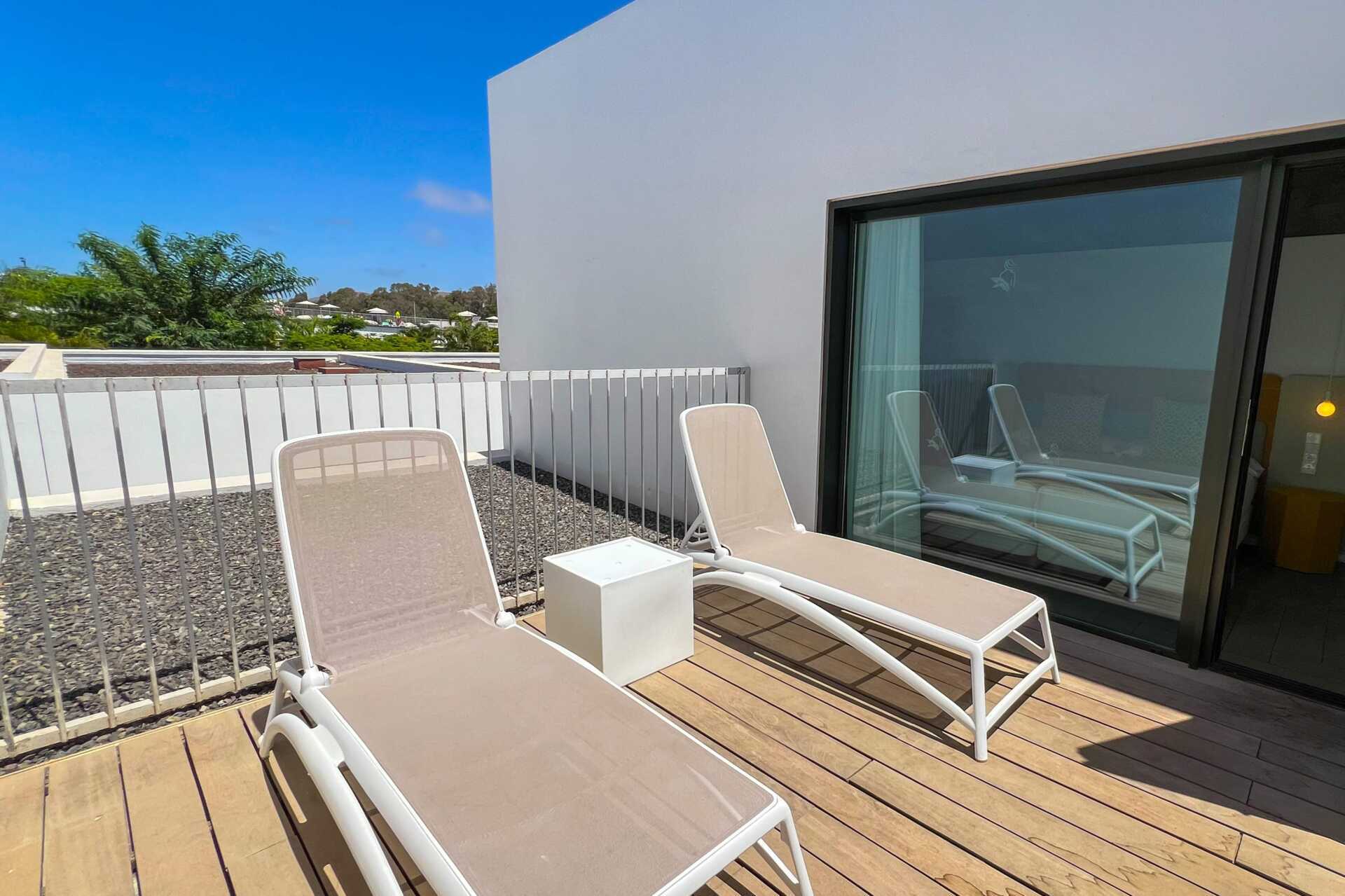 Fyrarumslägenhet med havsutsikt, privat pool på markterrassen och med bästa läge inom hotellet - nära havet. Poolen är uppvärmd vintertid till 22 grader. Pooltemperaturen kan dock sjunka några grader på morgnar, kvällar och vid dåligt väder. På terrassen finns loungesoffor, matplats och solstolar. Tre sovrum och ett kombinerat vardagsrum med minikök. Två enkelsängar varje sovrum. Möjlighet till extrabädd i bäddsoffa. Minikök med kyl, frys, mikrovågsugn, diskmaskin, brödrost, kaffemaskin, vattenkokare, äggkokare och enkel köksutrustning. Wifi, luftkonditionering och deponering ingår. Tv med internationella kanaler. Badrockar. Poolhanddukar. Hårtork. Två badrum med dusch och wc, varav ett med badkar. Städning 7 ggr/vecka.