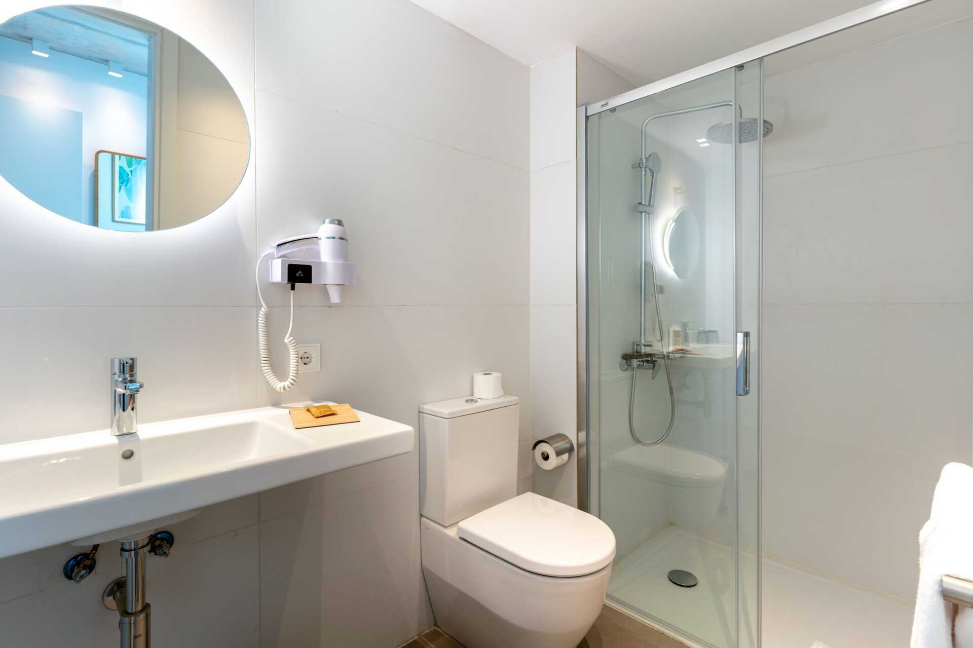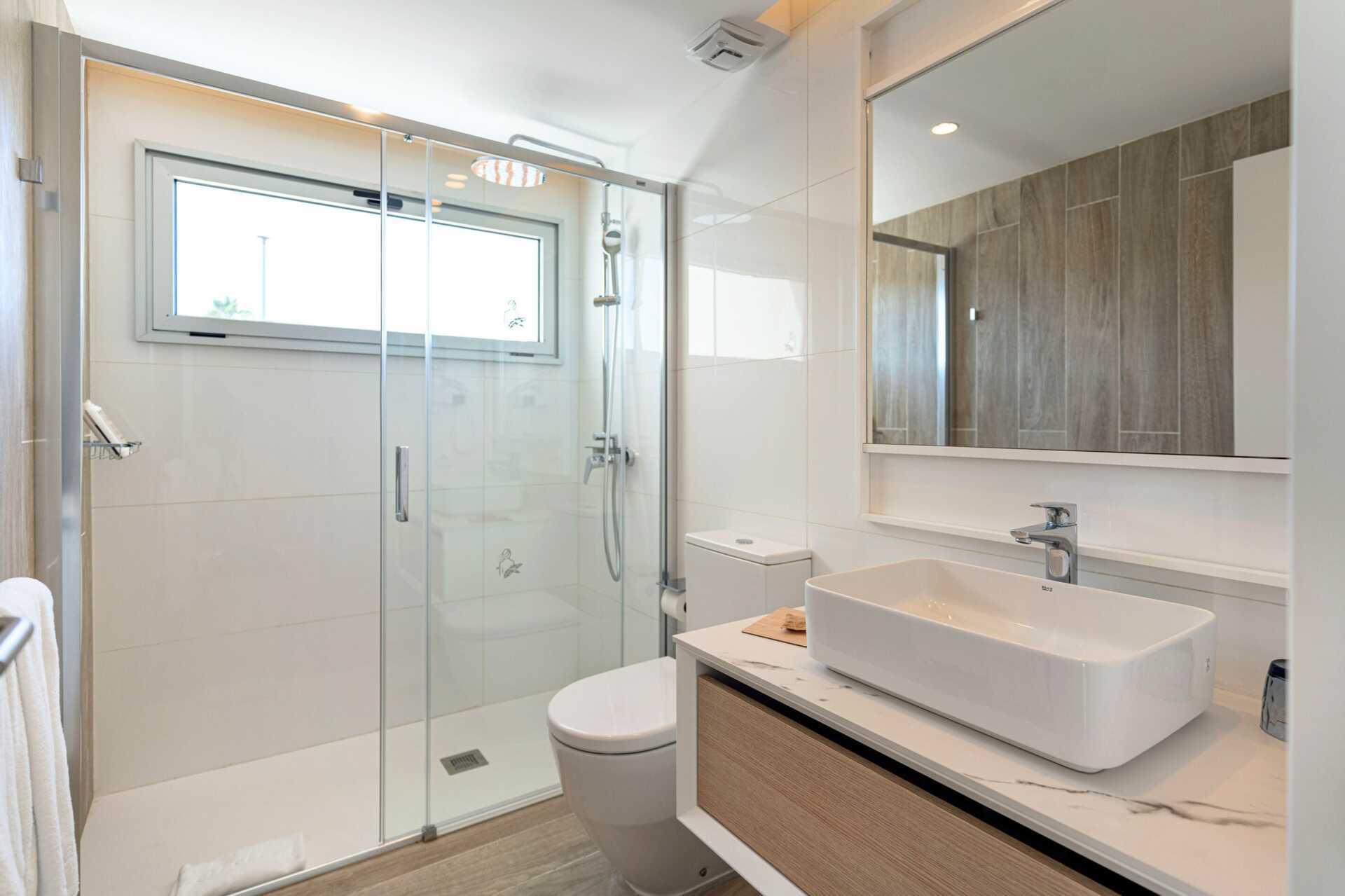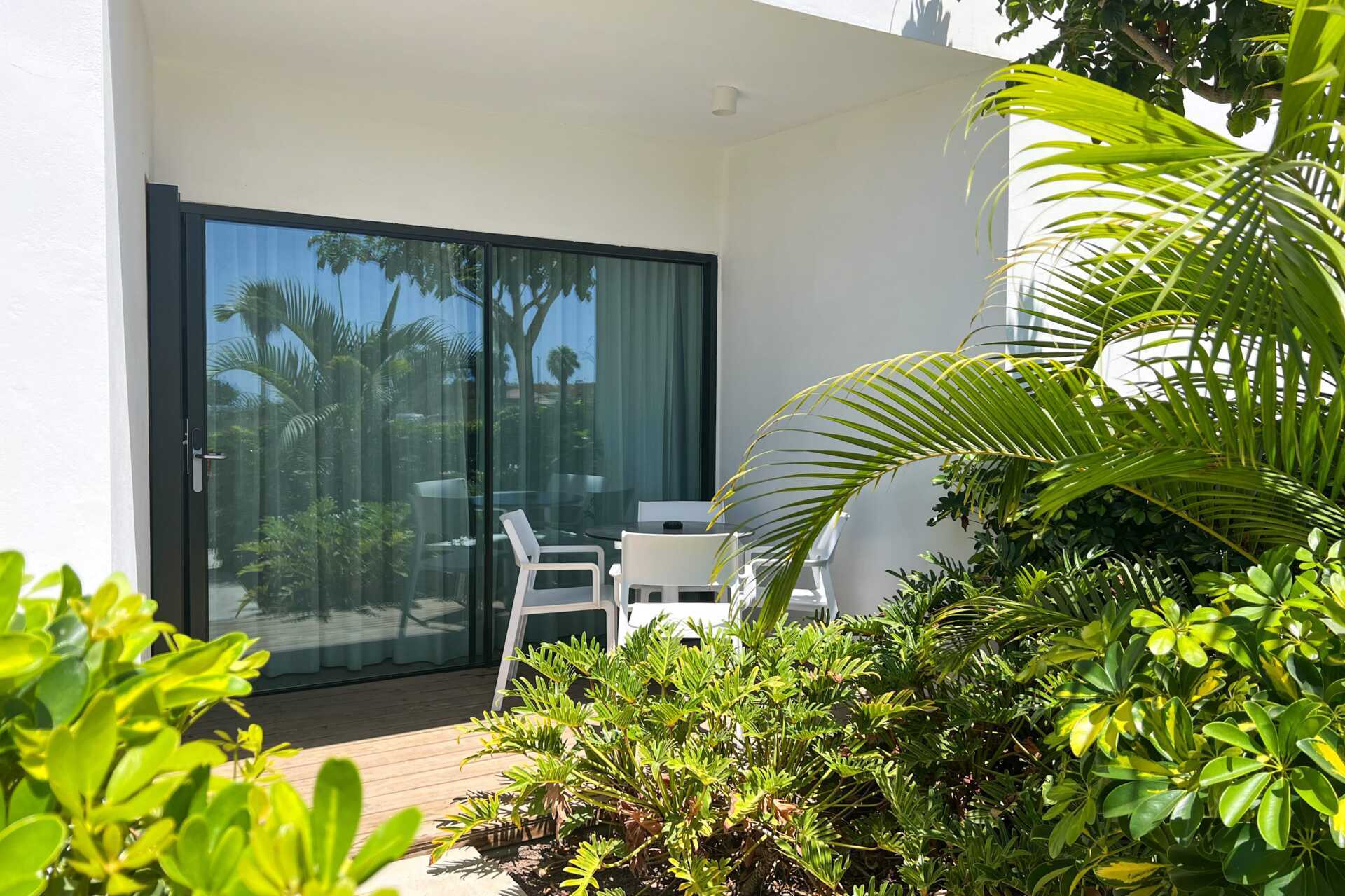 Trerumslägenhet med markterrass. Lägenheterna ligger i huvudbyggnaden. Två sovrum och ett kombinerat vardagsrum med minikök. Två enkelsängar varje sovrum. Minikök med kyl, frys, mikrovågsugn, diskmaskin, brödrost, kaffemaskin, vattenkokare, äggkokare och enkel köksutrustning. Wifi, luftkonditionering och deponering ingår. Tv med internationella kanaler. Badrockar. Poolhanddukar. Hårtork. Badrum med dusch och wc. Städning 7 ggr/vecka.