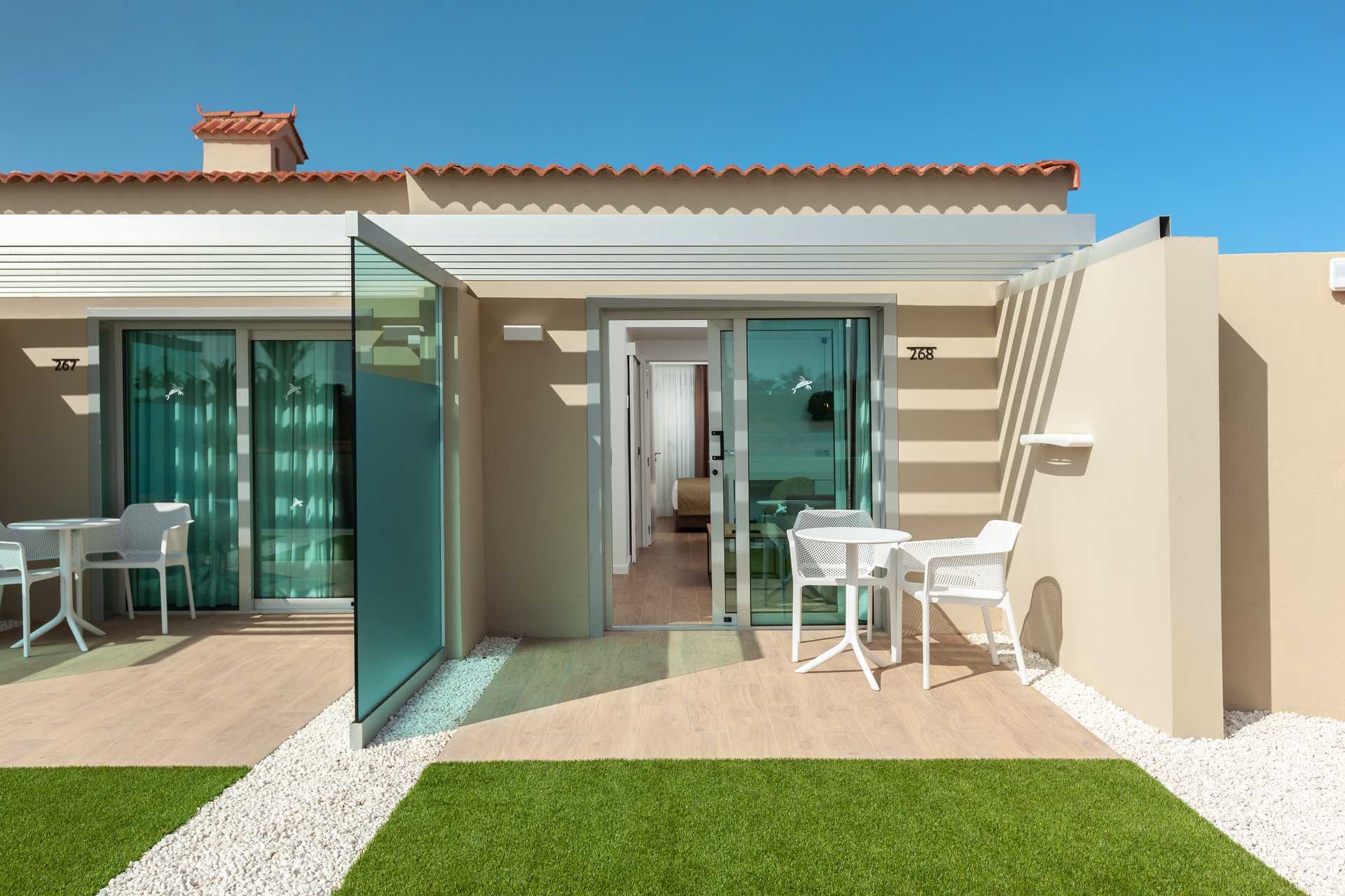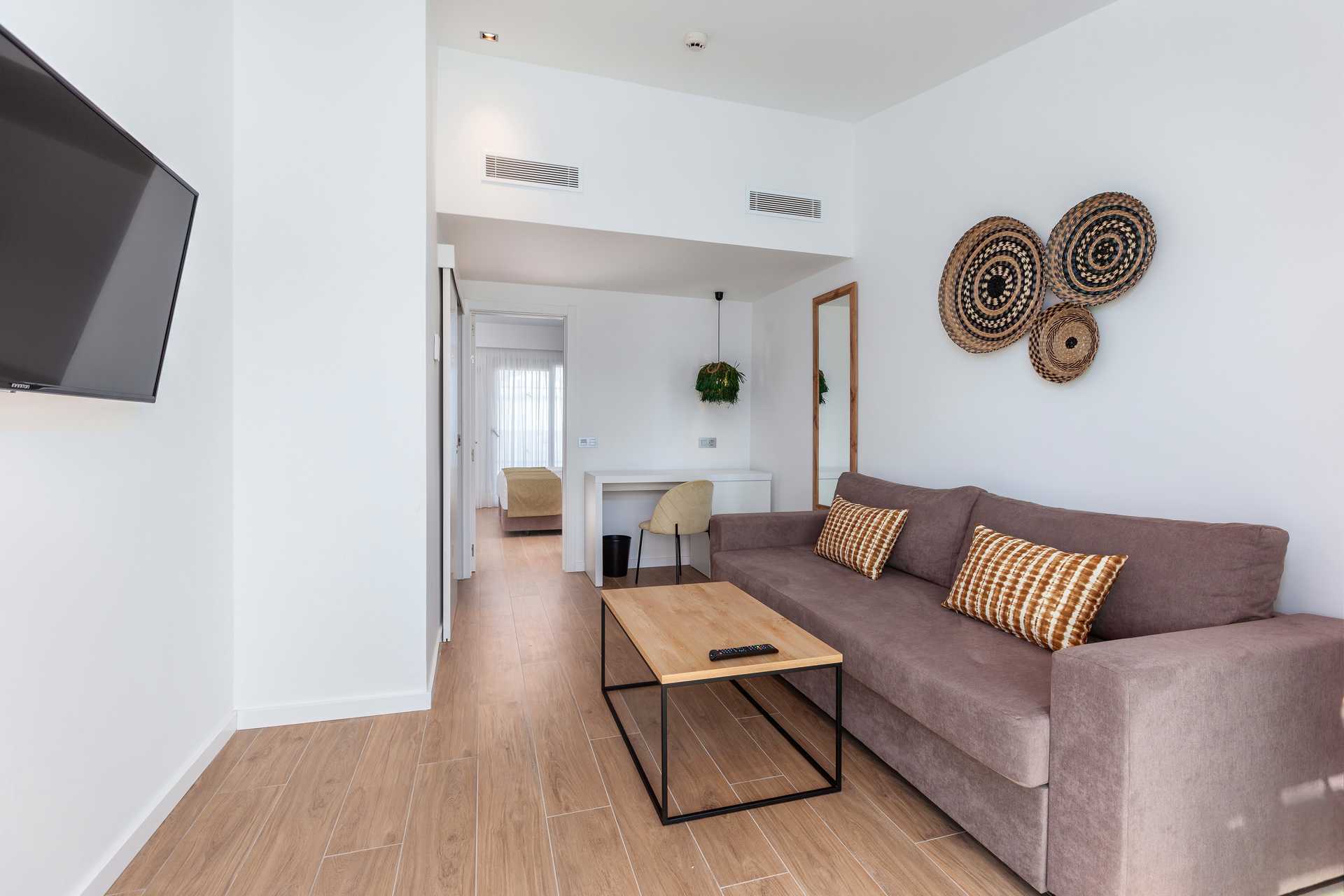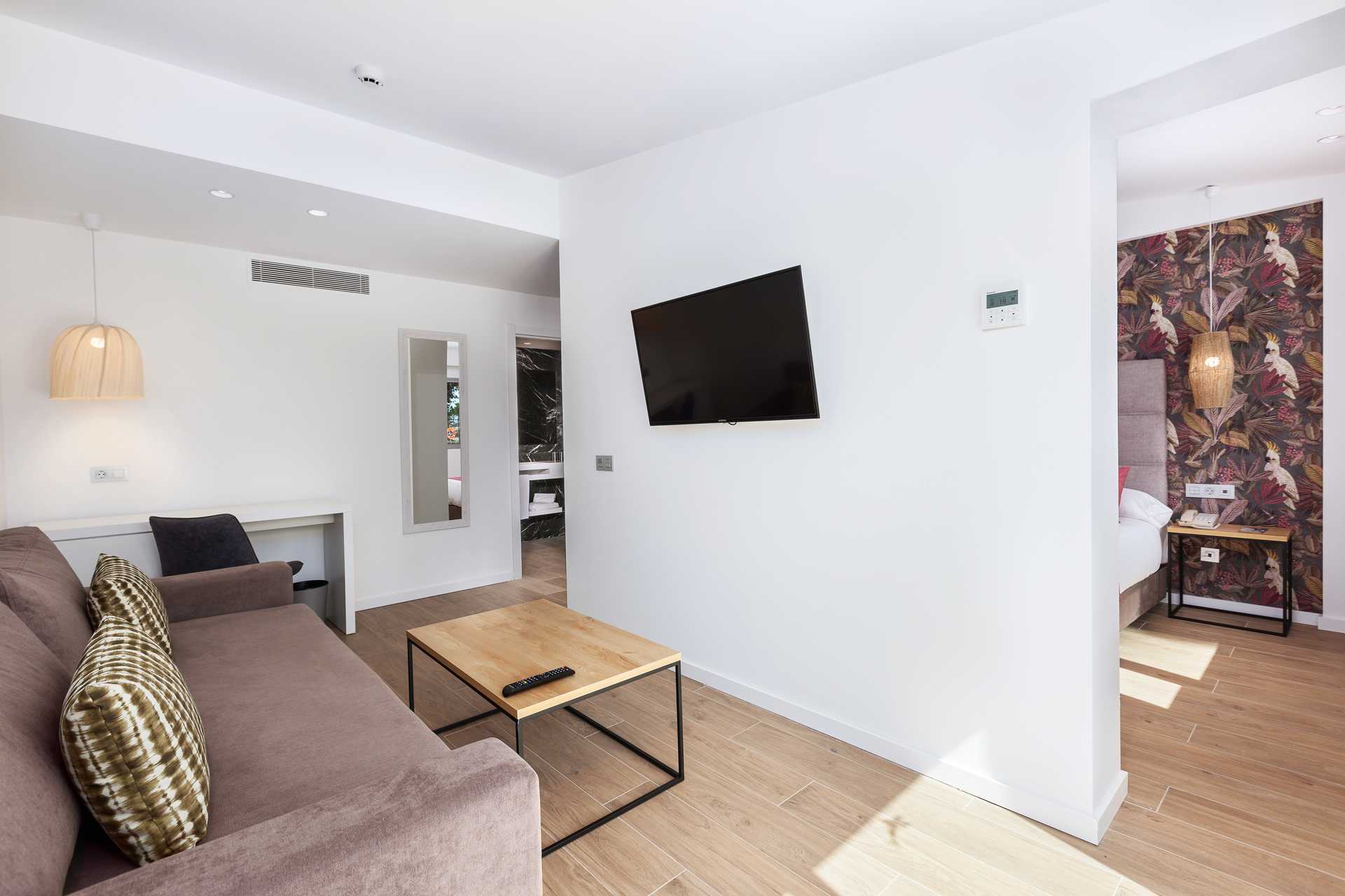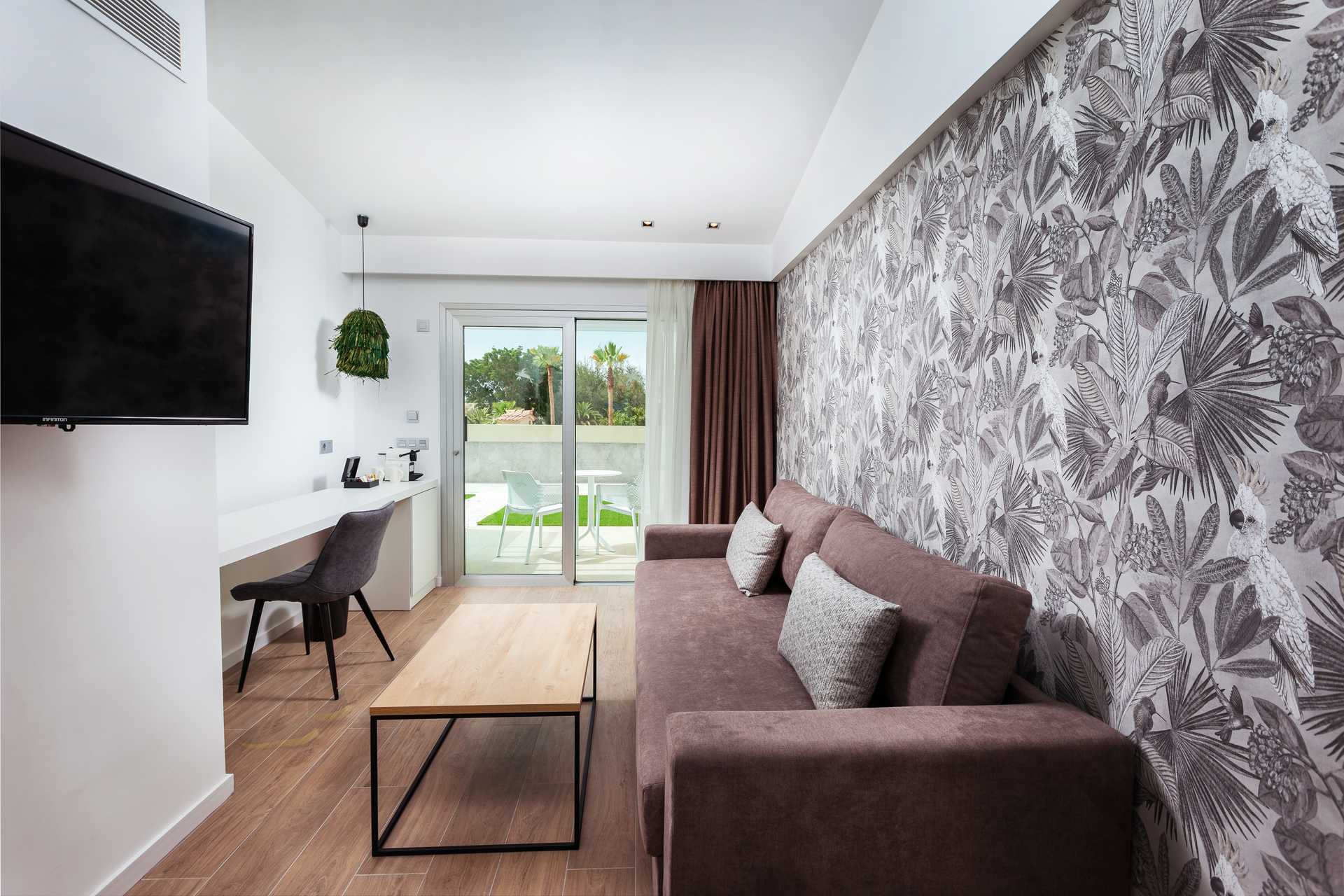 Svit med en stor markterrass med stolar och bord samt utsikt mot poolen. Sviten består av ett sovrum och ett vardagsrum. En dubbelsäng eller två enkelsängar. Möjlighet till extrabädd i bäddsoffa. Wifi och luftkonditionering ingår. Deponering mot avgift. Minibar mot avgift. Nespresso kaffemaskin. Tv med internationella kanaler. Hårtork. Badrum med dusch och wc. Städning 7 ggr/vecka. Barn under två år räknas in i maxantalet personer i rummet.