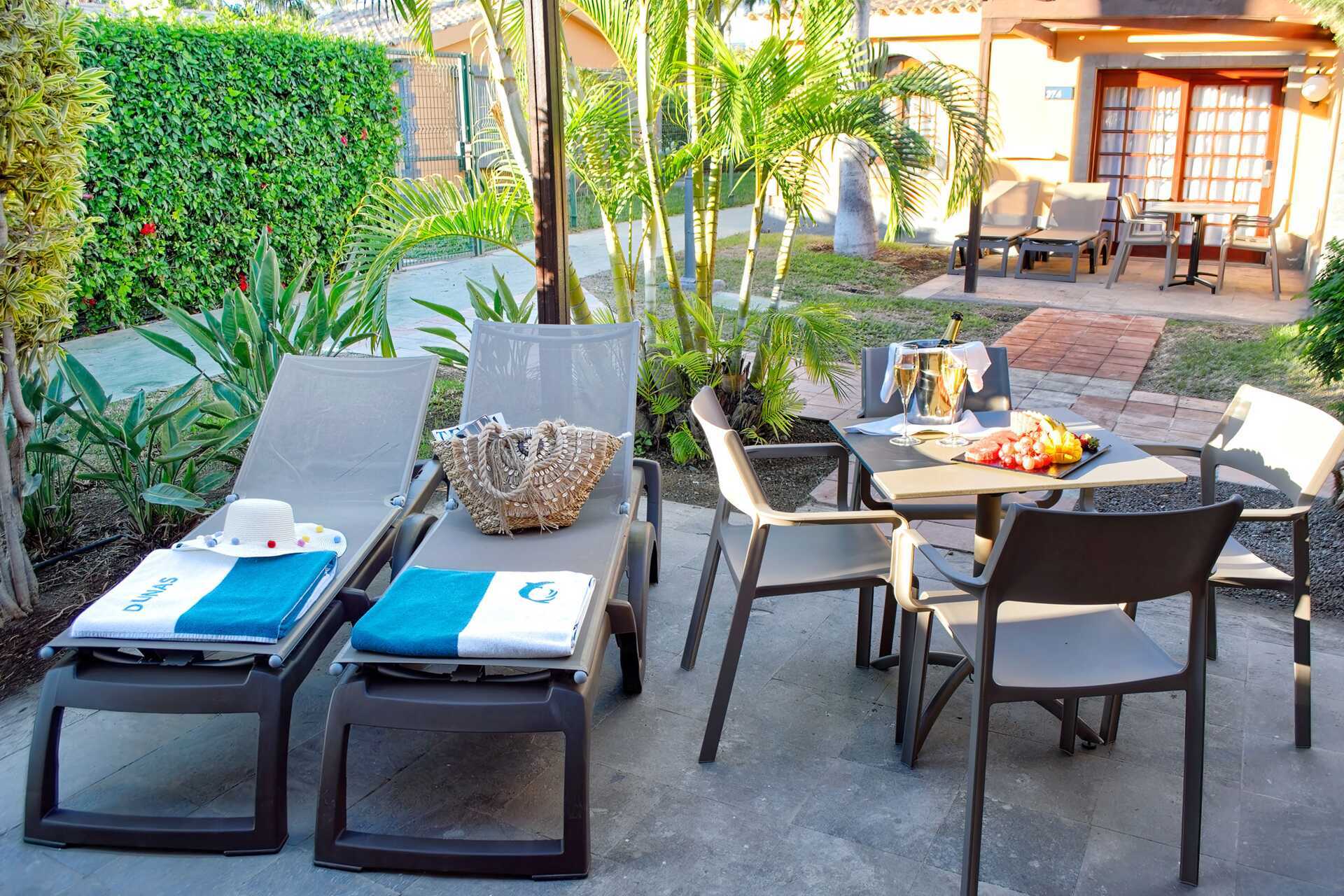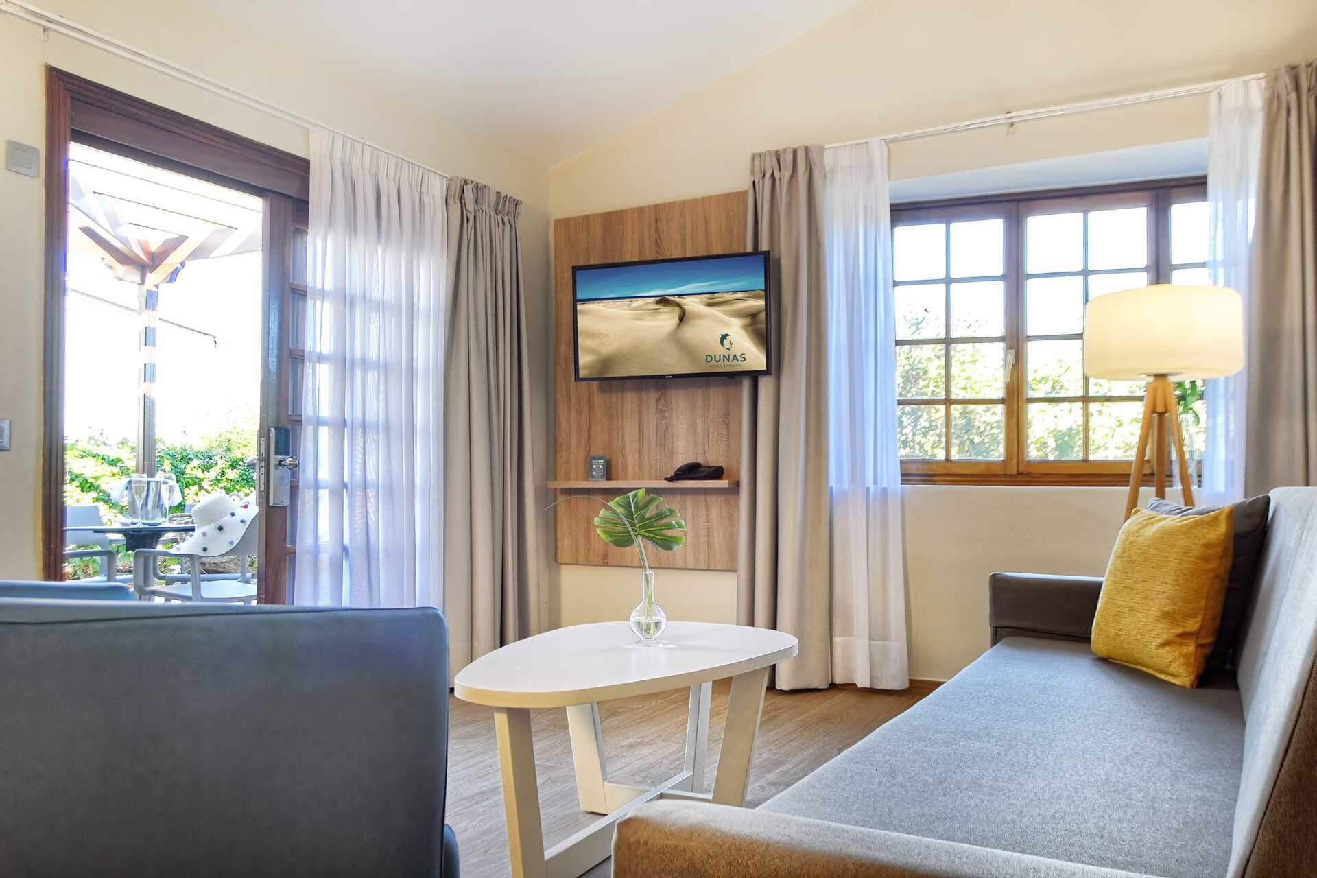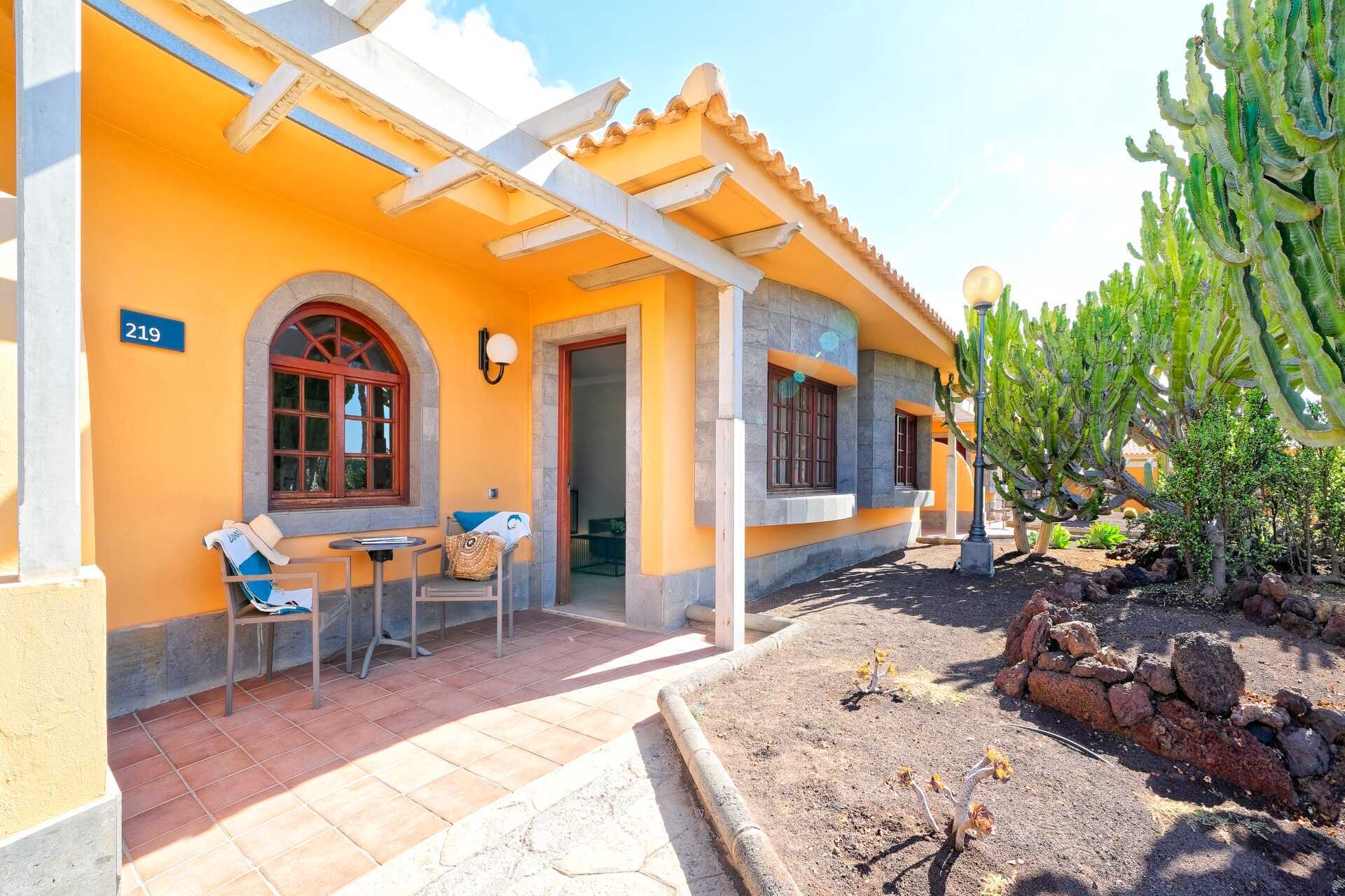 Tvårumsvilla med markterrass. På terrassen finns två solstolar samt matplats. Ett sovrum och ett vardagsrum. Två enkelsängar. Möjlighet till extrabädd i bäddsoffa. Wifi, luftkonditionering och deponering ingår. Minibar ingår med vatten och alkoholfria drycker vid ankomst. Vattenkokare samt kaffe och te. Tv med internationella kanaler. Badrockar och tofflor. Hårtork. Badrum med två handfat, dusch och wc. Städning 7 ggr/vecka.
