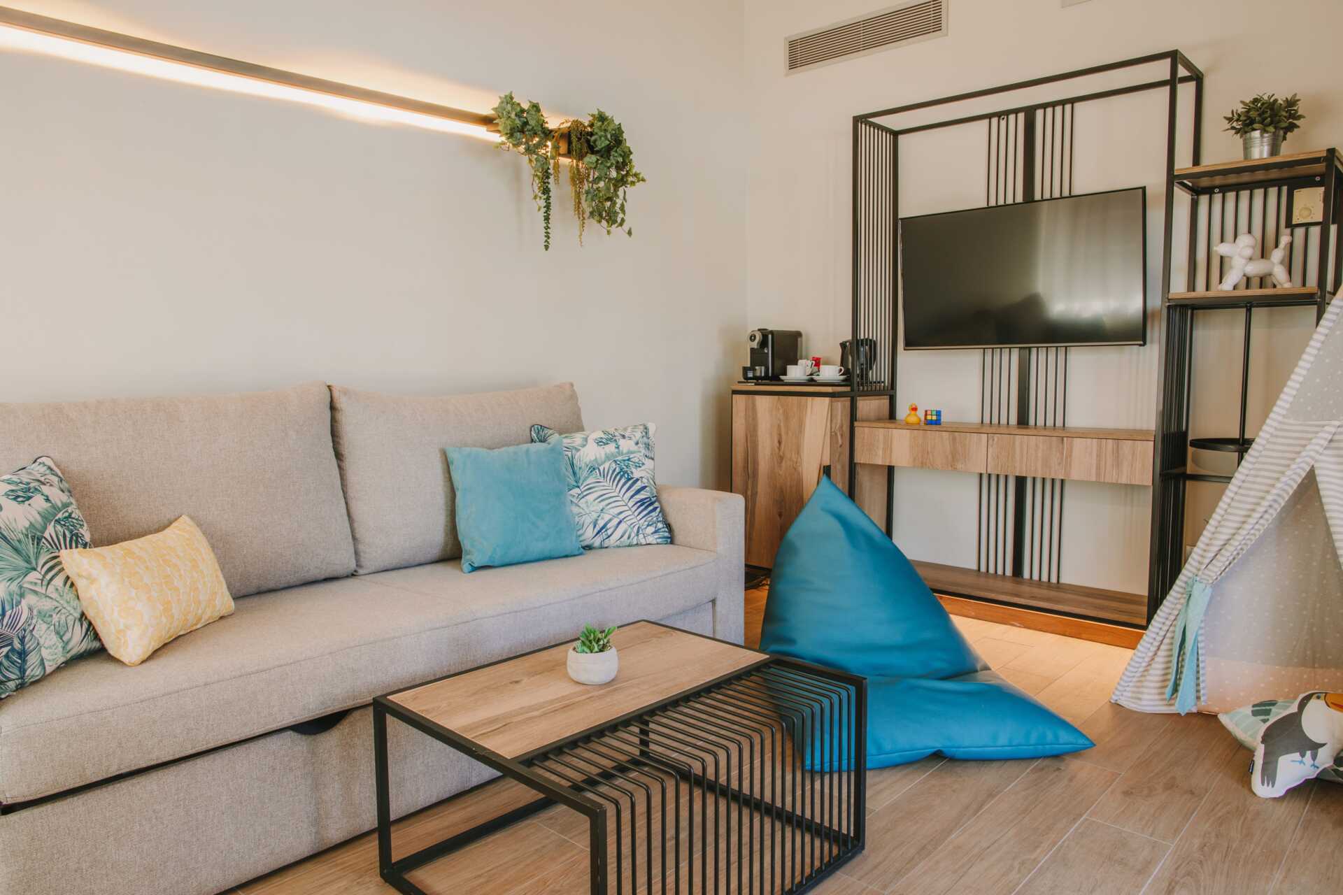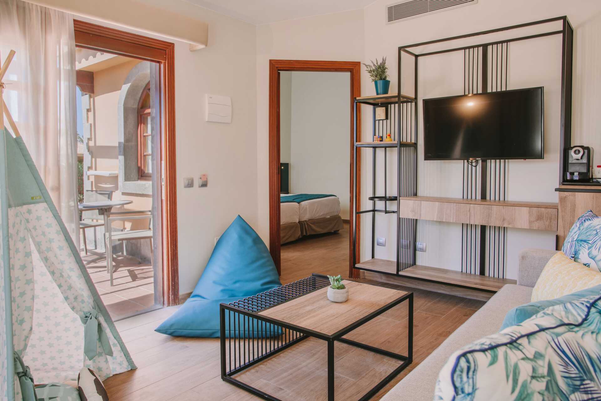 Familjesvit med markterrass, vissa med poolutsikt. Två solstolar på terrassen. Sviten består av ett sovrum och ett vardagsrum. Sviten är utrustad med en saccosäck och indiantält. Två enkelsängar. Möjlighet till extrabäddar i en bäddsoffa. Wifi och luftkonditionering ingår. Deponering mot avgift. Minibar med alkoholfria drycker. Vattenkokare samt kaffe och te. Tv med internationella kanaler. Hårtork. Badrum med dusch och wc. Städning 7 ggr/vecka.