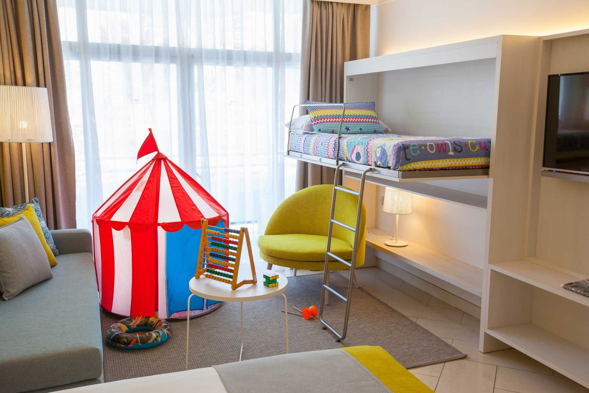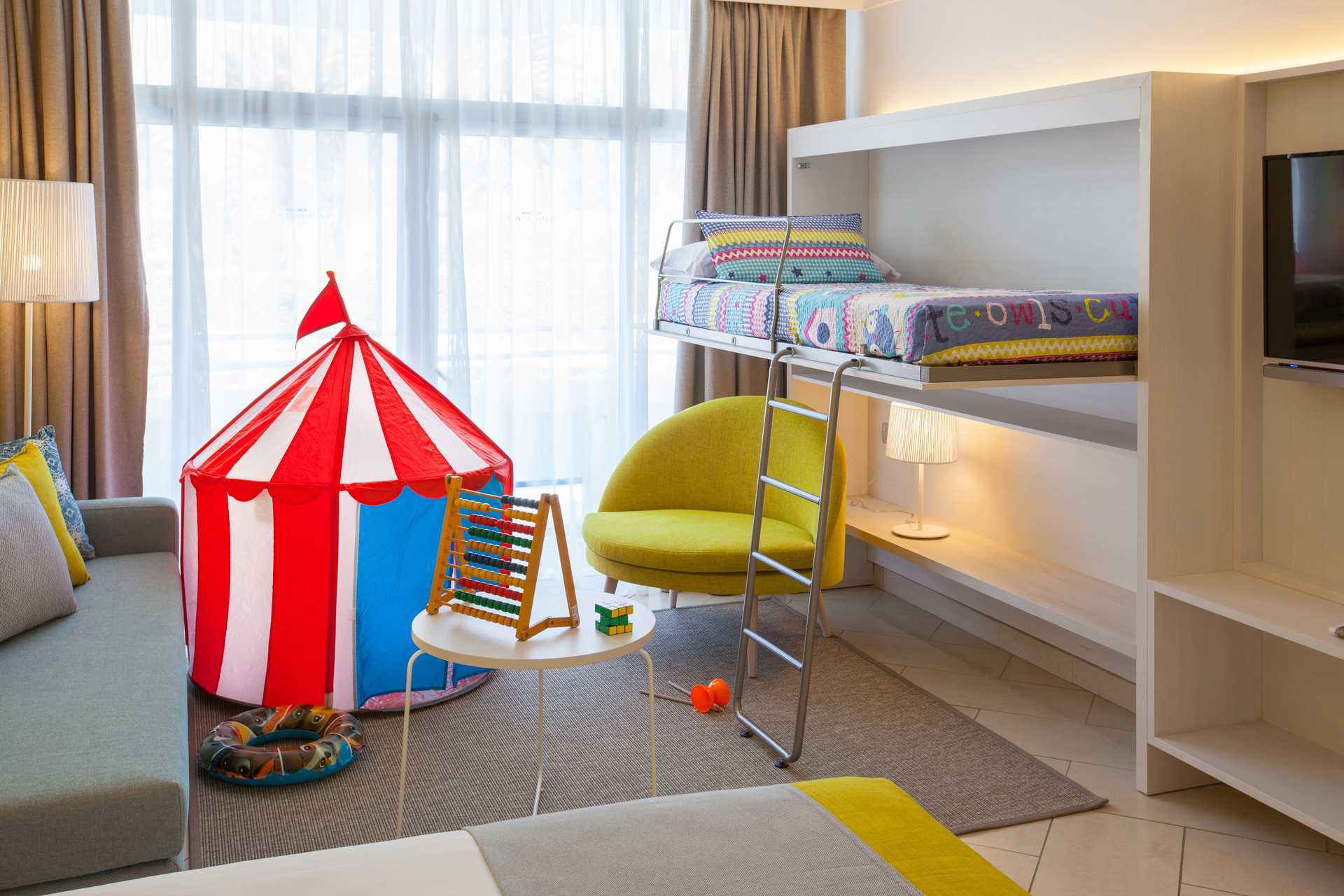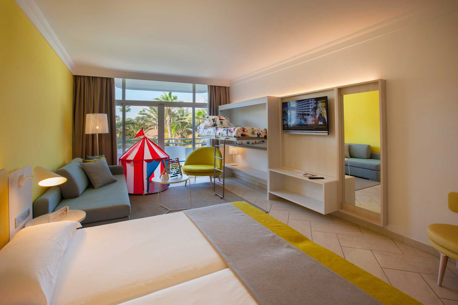 Familjerum med uteplats och poolaccess direkt till en barnpool. På uteplatsen finns bord och stolar samt solstolar. Två enkelsängar. Möjlighet till extrabäddar i bäddsoffa eller i våningssäng. Centralstyrd luftkonditionering ingår sommartid och vid behov vintertid. Wifi ingår. Deponering mot avgift. Minibar mot avgift. Vattenkokare samt kaffe och te. En stor flaska vatten finns i rummet vid ankomst. Tv med internationella kanaler. Hårtork. Badrum med dusch och wc. Städning 7 ggr/vecka. Barn under två år räknas in i max antal personer i rummet.
