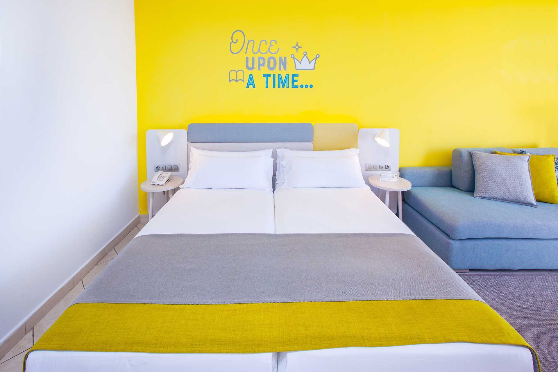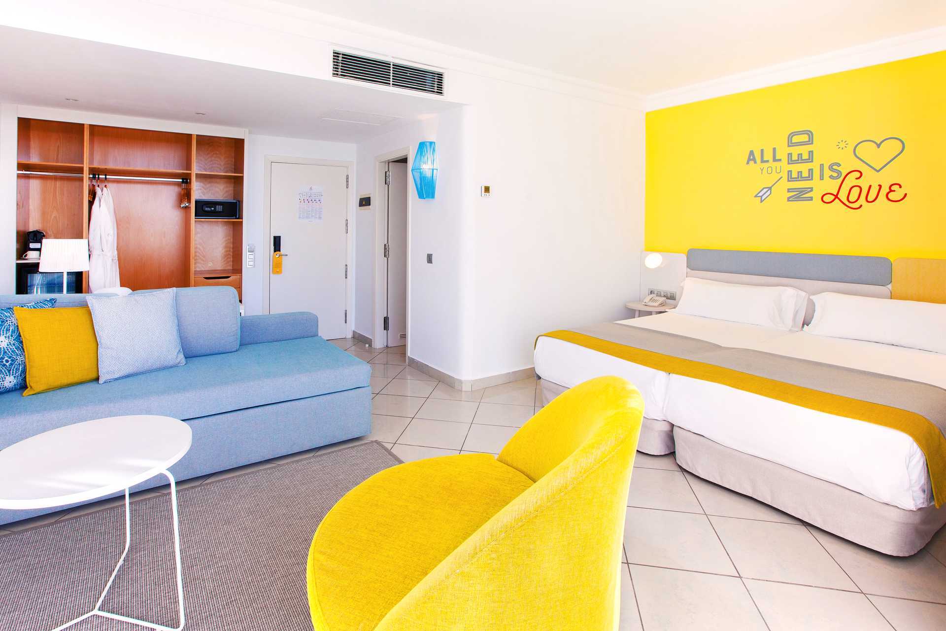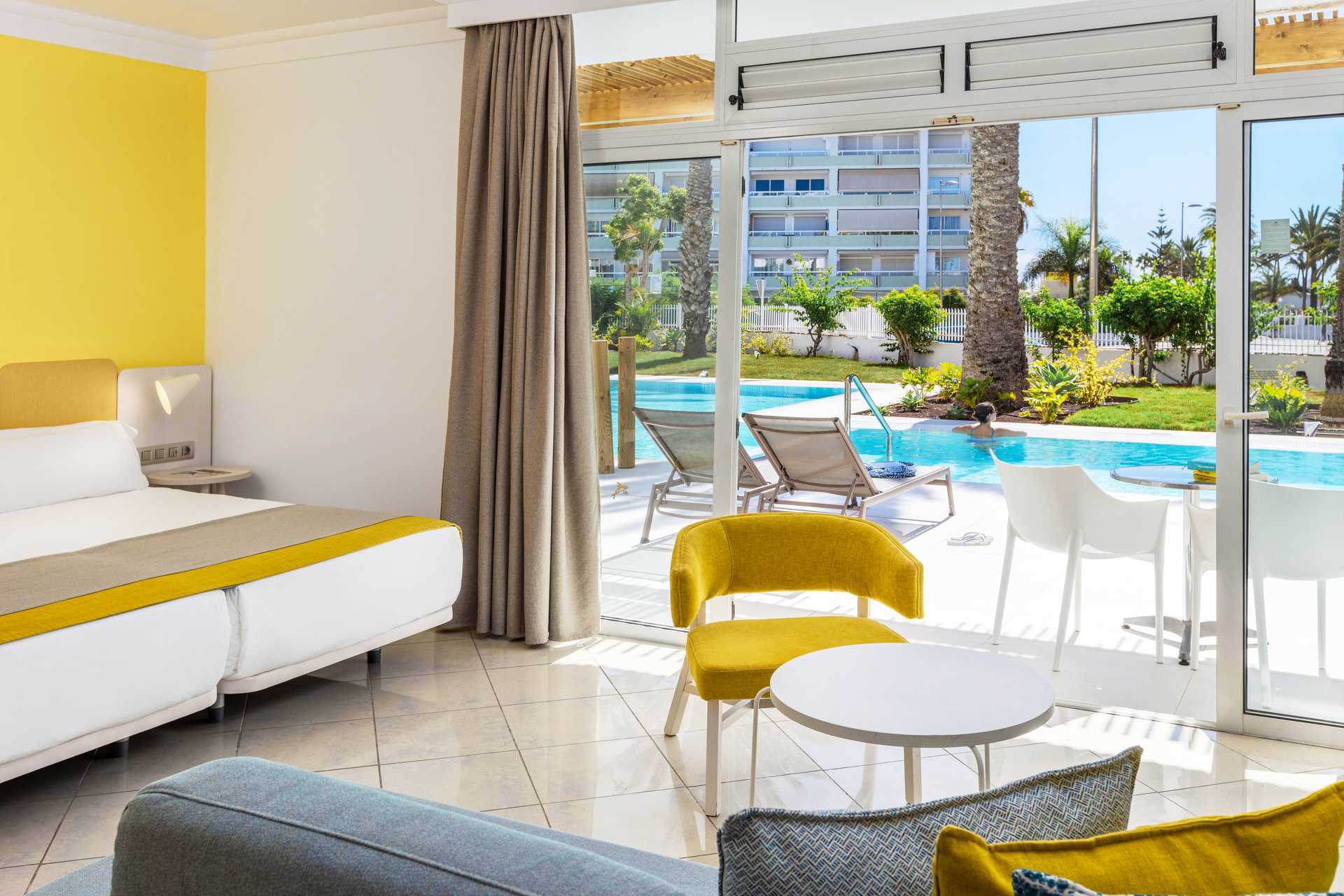 Familjerum med uteplats och poolaccess direkt till en barnpool. På uteplatsen finns bord och stolar samt solstolar. Två enkelsängar. Möjlighet till extrabäddar i bäddsoffa eller i våningssäng. Centralstyrd luftkonditionering ingår sommartid och vid behov vintertid. Wifi ingår. Deponering mot avgift. Minibar mot avgift. Vattenkokare samt kaffe och te. En stor flaska vatten finns i rummet vid ankomst. Tv med internationella kanaler. Hårtork. Badrum med dusch och wc. Städning 7 ggr/vecka. Barn under två år räknas in i max antal personer i rummet.